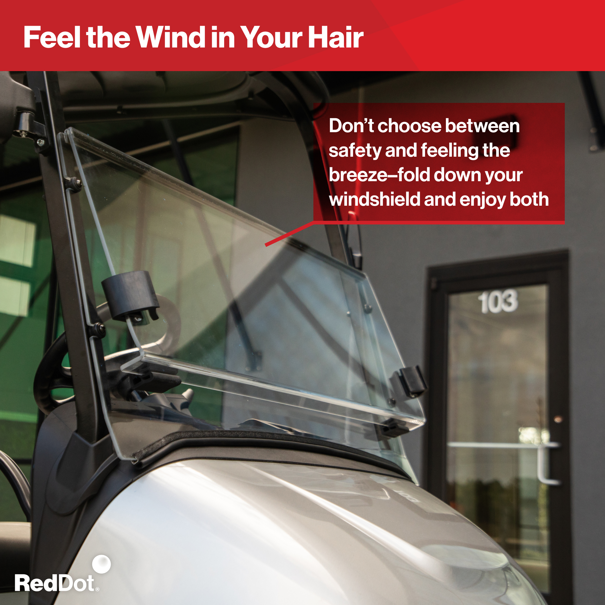 The RedDot folding windshield for DACH Apollo golf carts offers durable protection from wind and debris while giving your customer the flexibility to adjust airflow.