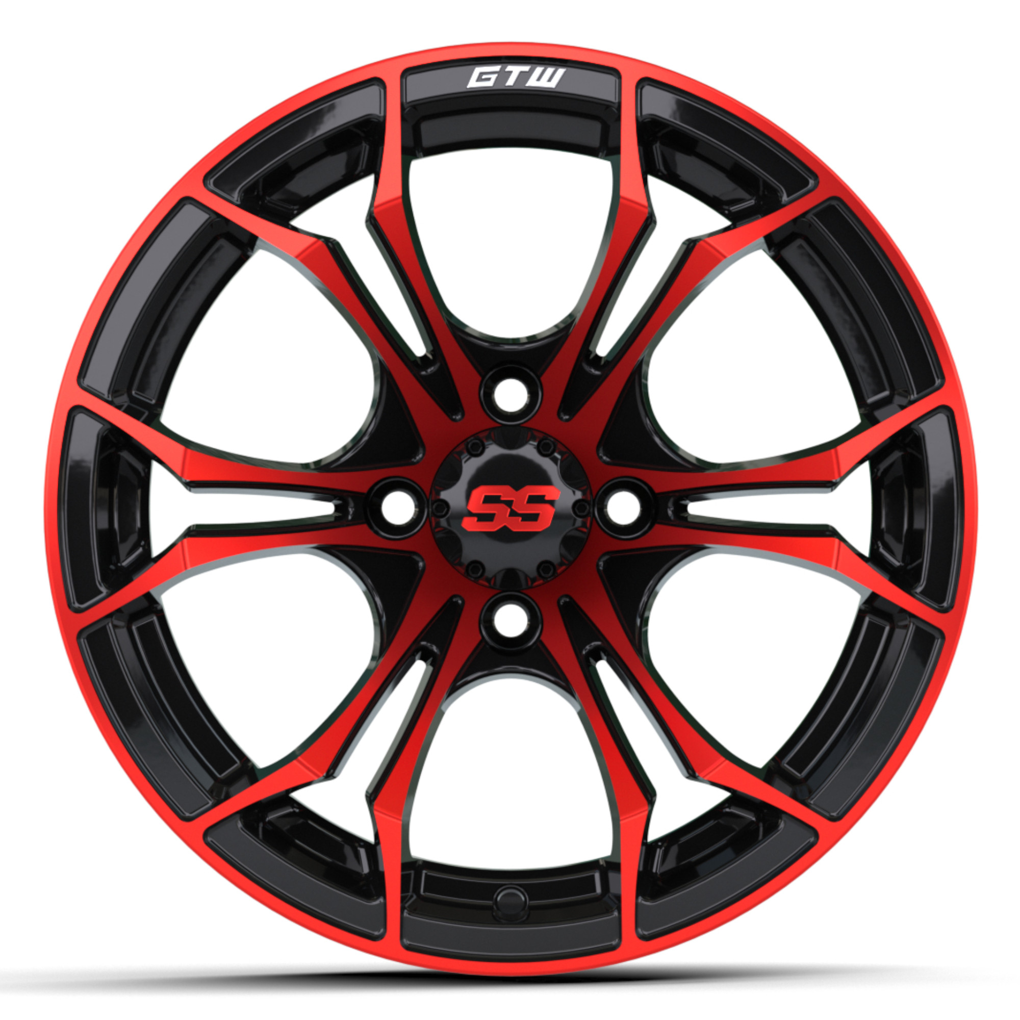 The latest Spyder wheel in the GTW® line can be clearly distinguished from the many other golf car wheels on the market. The Spyder is a GTW® Exclusive design and features a sharp Y-spoke design with red, blue or machined accents, striking sharp angles, deep concave profile, and dynamically-chamfered outer edge.