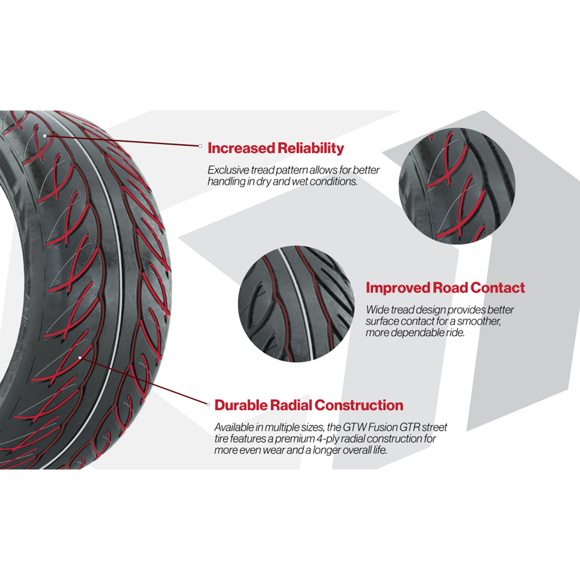 product 215/40-R12 GTW® Fusion GTR Steel Belted Street TireItem # 20-053Premium GTW® GTR Steel Belted Radial tire.Tread Classification:High-Performance StreetTire Specifications:215/40-R12 Steel Belted RadialGTW® Fusion GTR Steel Belted Radial TireSmooth ride and low road noisePremium rubber compound and radial steel belted radial constructionUp to two times the durability and longevityIntegrated tread wear indicatorsNo Lift Kit Required / Tire is approx. 19" tallPlease note that this does not include the wheel Find A Dealer