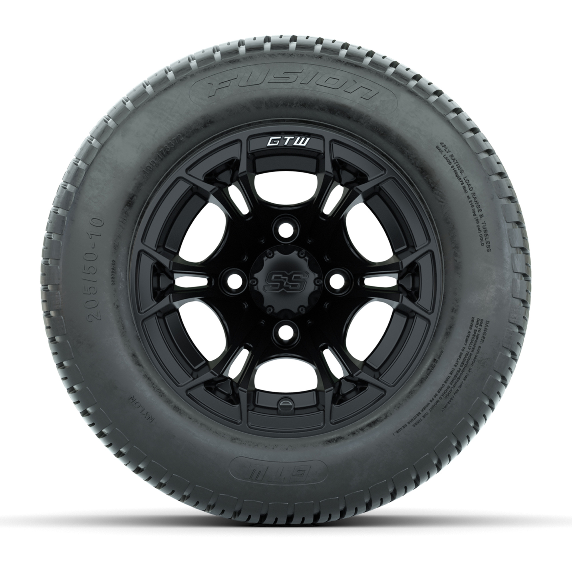 product GTW Spyder Matte Black 10 in Wheels with 205/50-10 Fusion Street Tires – Full SetItem # A19-1087A set of (4) 10-inch GTW® Spyder Matte Black golf cart wheels Mounted on 205/50-10 Fusion Street TiresTread Classification:Street / Golf CourseFull Tire & Wheel Combo Includes:(4) 10x7 GTW Spyder Wheels / Matte Black finish / Offset: 3:4 (ET -.25)(4) 205/50-10 GTW Fusion Street Tires / Tire is approx. 18” tall (4-Ply)(4) Center capsPlease Note: All Wheels are 4 on 4 Hole / Lug Pattern unless otherwise specified.Tech Tips:No Lift Kit Required (Tire is approx. 18” OD)Please Check and Adjust PSI in Tires Before Operation (Recommended Inflation Can Be Found on Sidewall of Tire)Tire & Wheel Combos are mounted and Inflated Before Shipping, Free of ChargeAll Wheels Have a lug pattern of "4x101.6mm"Lug Nuts Sold Separately:Standard Chrome Lug Nuts #LUG4SMetric Chrome Lug Nuts #LUG4M (Yamaha Models) Find A Dealer