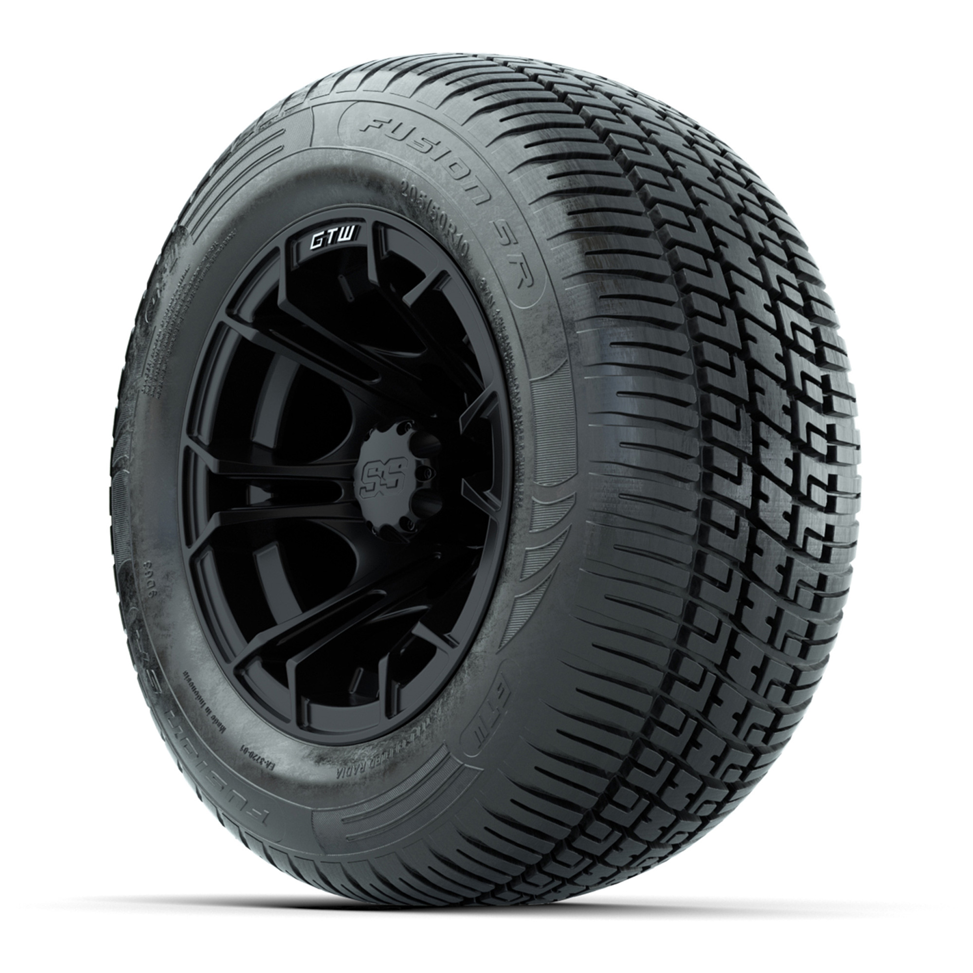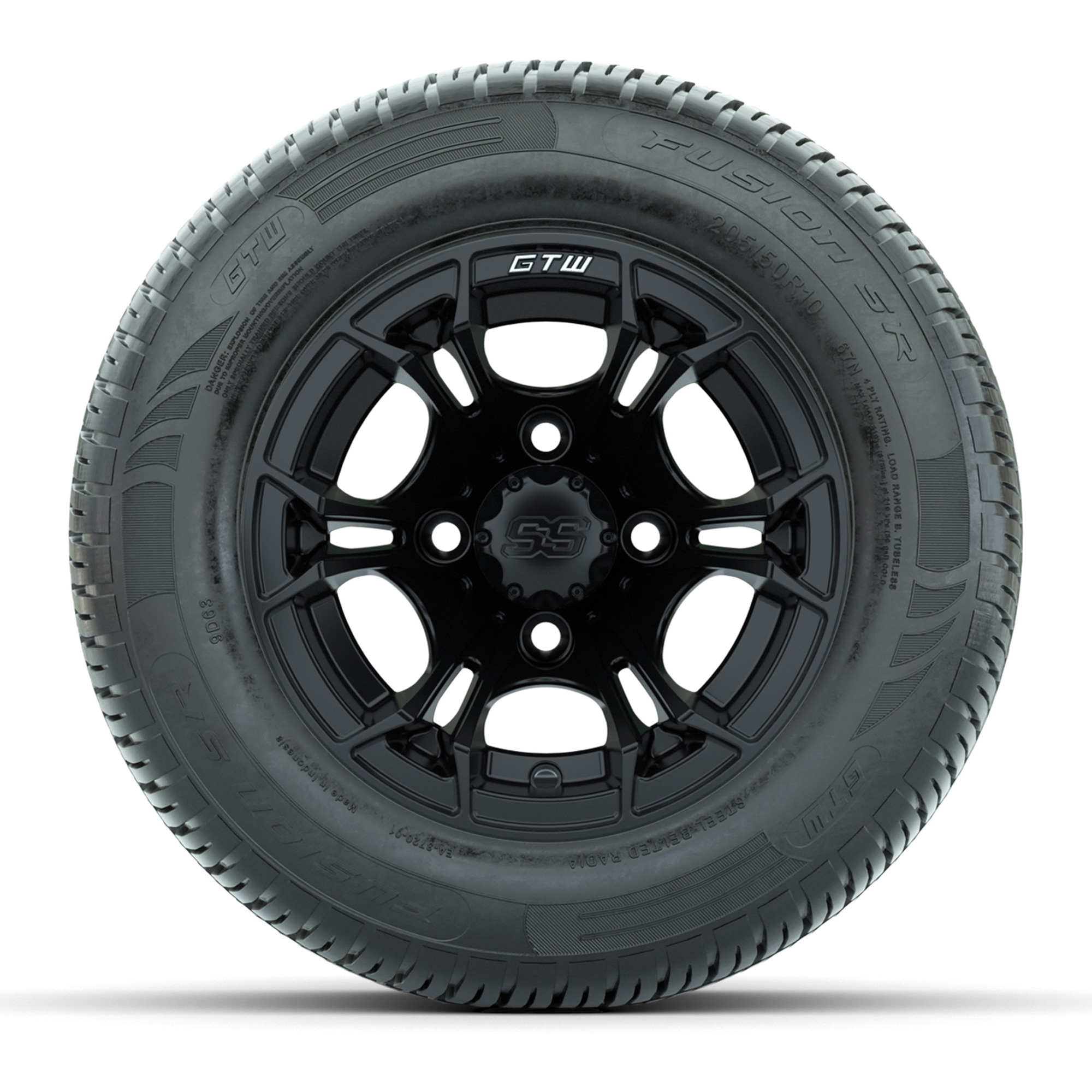 product GTW Spyder Matte Black 10 in Wheels with 205/50-10 Fusion SR Steel Belted Radial Tires – Full SetItem # A19-1088A set of (4) 10-inch GTW® Spyder Matte Black golf cart wheels Mounted on 205/50-10 Fusion SR Steel Belted Radial TiresTread Classification:Street / Golf CourseFull Tire & Wheel Combo Includes:(4) 10x7 GTW Spyder Wheels / Matte Black finish / Offset: 3:4 (ET -.25)(4) 205/50-10 GTW Fusion SR Steel Belted Radial Tires / Tire is approx. 18” tall (4-Ply)(4) Center capsPlease Note: All Wheels are 4 on 4 Hole / Lug Pattern unless otherwise specified.Tech Tips:No Lift Kit Required (Tire is approx. 18” OD)Please Check and Adjust PSI in Tires Before Operation (Recommended Inflation Can Be Found on Sidewall of Tire)Tire & Wheel Combos are mounted and Inflated Before Shipping, Free of ChargeAll Wheels Have a lug pattern of "4x101.6mm"Lug Nuts Sold Separately:Standard Chrome Lug Nuts #LUG4SMetric Chrome Lug Nuts #LUG4M (Yamaha Models) Find A Dealer