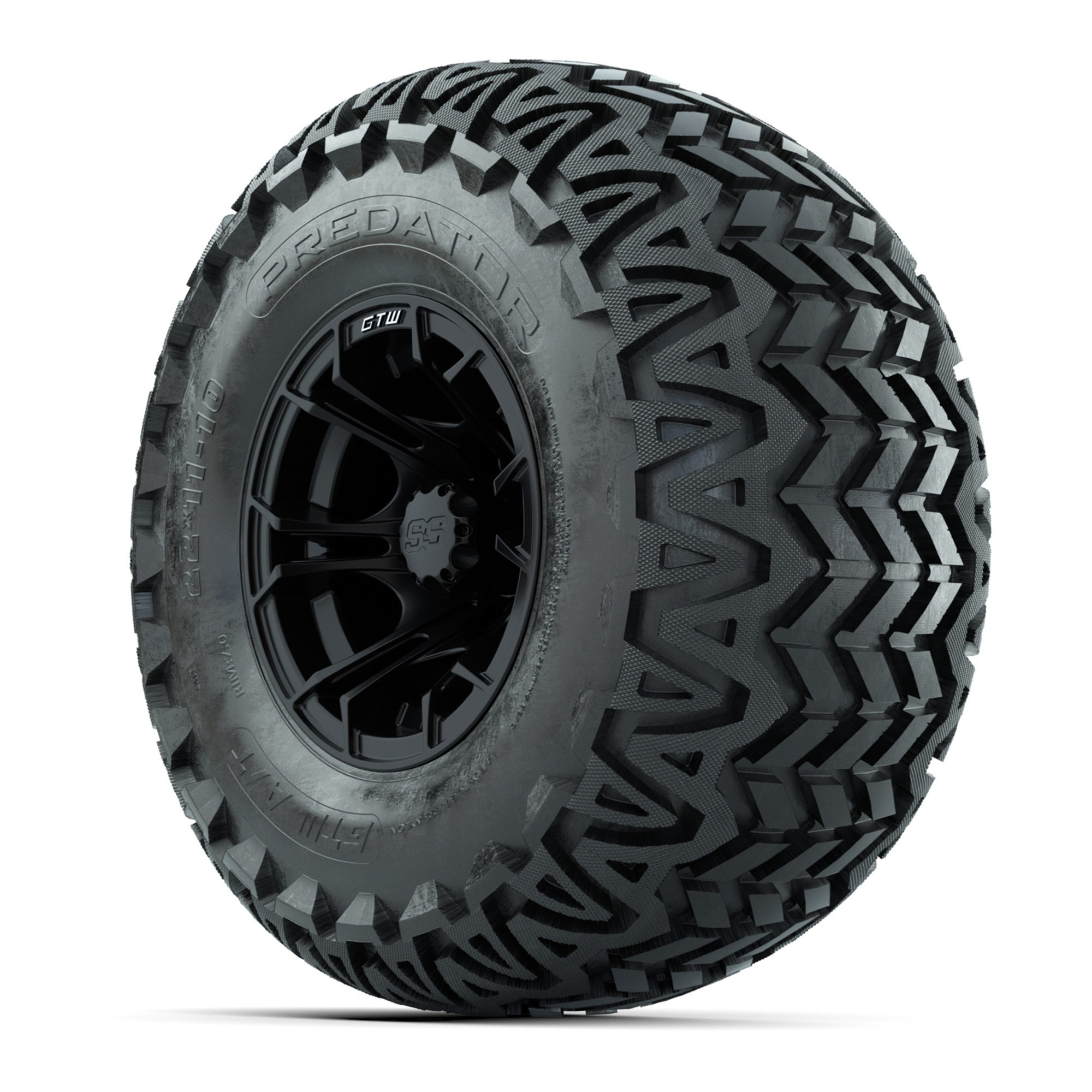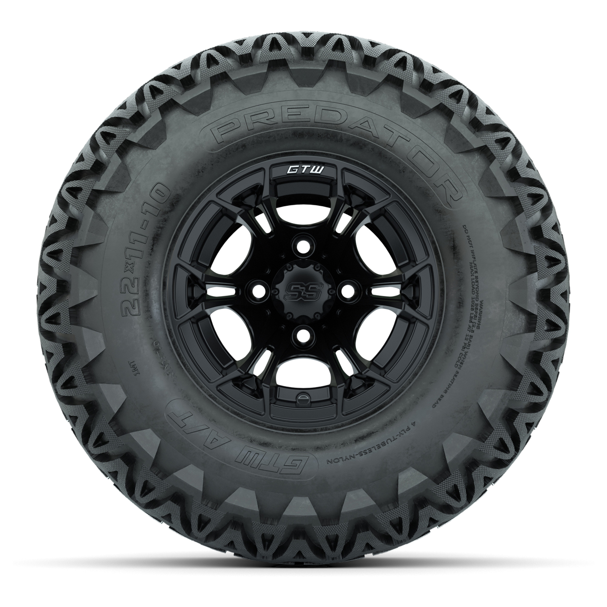 product GTW Spyder Matte Black 10 in Wheels with 22x11-10 Predator All Terrain Tires – Full SetItem # A19-1105A set of (4) 10-inch GTW® Spyder Matte Black golf cart wheels Mounted on 22x11-10 GTW Predator All-Terrain TiresTread Classification:All-Terrain / Off-RoadFull Tire & Wheel Combo Includes:(4) 10x7 GTW Spyder Wheels / Matte Black finish / Offset: 3:4 (ET -.25)(4) 22x11-10 GTW Predator All-Terrain Tires / Tire is approx. 22” tall (4-Ply)(4) Center capsPlease Note: All Wheels are 4 on 4 Hole / Lug Pattern unless otherwise specified.Tech Tips:We Recommend a 6” Lift Kit for This Tire & Wheel Combo (Tire is approx. 22” OD)Please Check and Adjust PSI in Tires Before Operation (Recommended Inflation Can Be Found on Sidewall of Tire)Tire & Wheel Combos are mounted and Inflated Before Shipping, Free of ChargeAll Wheels Have a lug pattern of "4x101.6mm"Lug Nuts Sold Separately:Standard Chrome Lug Nuts #LUG4SMetric Chrome Lug Nuts #LUG4M (Yamaha Models) Find A Dealer