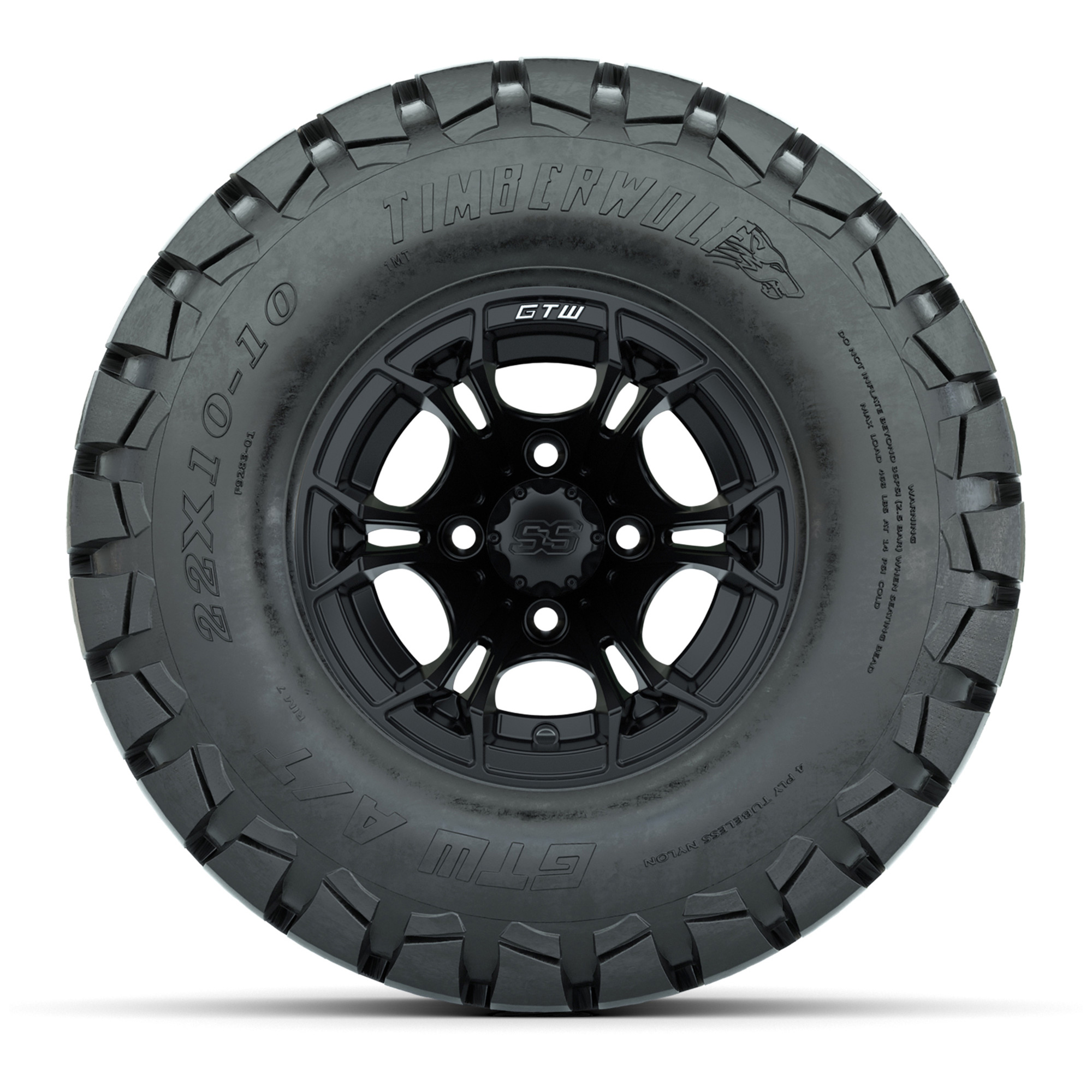 product GTW Spyder Matte Black 10 in Wheels with 22x10-10 Timberwolf All Terrain Tires – Full SetItem # A19-1106A set of (4) 10-inch GTW® Spyder Matte Black golf cart wheels Mounted on 22x10-10 GTW Timberwolf All-Terrain TiresTread Classification:All-Terrain / Off-RoadFull Tire & Wheel Combo Includes:(4) 10x7 GTW Spyder Wheels / Matte Black finish / Offset: 3:4 (ET -.25)(4) 22x10-10 GTW Timberwolf All-Terrain Tires / Tire is approx. 22” tall (4-Ply)(4) Center capsPlease Note: All Wheels are 4 on 4 Hole / Lug Pattern unless otherwise specified.Tech Tips:We Recommend a 6” Lift Kit for This Tire & Wheel Combo (Tire is approx. 22” OD)Please Check and Adjust PSI in Tires Before Operation (Recommended Inflation Can Be Found on Sidewall of Tire)Tire & Wheel Combos are mounted and Inflated Before Shipping, Free of ChargeAll Wheels Have a lug pattern of "4x101.6mm"Lug Nuts Sold Separately:Standard Chrome Lug Nuts #LUG4SMetric Chrome Lug Nuts #LUG4M (Yamaha Models) Find A Dealer