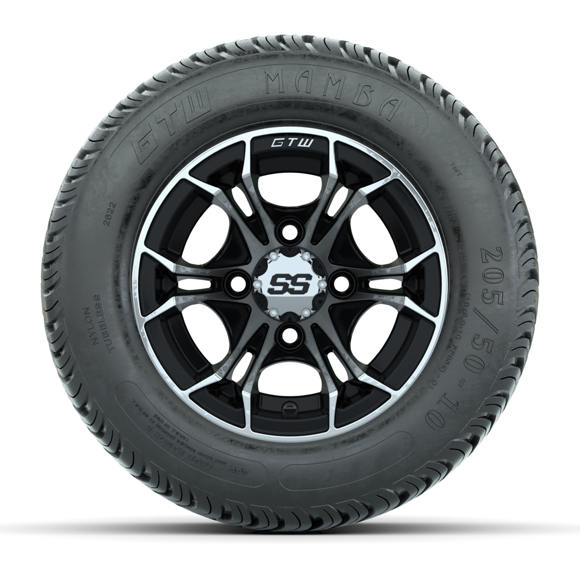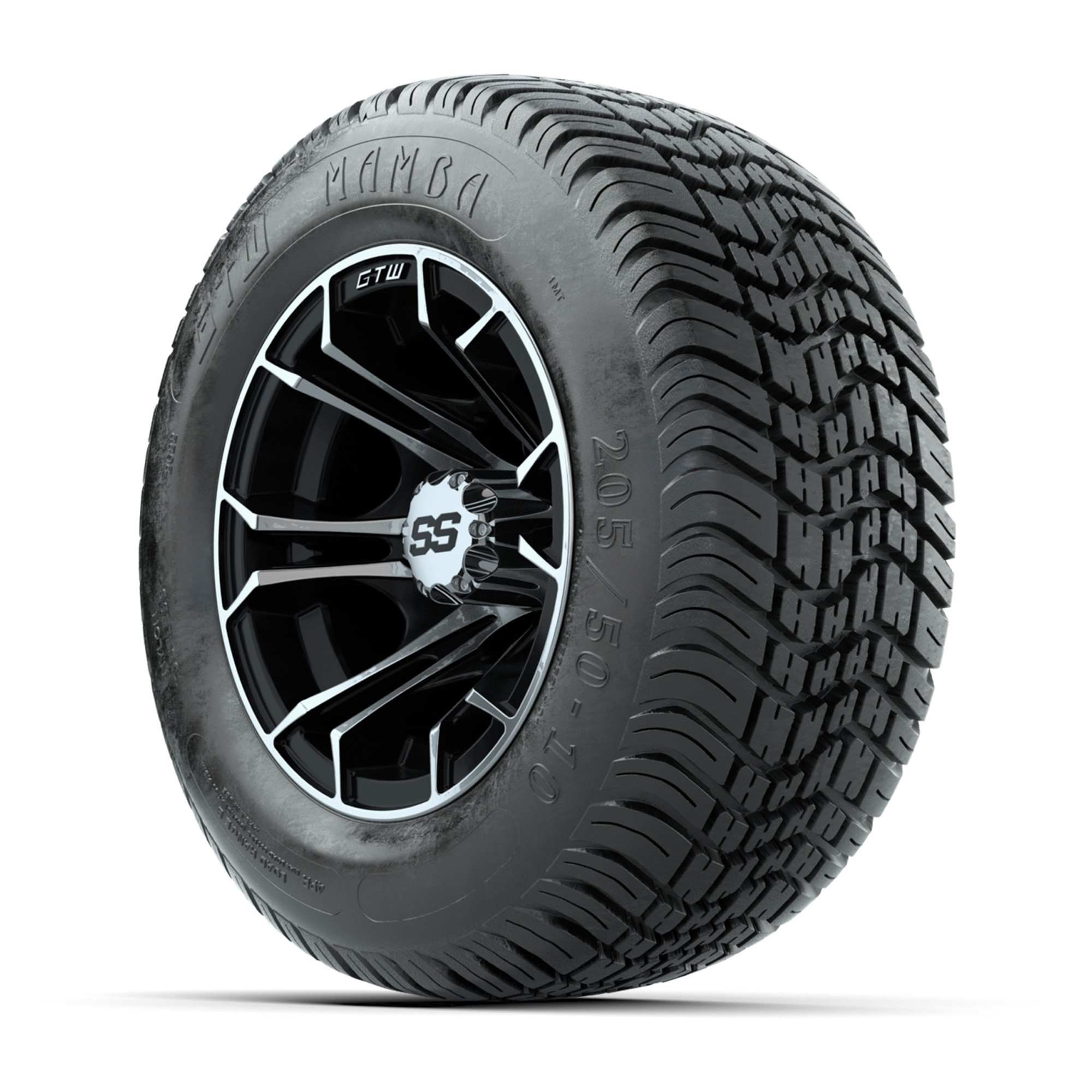 product GTW Spyder Machined/Black 10 in Wheels with 205/50-10 Mamba Street Tires – Full SetItem # A19-1110A set of (4) 10-inch GTW® Spyder Machined/Black golf cart wheels Mounted on 205/50-10 Mamba Street TiresTread Classification:Street / Golf CourseFull Tire & Wheel Combo Includes:(4) 10x7 GTW Spyder Wheels / Black finish with Machined Accents / Offset: 3:4 (ET -.25)(4) 205/50-10 GTW Mamba Street Tires / Tire is approx. 18” tall (4-Ply)(4) Center capsPlease Note: All Wheels are 4 on 4 Hole / Lug Pattern unless otherwise specified.Tech Tips:No Lift Kit Required (Tire is approx. 18” OD)Please Check and Adjust PSI in Tires Before Operation (Recommended Inflation Can Be Found on Sidewall of Tire)Tire & Wheel Combos are mounted and Inflated Before Shipping, Free of ChargeAll Wheels Have a lug pattern of "4x101.6mm"Lug Nuts Sold Separately:Standard Chrome Lug Nuts #LUG4SMetric Chrome Lug Nuts #LUG4M (Yamaha Models) Find A Dealer