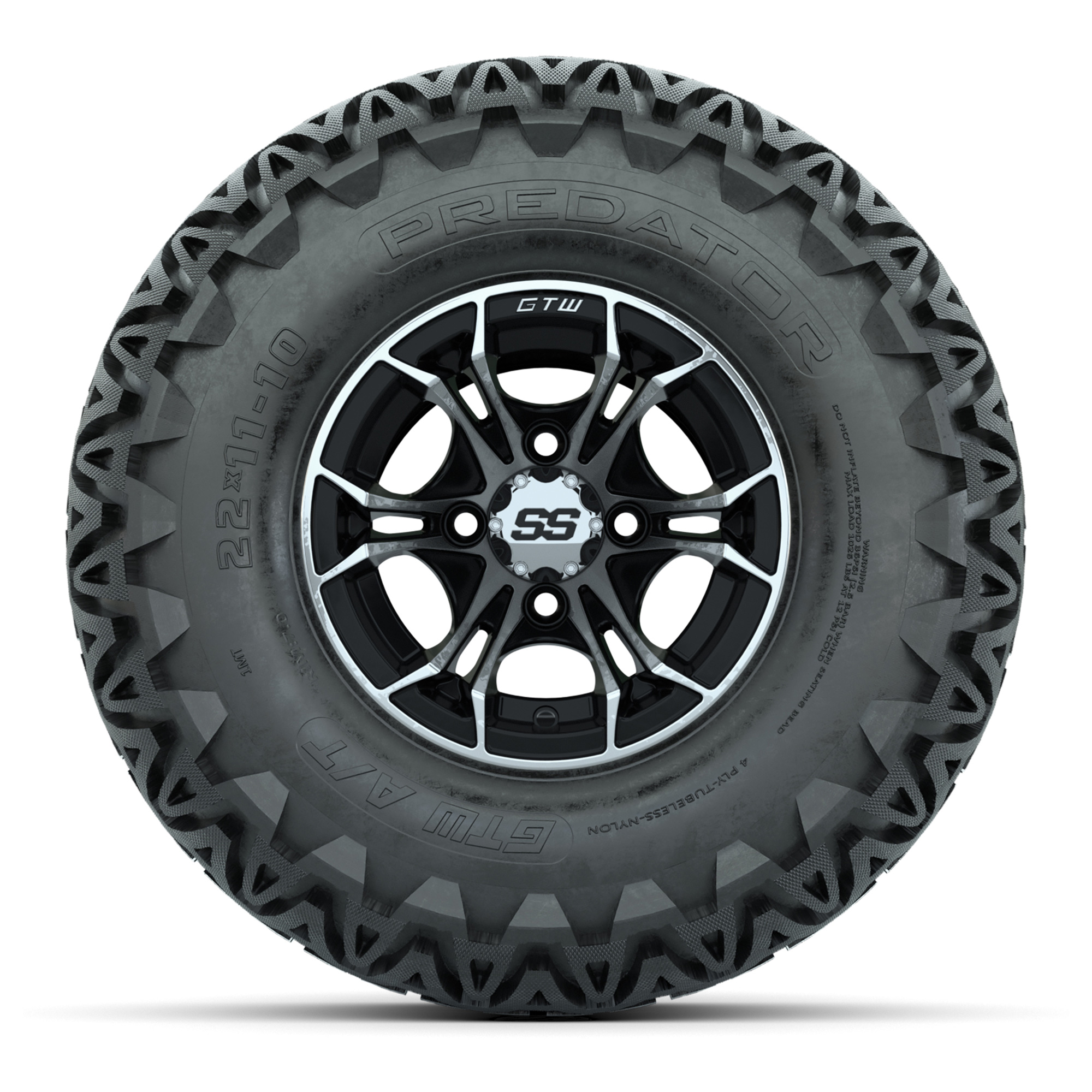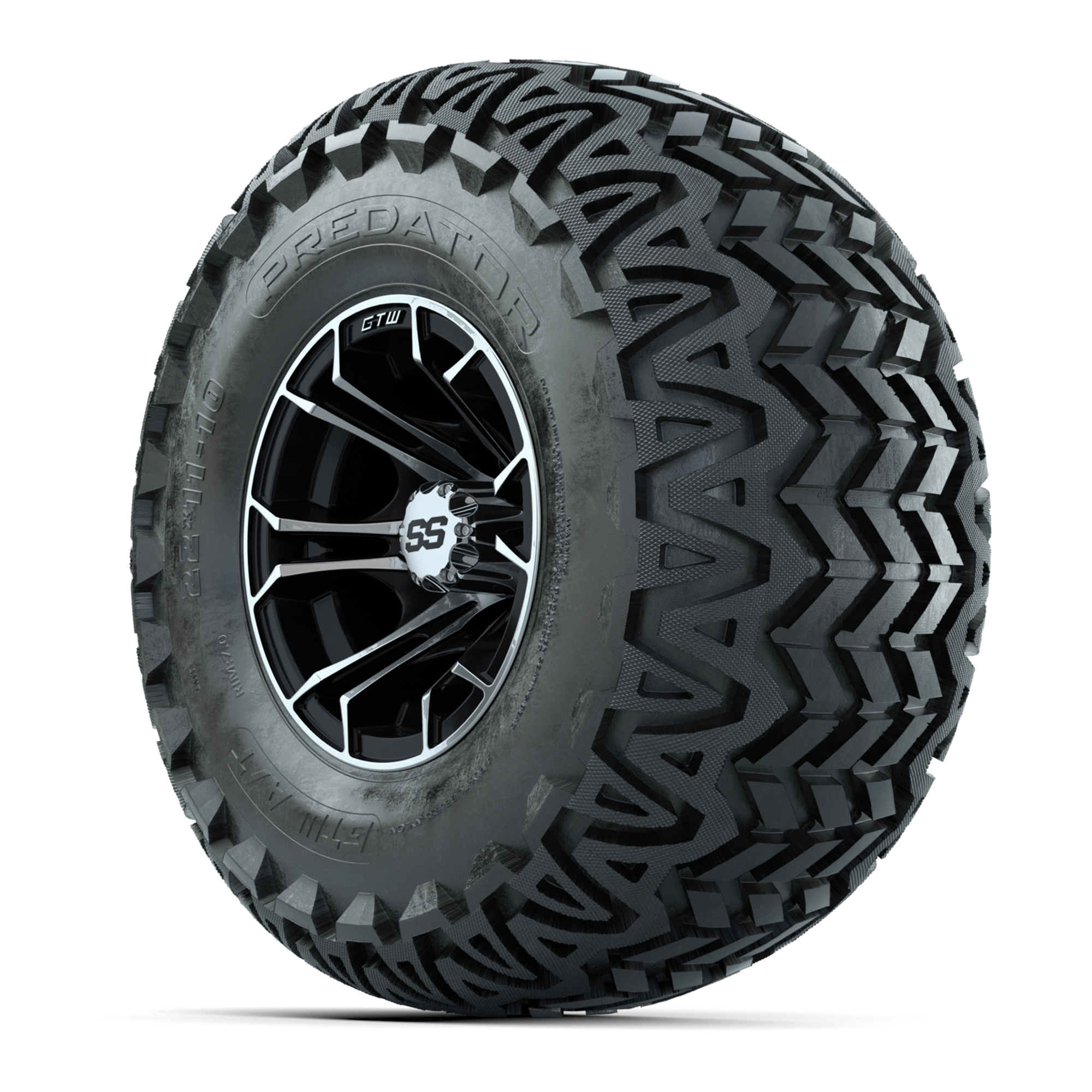 product GTW Spyder Machined/Black 10 in Wheels with 22x11-10 Predator All Terrain Tires – Full SetItem # A19-1125A set of (4) 10-inch GTW® Spyder Machined/Black golf cart wheels Mounted on 22x11-10 GTW Predator All-Terrain TiresTread Classification:All-Terrain / Off-RoadFull Tire & Wheel Combo Includes:(4) 10x7 GTW Spyder Wheels / Black finish with Machined Accents / Offset: 3:4 (ET -.25)(4) 22x11-10 GTW Predator All-Terrain Tires / Tire is approx. 22” tall (4-Ply)(4) Center capsPlease Note: All Wheels are 4 on 4 Hole / Lug Pattern unless otherwise specified.Tech Tips:We Recommend a 6” Lift Kit for This Tire & Wheel Combo (Tire is approx. 22” OD)Please Check and Adjust PSI in Tires Before Operation (Recommended Inflation Can Be Found on Sidewall of Tire)Tire & Wheel Combos are mounted and Inflated Before Shipping, Free of ChargeAll Wheels Have a lug pattern of "4x101.6mm"Lug Nuts Sold Separately:Standard Chrome Lug Nuts #LUG4SMetric Chrome Lug Nuts #LUG4M (Yamaha Models) Find A Dealer