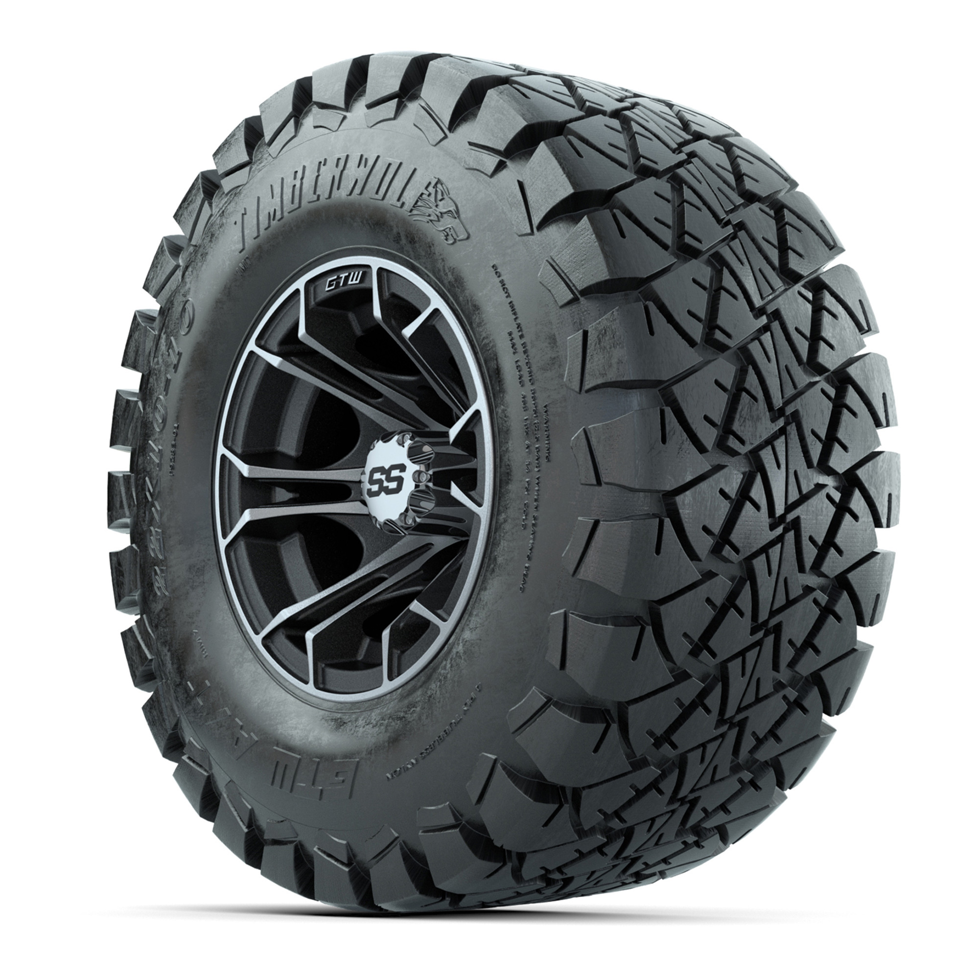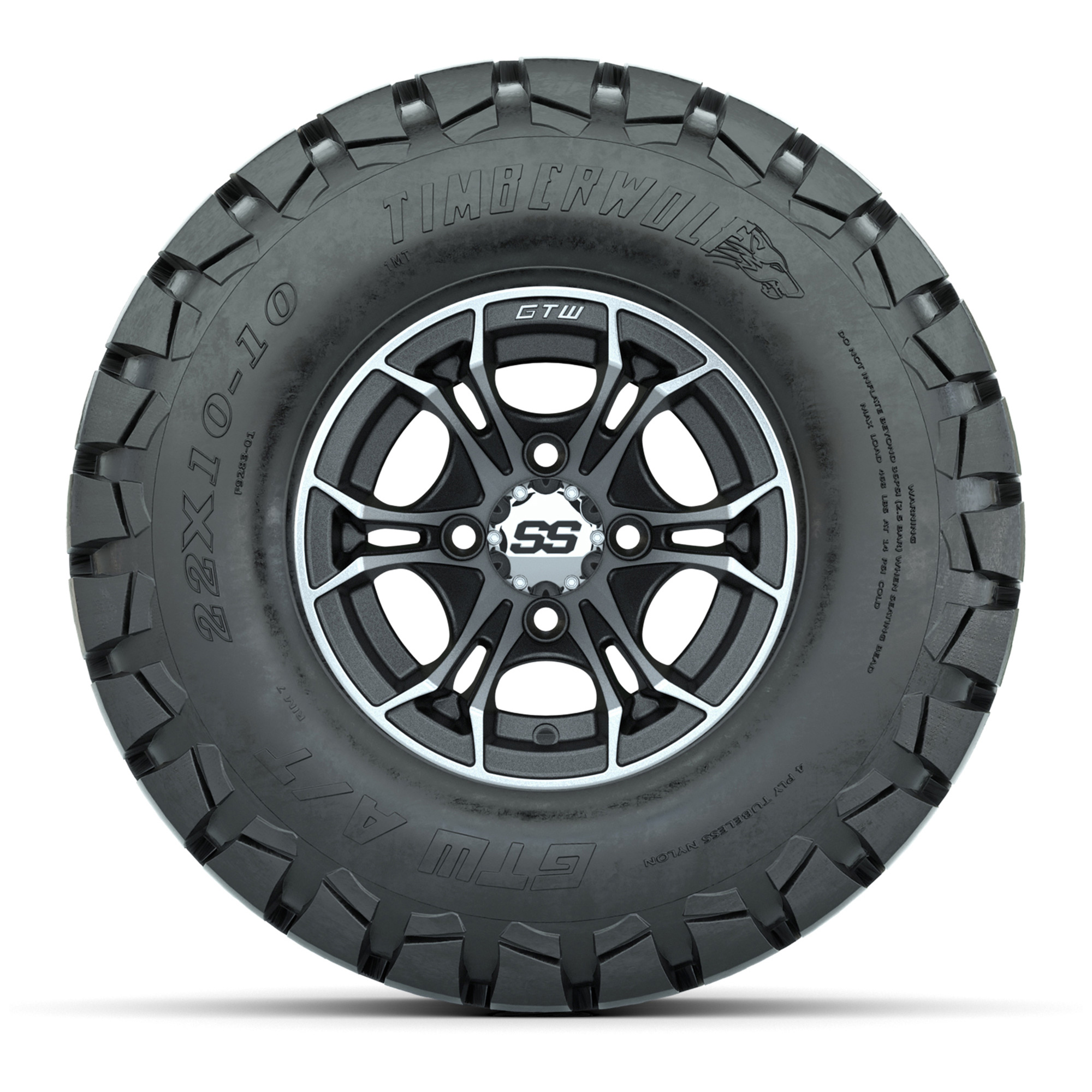 product GTW Spyder Machined/Matte Grey 10 in Wheels with 22x10-10 Timberwolf All Terrain Tires – Full SetItem # A19-1146A set of (4) 10-inch GTW® Spyder Machined/Matte Grey golf cart wheels Mounted on 22x10-10 GTW Timberwolf All-Terrain TiresTread Classification:All-Terrain / Off-RoadFull Tire & Wheel Combo Includes:(4) 10x7 GTW Spyder Wheels / Matte Grey finish with Machined Accents / Offset: 3:4 (ET -.25)(4) 22x10-10 GTW Timberwolf All-Terrain Tires / Tire is approx. 22” tall (4-Ply)(4) Center capsPlease Note: All Wheels are 4 on 4 Hole / Lug Pattern unless otherwise specified.Tech Tips:We Recommend a 6” Lift Kit for This Tire & Wheel Combo (Tire is approx. 22” OD)Please Check and Adjust PSI in Tires Before Operation (Recommended Inflation Can Be Found on Sidewall of Tire)Tire & Wheel Combos are mounted and Inflated Before Shipping, Free of ChargeAll Wheels Have a lug pattern of "4x101.6mm"Lug Nuts Sold Separately:Standard Chrome Lug Nuts #LUG4SMetric Chrome Lug Nuts #LUG4M (Yamaha Models) Find A Dealer