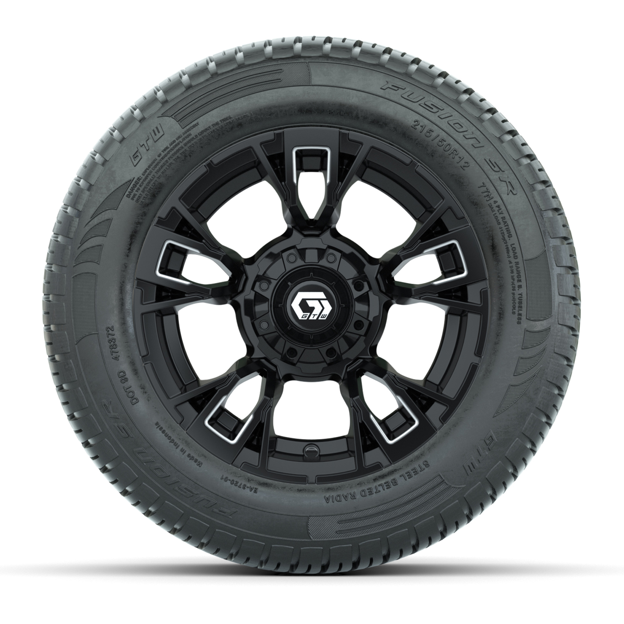 product GTW® Vandal Matte Black/Machined 12 in Wheels with 215/50-R12 Fusion S/R Steel Belt Radial Tires – Full SetItem # A19-1191Tread Classification:Street/CourseFull kit includes:(4) 12” GTW® Vandal Wheels / Matte Black/Machined Finish / Offset: 3:4 (ET -.25)(4) 215/50-R12 Fusion S/R Steel Belt Radial Tire / Tire is approx. 20” tall (4-Ply)(4) Color match capsLug nuts sold separatelyPlease Note: All Wheels are 4 on 4 Hole / Lug Pattern (4x101.6mm) unless otherwise specified.Tech Tips:We Recommend a Lift Kit for This Tire & Wheel KitTire & Wheel Combos are mounted and Inflated Before Shipping, Free of ChargePlease Check and Adjust PSI in Tires Before Operation (Recommended Inflation Can Be Found on Sidewall of Tire)All Wheels Have a lug pattern of "4x101.6mm"Lug Nuts Sold Separately:Standard: #LUG4S (Standard Chrome Lug Nuts) Metric: #LUG4M (Yamaha Models) Find A Dealer