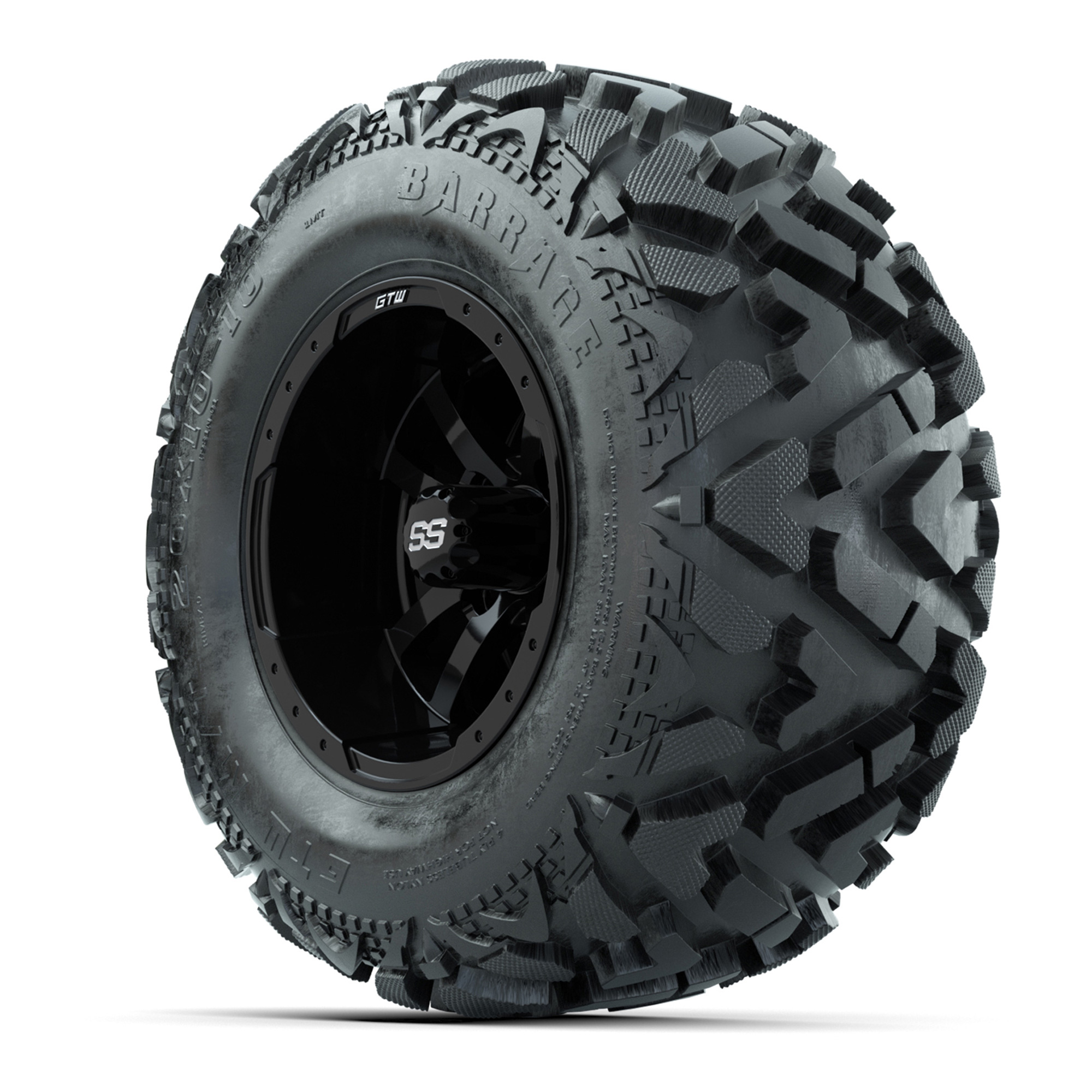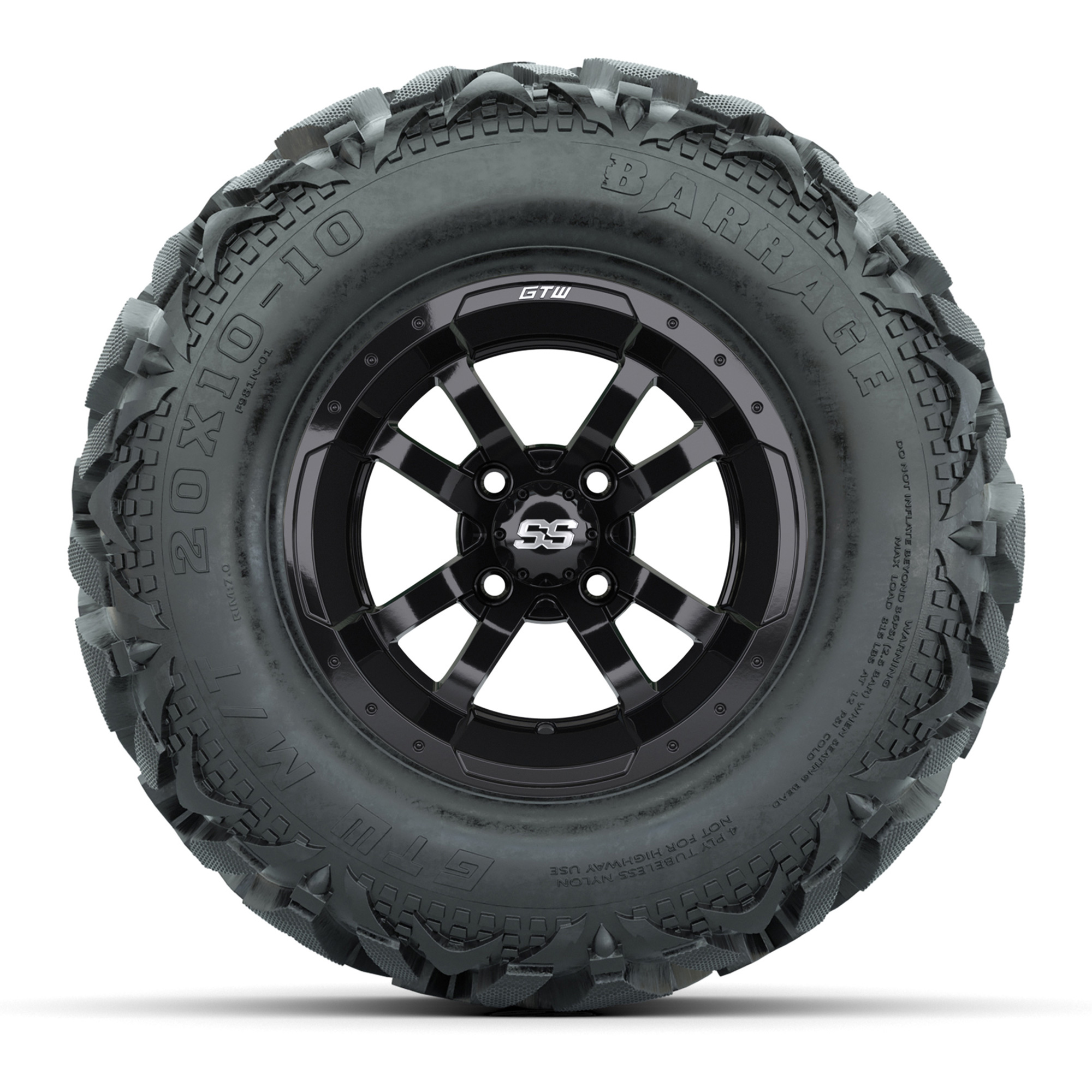 product Storm Trooper Wheels with Barrage Mud Tires - 10 InchItem # A19-145Super sharp looking tire and wheel combo!! Your golf cart will be sure to turn heads with this set of tires and wheels...Tread Classification :Off-Road / MudFull kit includes :(4) 10x7 GTW Storm Trooper Black Wheels(4) 20x10-10 GTW Barrage Mud Tires (4-Ply)(4) SS center caps Note: All Wheels are 4 on 4 Hole / Lug Pattern unless otherwise specified.Tech Tips:This Tire & Wheel Combo Requires a Lift Kit Tire & Wheel Combos are mounted and Inflated Before Shipping, Free of ChargePlease Check and Adjust PSI in Tires Before Operation (Recommended Inflation Can Be Found on Sidewall of Tire)All Wheels Have a lug pattern of "4x101.6mm"Lug Nuts Sold Separately:Standard Chrome Lug Nuts #LUG4SMetric Chrome Lug Nuts #LUG4M (Yamaha Models)Club Car Precedent / Onward / Tempo require a low pro lift kit for any 12” or larger TWA combos (#95560 Jake’s Lo Pro Lift) Find A Dealer