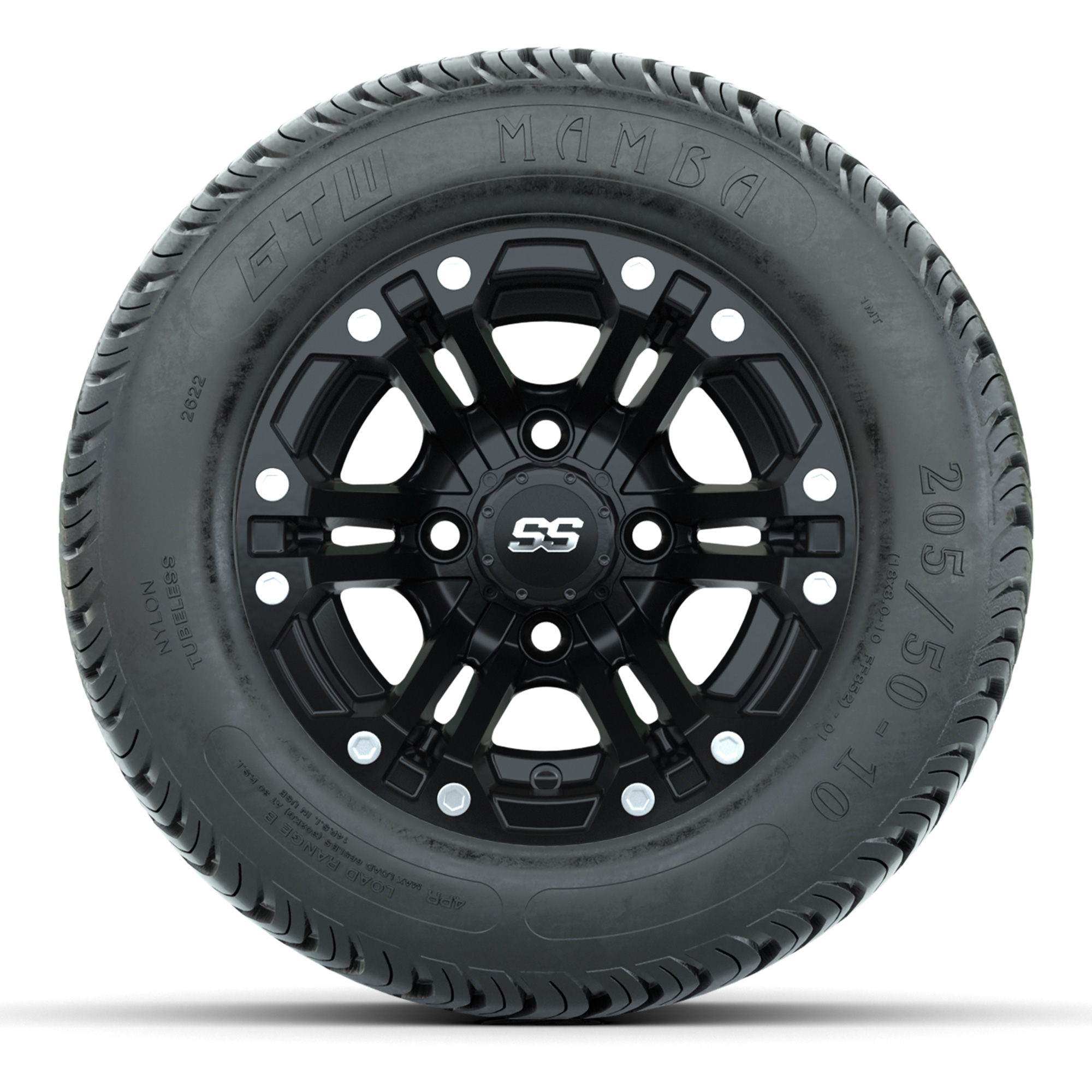 product GTW Specter Matte Black 10 in Wheels with 205/50-10 Mamba Street Tires – Full SetItem # A19-1519A set of (4) 10-inch GTW® Specter Matte Black golf cart wheels mounted on 205/50-10 Mamba Street TiresTread Classification:Street/CourseFull kit includes:(4) 10” GTW® Specter Wheels / Matte Black Finish / Offset: 3:4 (ET -.25)(4) 205/50-10 GTW Mamba Street Tires / Tire is approx. 18” tall (4-Ply)(4) Color match capsLug nuts sold separatelyPlease Note: All Wheels are 4 on 4 Hole / Lug Pattern (4x101.6mm) unless otherwise specified.Tech Tips:This Tire & Wheel Combo Does not require a lift kitTire & Wheel Combos are mounted and Inflated Before Shipping, Free of ChargePlease Check and Adjust PSI in Tires Before Operation (Recommended Inflation Can Be Found on Sidewall of Tire)All Wheels Have a lug pattern of "4x101.6mm"Lug Nuts Sold Separately:Standard: #LUG4S (Standard Chrome Lug Nuts) Metric: #LUG4M (Yamaha Models) Find A Dealer