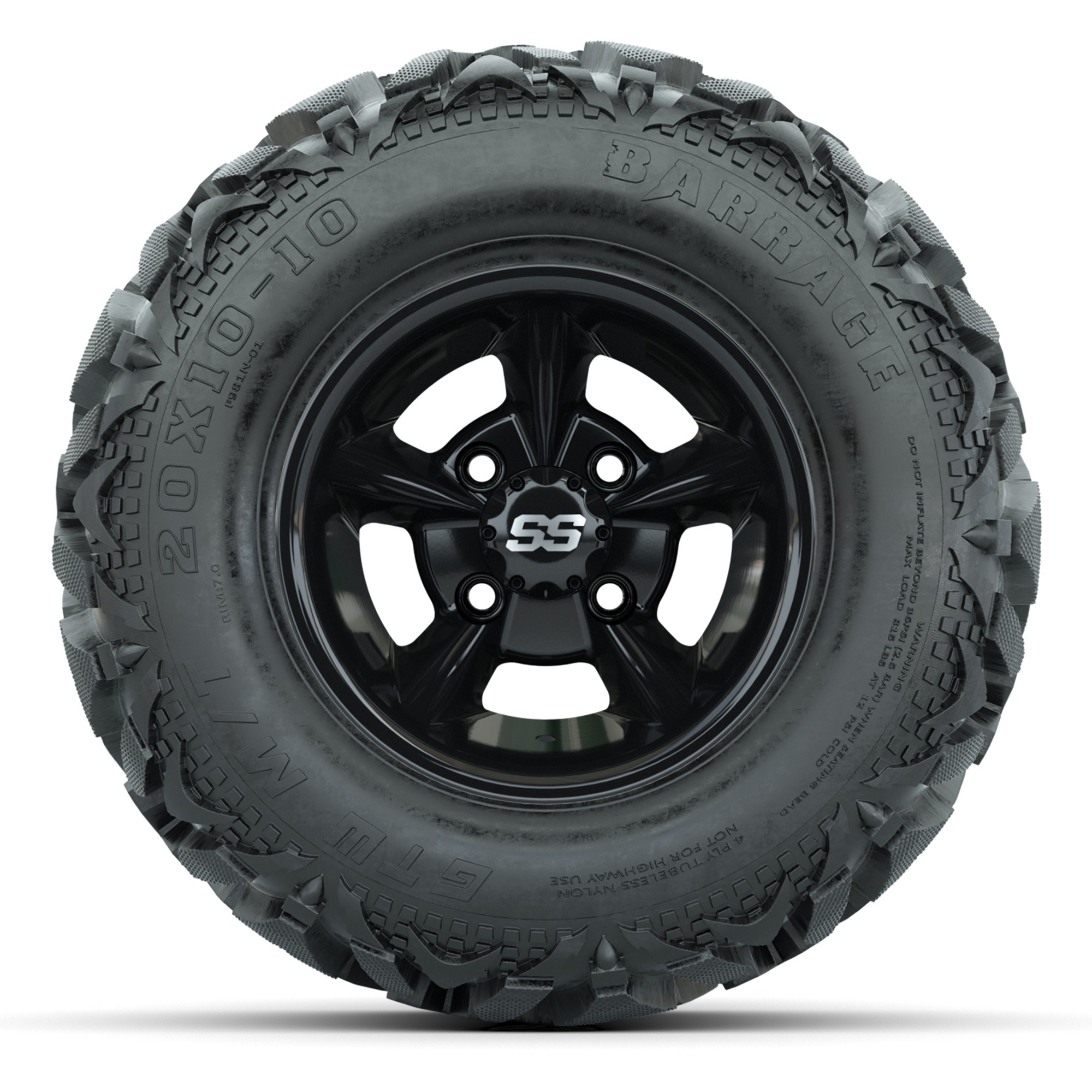 product GTW Godfather Black 10 in Wheels with 20x10-10 Barrage Mud Tires – Full SetItem # A19-1571A set of (4) 10-inch GTW® Godfather Black golf cart wheels mounted on 20x10-10 Barrage Mud TiresTread Classification:All-Terrain / MudFull kit includes:(4) 10” GTW® Godfather Wheels / Black Finish / Offset: 3:4 (ET -.25)(4) 20x10-10 GTW Barrage Mud Tires / Tire is approx. 20” tall (4-Ply)(4) Color match capsLug nuts sold separatelyPlease Note: All Wheels are 4 on 4 Hole / Lug Pattern (4x101.6mm) unless otherwise specified.Tech Tips:We Recommend a Lift Kit for This Tire & Wheel KitTire & Wheel Combos are mounted and Inflated Before Shipping, Free of ChargePlease Check and Adjust PSI in Tires Before Operation (Recommended Inflation Can Be Found on Sidewall of Tire)All Wheels Have a lug pattern of "4x101.6mm"Lug Nuts Sold Separately:Standard: #LUG4S (Standard Chrome Lug Nuts) Metric: #LUG4M (Yamaha Models) Find A Dealer