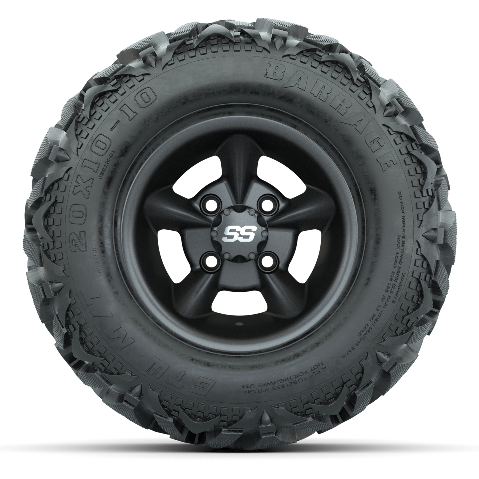 product GTW Godfather Matte Gray 10 in Wheels with 20x10-10 Barrage Mud Tires – Full SetItem # A19-1601A set of (4) 10-inch GTW® Godfather Matte Gray golf cart wheels mounted on 20x10-10 Barrage Mud TiresTread Classification:All-Terrain / MudFull kit includes:(4) 10” GTW® Godfather Wheels / Matte Gray Finish / Offset: 3:4 (ET -.25)(4) 20x10-10 GTW Barrage Mud Tires / Tire is approx. 20” tall (4-Ply)(4) Color match capsLug nuts sold separatelyPlease Note: All Wheels are 4 on 4 Hole / Lug Pattern (4x101.6mm) unless otherwise specified.Tech Tips:We Recommend a Lift Kit for This Tire & Wheel KitTire & Wheel Combos are mounted and Inflated Before Shipping, Free of ChargePlease Check and Adjust PSI in Tires Before Operation (Recommended Inflation Can Be Found on Sidewall of Tire)All Wheels Have a lug pattern of "4x101.6mm"Lug Nuts Sold Separately:Standard: #LUG4S (Standard Chrome Lug Nuts) Metric: #LUG4M (Yamaha Models) Find A Dealer