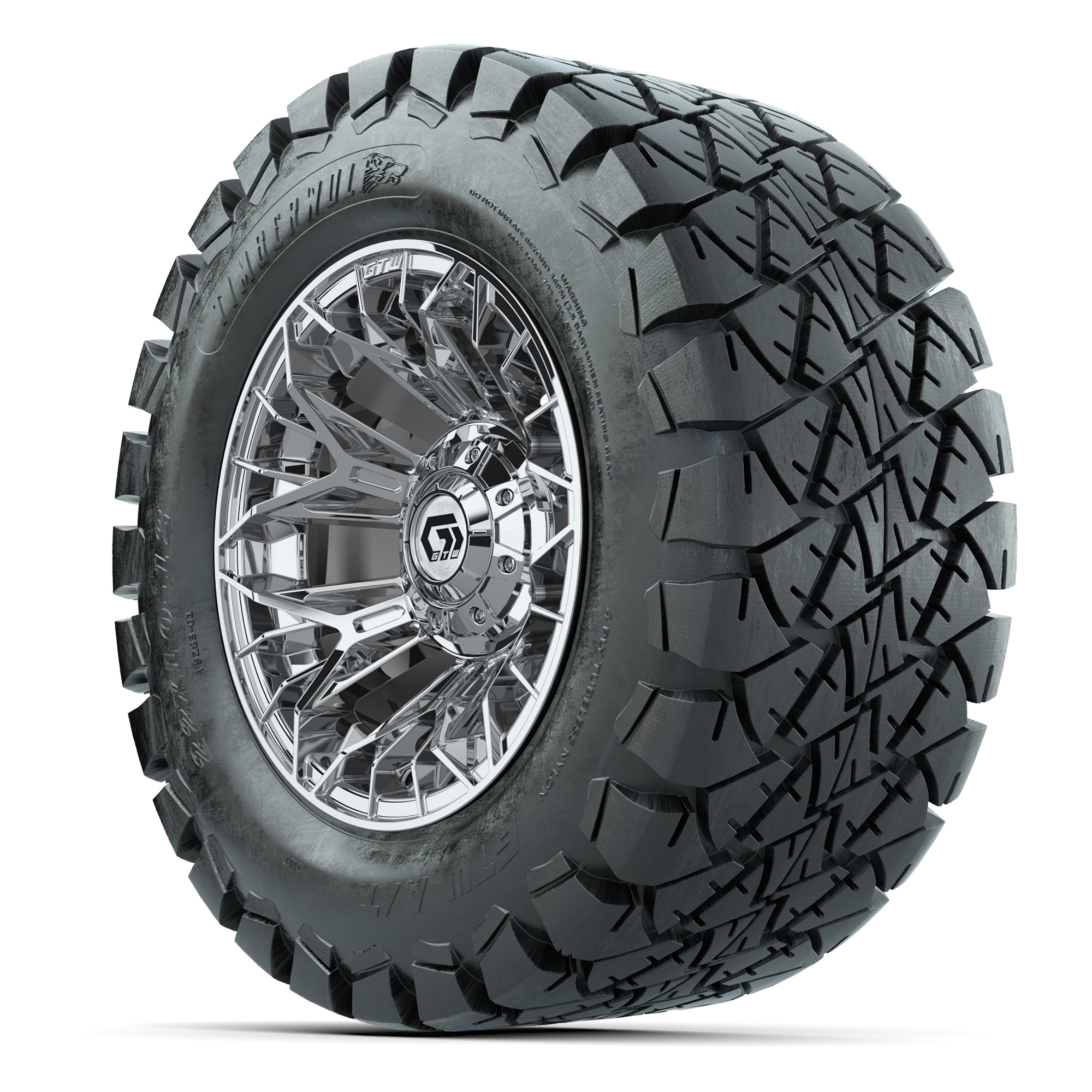 product GTW® Stellar Chrome 12 in Wheels with 22X10-12 Timberwolf All-Terrain Tires – Full SetItem # A19-1681A set of (4) 12-inch GTW® Stellar chrome golf cart wheels mounted on 22x10-12 GTW® Timberwolf all-terrain tiresTread Classification:All-Terrain / Off-RoadFull Tire & Wheel Package Includes:(4) 12x7 GTW® Stellar Wheels / Chrome finish / Offset: 3:4 (ET -.25)(4) 22x10-12 GTW® Timberwolf All-Terrain Tires / Tire is approx. 22" tall (4-Ply)(4) Center capsPlease Note: All Wheels are 4 on 4 Hole / Lug Pattern unless otherwise specified.Tech Tips:This Tire & Wheel Combo Requires a Lift Kit (Tire is approx. 22" OD)Please Check and Adjust PSI in Tires Before Operation (Recommended Inflation Can Be Found on Sidewall of Tire)Tire & Wheel Packages are mounted and Inflated Before Shipping, Free of ChargeAll Wheels Have a lug pattern of "4x101.6mm"Lug Nuts Sold SeparatelyStandard Black Lug Nuts #LUG16SBMetric Black Lug Nuts #LUG16MB (Yamaha Models) Find A Dealer