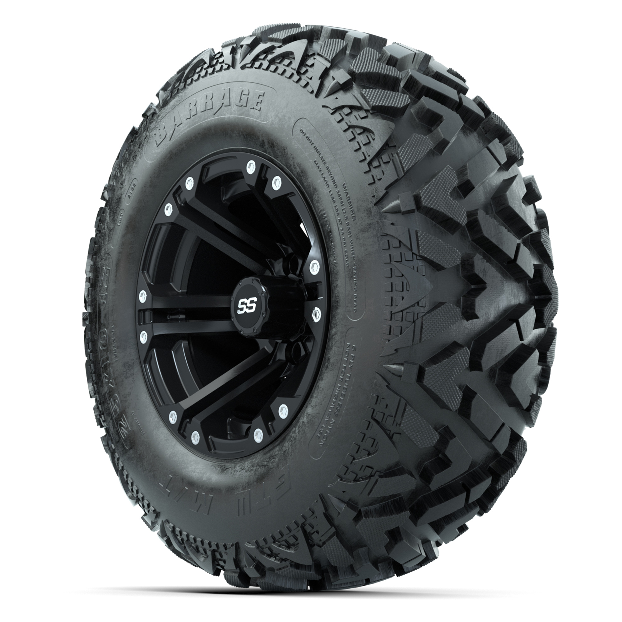 product GTW® Specter Matte Black 12 in Wheels with 25X10-12 Barrage Mud Tires – Full SetItem # A19-1790A set of (4) 12-inch GTW® Specter Matte Black golf cart wheels mounted on 25X10-12 GTW® Barrage Mud TiresTread Classification:All-Terrain / Off-RoadFull Tire & Wheel Package Includes:(4) 12x7 GTW® Specter Wheels / Matte Black finish / Offset: 3:4 (ET -.25)(4) 25X10-12 Barrage Mud Tires / Tire is approx. 25" tall (4-Ply)(4) Center capsPlease Note: All Wheels are 4 on 4 Hole / Lug Pattern unless otherwise specified.Tech Tips:This Tire & Wheel Combo Requires a Lift Kit (Tire is approx. 25" OD)Please Check and Adjust PSI in Tires Before Operation (Recommended Inflation Can Be Found on Sidewall of Tire)Tire & Wheel Packages are mounted and Inflated Before Shipping, Free of ChargeAll Wheels Have a lug pattern of "4x101.6mm"Lug Nuts Sold SeparatelyStandard Black Lug Nuts #LUG16SBMetric Black Lug Nuts #LUG16MB (Yamaha Models) Find A Dealer
