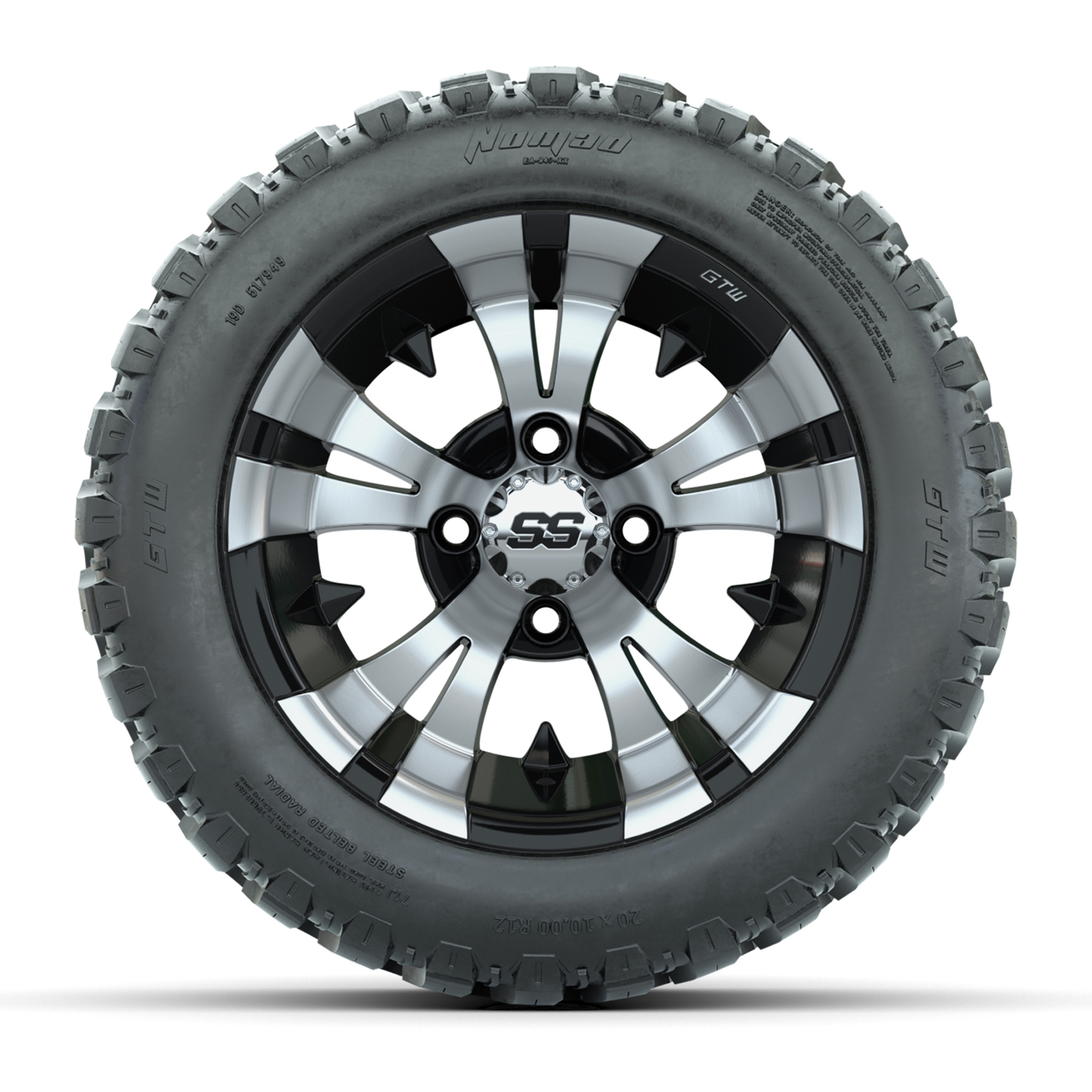 product GTW® Vampire Black/Machined 12 in Wheels with 20X10-12 Nomad Steel Belt Radial All-Terrain Tires – Full SetItem # A19-1805A set of (4) 12-inch GTW® Vampire Black/Machined golf cart wheels mounted on 20X10-12 GTW® Nomad Steel Belt Radial All-Terrain TiresTread Classification:All-Terrain / Off-RoadFull Tire & Wheel Package Includes:(4) 12x7 GTW® Vampire Wheels / Black & Machined finish / Offset: 3:4 (ET -.25)(4) 20X10-12 Nomad Steel Belt Radial All-Terrain Tires / Tire is approx. 20" tall (4-Ply)(4) Center capsPlease Note: All Wheels are 4 on 4 Hole / Lug Pattern unless otherwise specified.Tech Tips:This Tire & Wheel Combo Requires a Lift Kit (Tire is approx. 20" OD)Please Check and Adjust PSI in Tires Before Operation (Recommended Inflation Can Be Found on Sidewall of Tire)Tire & Wheel Packages are mounted and Inflated Before Shipping, Free of ChargeAll Wheels Have a lug pattern of "4x101.6mm"Lug Nuts Sold SeparatelyStandard Black Lug Nuts #LUG16SBMetric Black Lug Nuts #LUG16MB (Yamaha Models) Find A Dealer