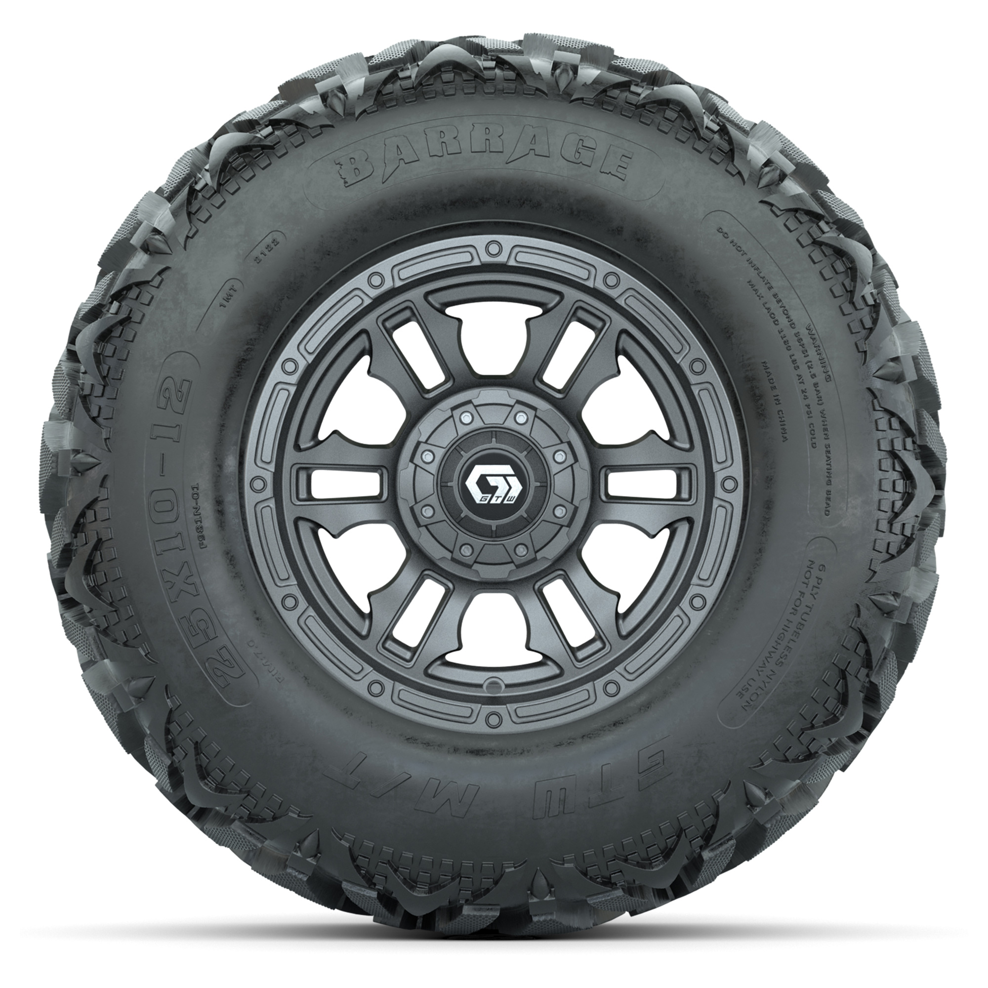 product GTW® Shogun Gunmetal 12 in Wheels with 25X10-12 Barrage Mud Tires – Full SetItem # A19-1901A set of (4) 12-inch GTW® Shogun Gunmetal golf cart wheels mounted on 25X10-12 GTW® Barrage Mud TiresTread Classification:All-Terrain / Off-RoadFull Tire & Wheel Package Includes:(4) 12x7 GTW® Shogun Wheels / Gunmetal finish / Offset: 3:4 (ET -.25)(4) 25X10-12 Barrage Mud Tires / Tire is approx. 25" tall (4-Ply)(4) Center capsPlease Note: All Wheels are 4 on 4 Hole / Lug Pattern unless otherwise specified.Tech Tips:This Tire & Wheel Combo Requires a Lift Kit (Tire is approx. 25" OD)Please Check and Adjust PSI in Tires Before Operation (Recommended Inflation Can Be Found on Sidewall of Tire)Tire & Wheel Packages are mounted and Inflated Before Shipping, Free of ChargeAll Wheels Have a lug pattern of "4x101.6mm"Lug Nuts Sold SeparatelyStandard Black Lug Nuts #LUG16SBMetric Black Lug Nuts #LUG16MB (Yamaha Models) Find A Dealer