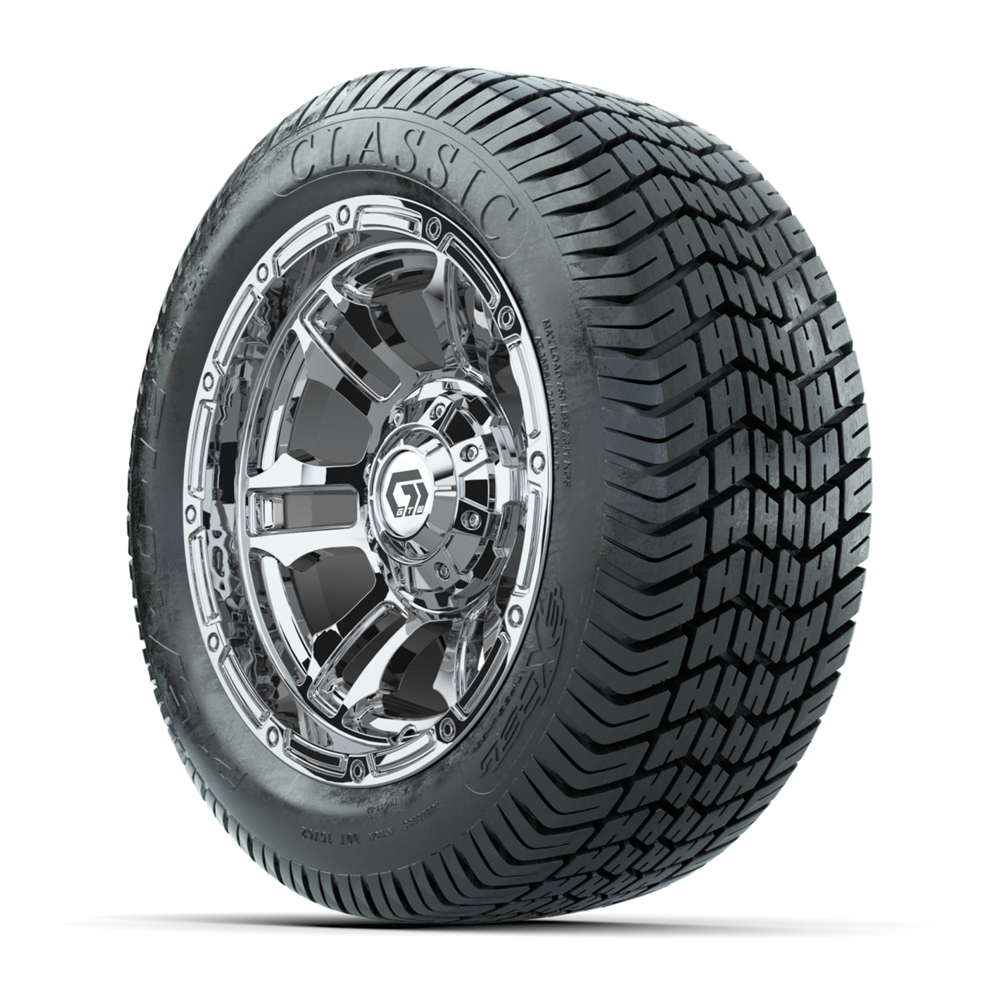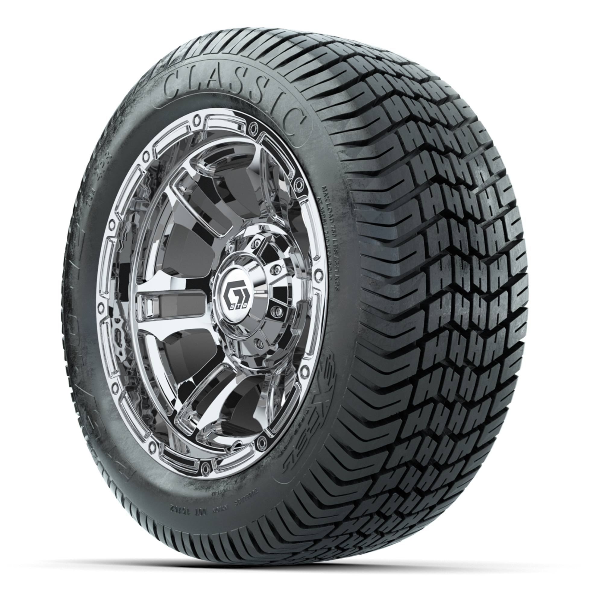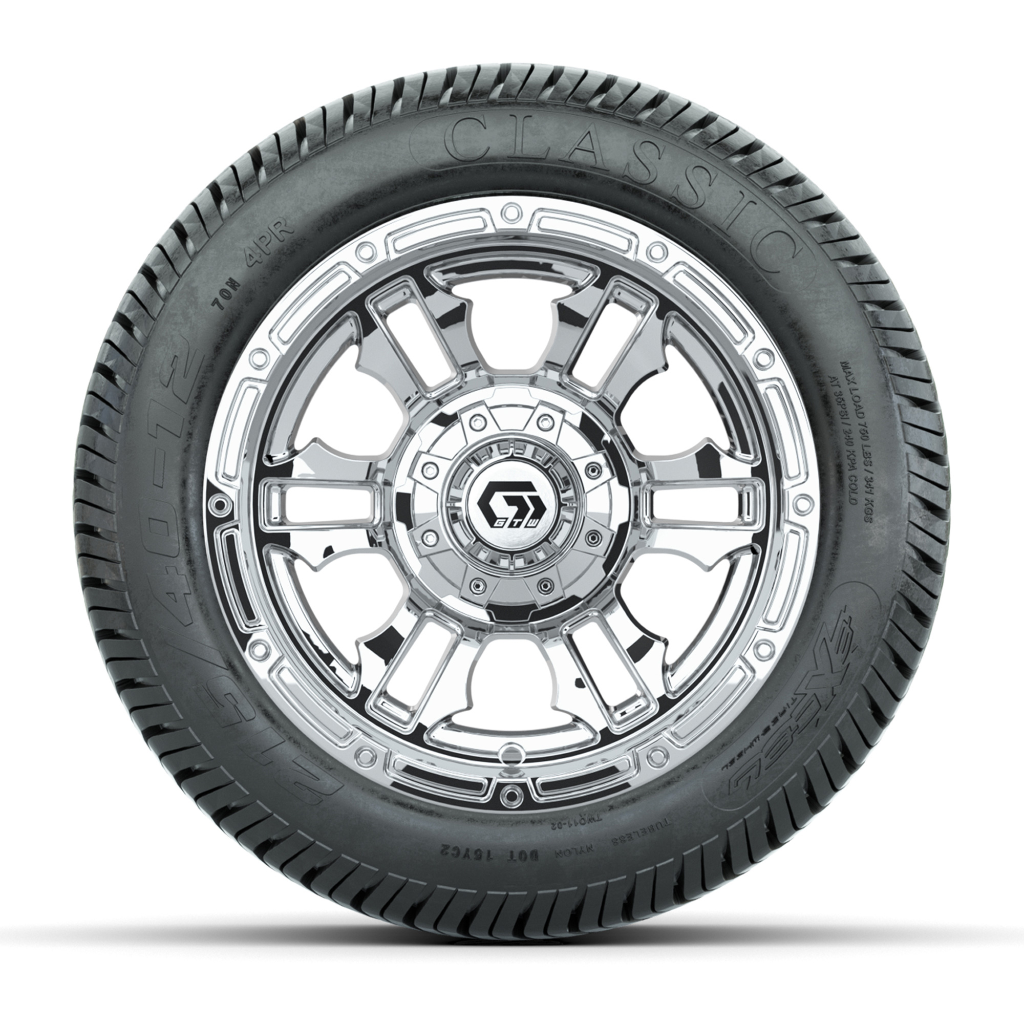 product GTW® Shogun Chrome 12 in Wheels with 215/40-12 Excel Classic Street Tires – Full SetItem # A19-1919A set of (4) 12-inch GTW® Shogun Chrome golf cart wheels mounted on 215/40-12 Excel Classic Street TiresTread Classification:Street/CourseFull kit includes:(4) 12” GTW® Shogun Wheels / Chrome Finish / Offset: 3:4 (ET -.25)(4) 215/40-12 Excel Classic Street Tires / Tire is approx. 19” tall (4-Ply)(4) Color match capsLug nuts sold separatelyPlease Note: All Wheels are 4 on 4 Hole / Lug Pattern (4x101.6mm) unless otherwise specified.Tech Tips:This Tire & Wheel Combo Does not require a lift kitTire & Wheel Combos are mounted and Inflated Before Shipping, Free of ChargePlease Check and Adjust PSI in Tires Before Operation (Recommended Inflation Can Be Found on Sidewall of Tire)All Wheels Have a lug pattern of "4x101.6mm"Lug Nuts Sold Separately:Standard: #LUG4S (Standard Chrome Lug Nuts) Metric: #LUG4M (Yamaha Models) Find A Dealer