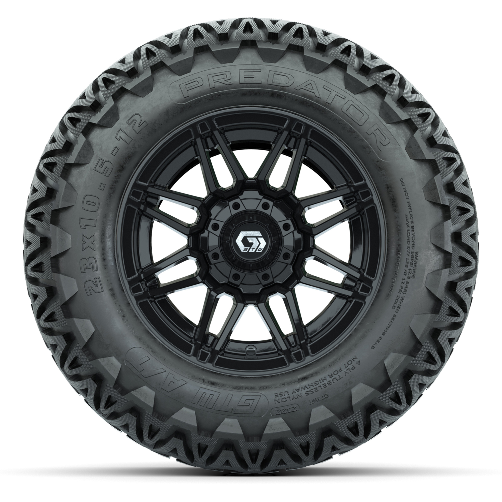 product GTW® Stealth Gloss Black 12 in Wheels with 23X10.5-12 Predator All-Terrain Tires – Full SetItem # A19-1943A set of (4) 12-inch GTW® Stealth Gloss Black golf cart wheels mounted on 23x10.5-12 GTW® Predator all-terrain tiresTread Classification:All-Terrain/Off-RoadFull kit includes:(4) 12” GTW® Stealth Wheels / Gloss Black Finish / Offset: 3:4 (ET -.25)(4) 23/10.5-12 GTW® Predator All-Terrain Tires / Tire is approx. 23” tall (4-Ply)(4) Color match capsLug nuts sold separatelyPlease Note: All Wheels are 4 on 4 Hole / Lug Pattern (4x101.6mm) unless otherwise specified.Tech Tips:We Recommend a Lift Kit for This Tire & Wheel KitTire & Wheel Combos are mounted and Inflated Before Shipping, Free of ChargePlease Check and Adjust PSI in Tires Before Operation (Recommended Inflation Can Be Found on Sidewall of Tire)All Wheels Have a lug pattern of "4x101.6mm"Lug Nuts Sold Separately:Standard: #LUG4S (Standard Chrome Lug Nuts) Metric: #LUG4M (Yamaha Models) Find A Dealer