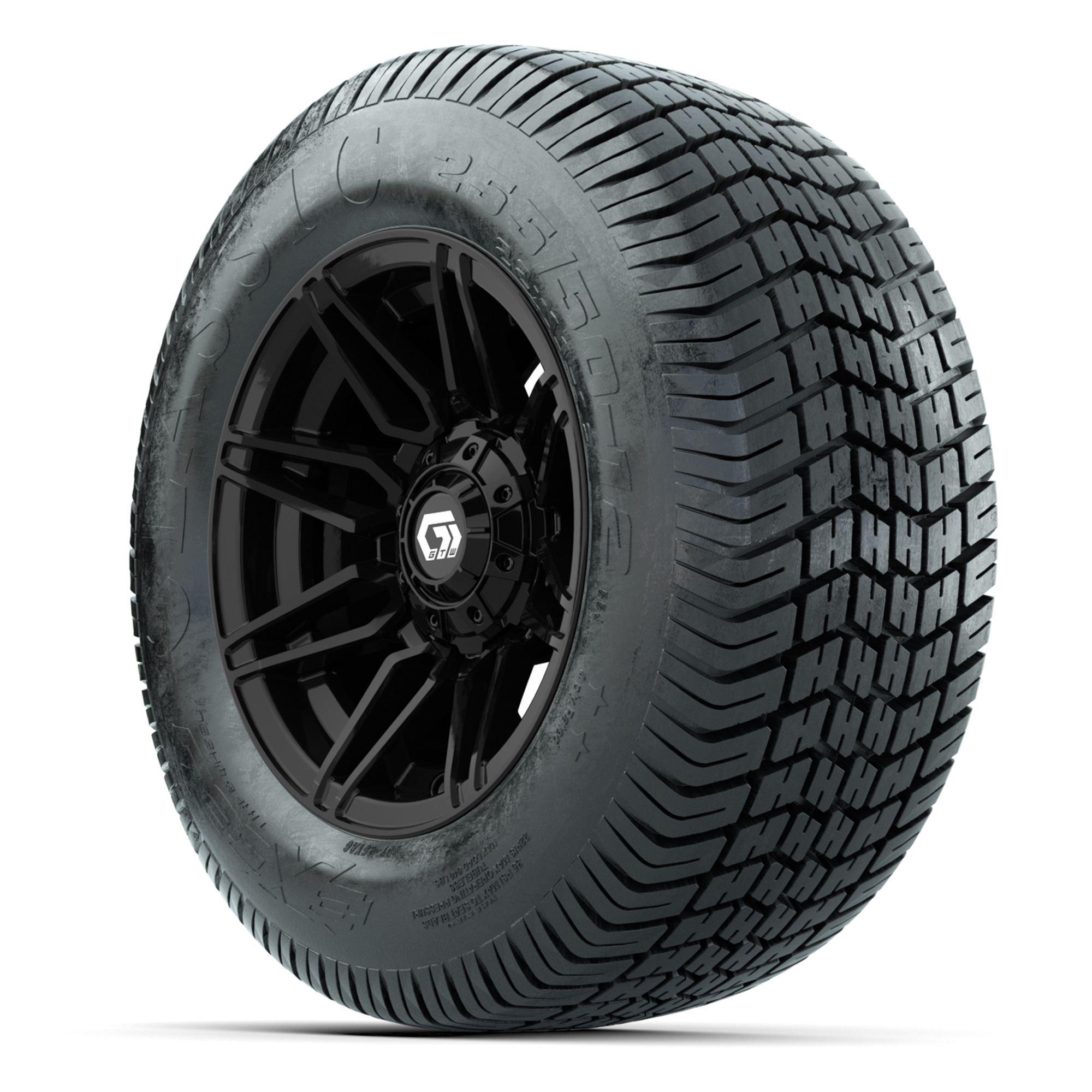 product GTW® Stealth Gloss Black 12 in Wheels with 255/50-12 Excel Classic Street Tires – Full SetItem # A19-1950A set of (4) 12-inch GTW® Stealth Gloss Black golf cart wheels mounted on 255/50-12 Excel Classic Street TiresTread Classification:Street/CourseFull kit includes:(4) 12” GTW® Stealth Wheels / Gloss Black Finish / Offset: 3:4 (ET -.25)(4) 255/50-12 Excel Classic Street Tires / Tire is approx. 23” tall (4-Ply)(4) Color match capsLug nuts sold separatelyPlease Note: All Wheels are 4 on 4 Hole / Lug Pattern (4x101.6mm) unless otherwise specified.Tech Tips:We Recommend a Lift Kit for This Tire & Wheel KitTire & Wheel Combos are mounted and Inflated Before Shipping, Free of ChargePlease Check and Adjust PSI in Tires Before Operation (Recommended Inflation Can Be Found on Sidewall of Tire)All Wheels Have a lug pattern of "4x101.6mm"Lug Nuts Sold Separately:Standard: #LUG4S (Standard Chrome Lug Nuts) Metric: #LUG4M (Yamaha Models) Find A Dealer