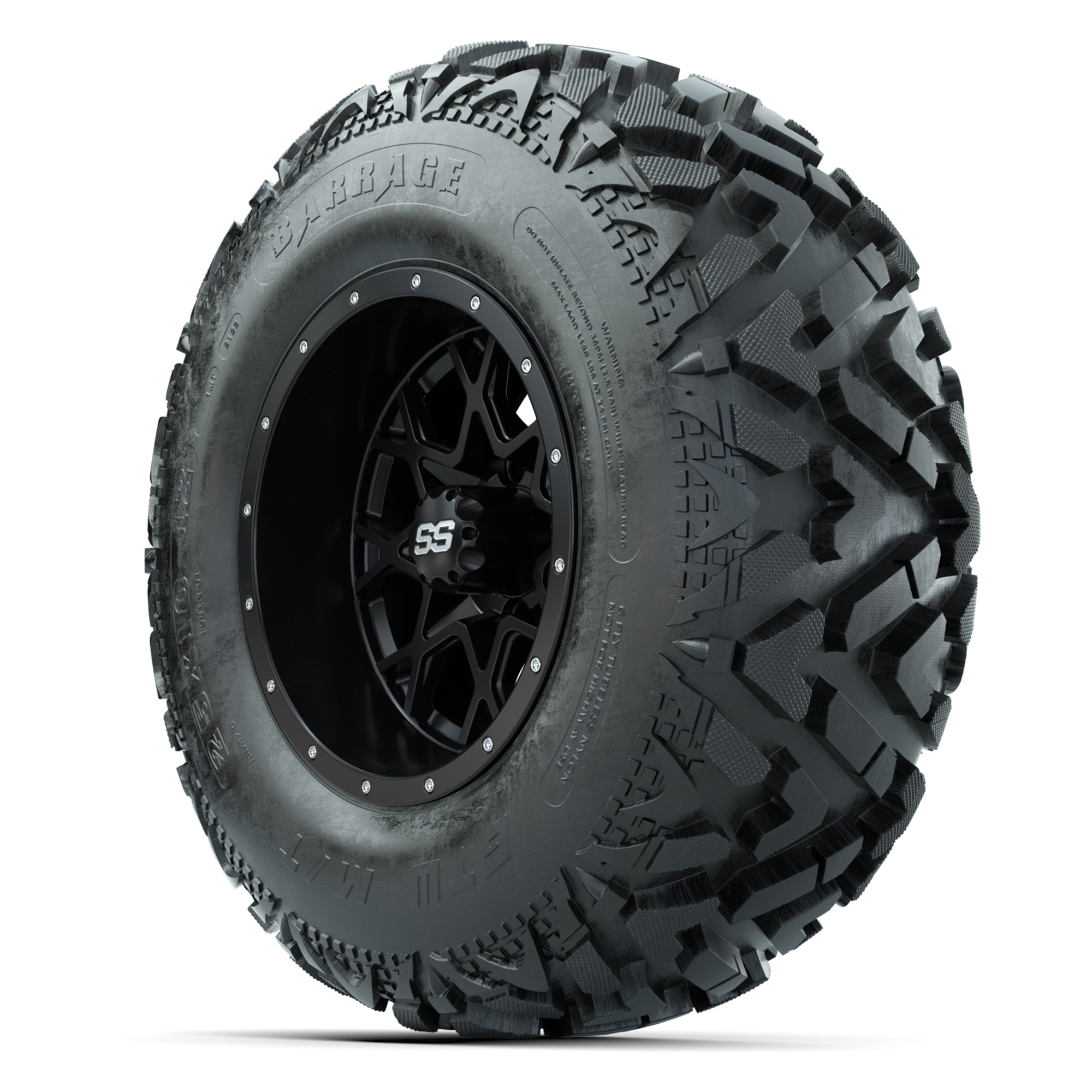 product GTW® Vortex 2 Matte Black 12 in Wheels with 25X10-12 Barrage Mud Tires – Full SetItem # A19-1963A set of (4) 12-inch GTW® Vorex 2 Matte Black golf cart wheels mounted on 25X10-12 GTW® Barrage Mud TiresTread Classification:All-Terrain / Off-RoadFull Tire & Wheel Package Includes:(4) 12x7 GTW® Vortex 2 Wheels / Matte Black finish / Offset: 3:4 (ET -.25)(4) 25X10-12 Barrage Mud Tires / Tire is approx. 25" tall (4-Ply)(4) Center capsPlease Note: All Wheels are 4 on 4 Hole / Lug Pattern unless otherwise specified.Tech Tips:This Tire & Wheel Combo Requires a Lift Kit (Tire is approx. 25" OD)Please Check and Adjust PSI in Tires Before Operation (Recommended Inflation Can Be Found on Sidewall of Tire)Tire & Wheel Packages are mounted and Inflated Before Shipping, Free of ChargeAll Wheels Have a lug pattern of "4x101.6mm"Lug Nuts Sold SeparatelyStandard Black Lug Nuts #LUG16SBMetric Black Lug Nuts #LUG16MB (Yamaha Models) Find A Dealer