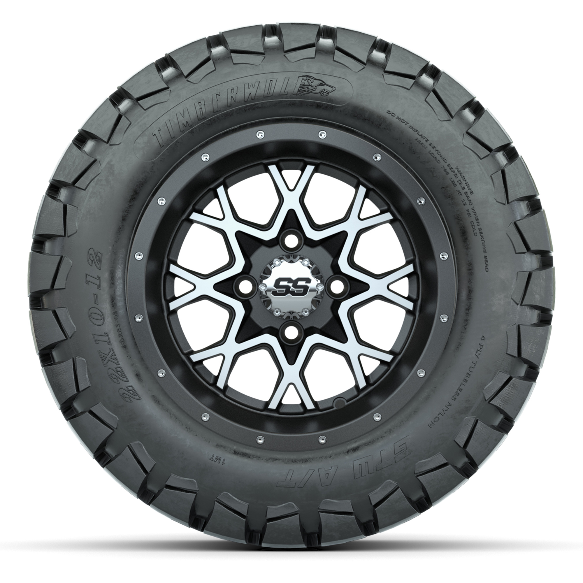 product GTW® Vortex 2 Matte Gray/Machined 12 in Wheels with 22X10-12 Timberwolf All-Terrain Tires – Full SetItem # A19-1989A set of (4) 12-inch GTW® Vortex 2 Matte Gray/Machined golf cart wheels mounted on 22x10-12 GTW® Timberwolf all-terrain tiresTread Classification:All-Terrain / Off-RoadFull Tire & Wheel Package Includes:(4) 12x7 GTW® Vortex 2 Wheels / Matte Gray & Machined finish / Offset: 3:4 (ET -.25)(4) 22x10-12 GTW® Timberwolf All-Terrain Tires / Tire is approx. 22" tall (4-Ply)(4) Center capsPlease Note: All Wheels are 4 on 4 Hole / Lug Pattern unless otherwise specified.Tech Tips:This Tire & Wheel Combo Requires a Lift Kit (Tire is approx. 22" OD)Please Check and Adjust PSI in Tires Before Operation (Recommended Inflation Can Be Found on Sidewall of Tire)Tire & Wheel Packages are mounted and Inflated Before Shipping, Free of ChargeAll Wheels Have a lug pattern of "4x101.6mm"Lug Nuts Sold SeparatelyStandard Black Lug Nuts #LUG16SBMetric Black Lug Nuts #LUG16MB (Yamaha Models) Find A Dealer
