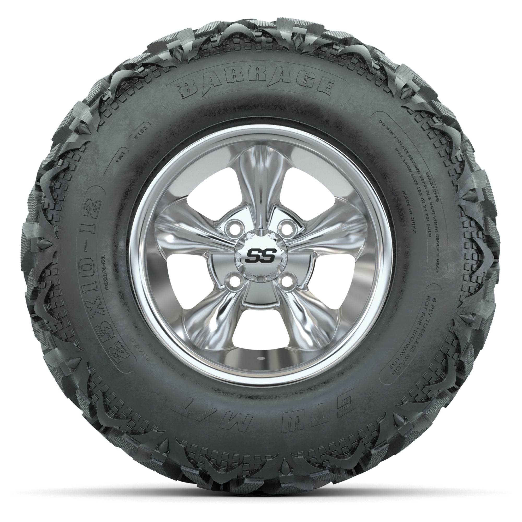 product GTW® Godfather Chrome 12 in Wheels with 25X10-12 Barrage Mud Tires – Full SetItem # A19-2021A set of (4) 12-inch GTW® Godfather Chrome golf cart wheels mounted on 25X10-12 GTW® Barrage Mud TiresTread Classification:All-Terrain / Off-RoadFull Tire & Wheel Package Includes:(4) 12x7 GTW® Godfather Wheels / Chrome finish / Offset: 3:4 (ET -.25)(4) 25X10-12 Barrage Mud Tires / Tire is approx. 25" tall (4-Ply)(4) Center capsPlease Note: All Wheels are 4 on 4 Hole / Lug Pattern unless otherwise specified.Tech Tips:This Tire & Wheel Combo Requires a Lift Kit (Tire is approx. 25" OD)Please Check and Adjust PSI in Tires Before Operation (Recommended Inflation Can Be Found on Sidewall of Tire)Tire & Wheel Packages are mounted and Inflated Before Shipping, Free of ChargeAll Wheels Have a lug pattern of "4x101.6mm"Lug Nuts Sold SeparatelyStandard Black Lug Nuts #LUG16SBMetric Black Lug Nuts #LUG16MB (Yamaha Models) Find A Dealer