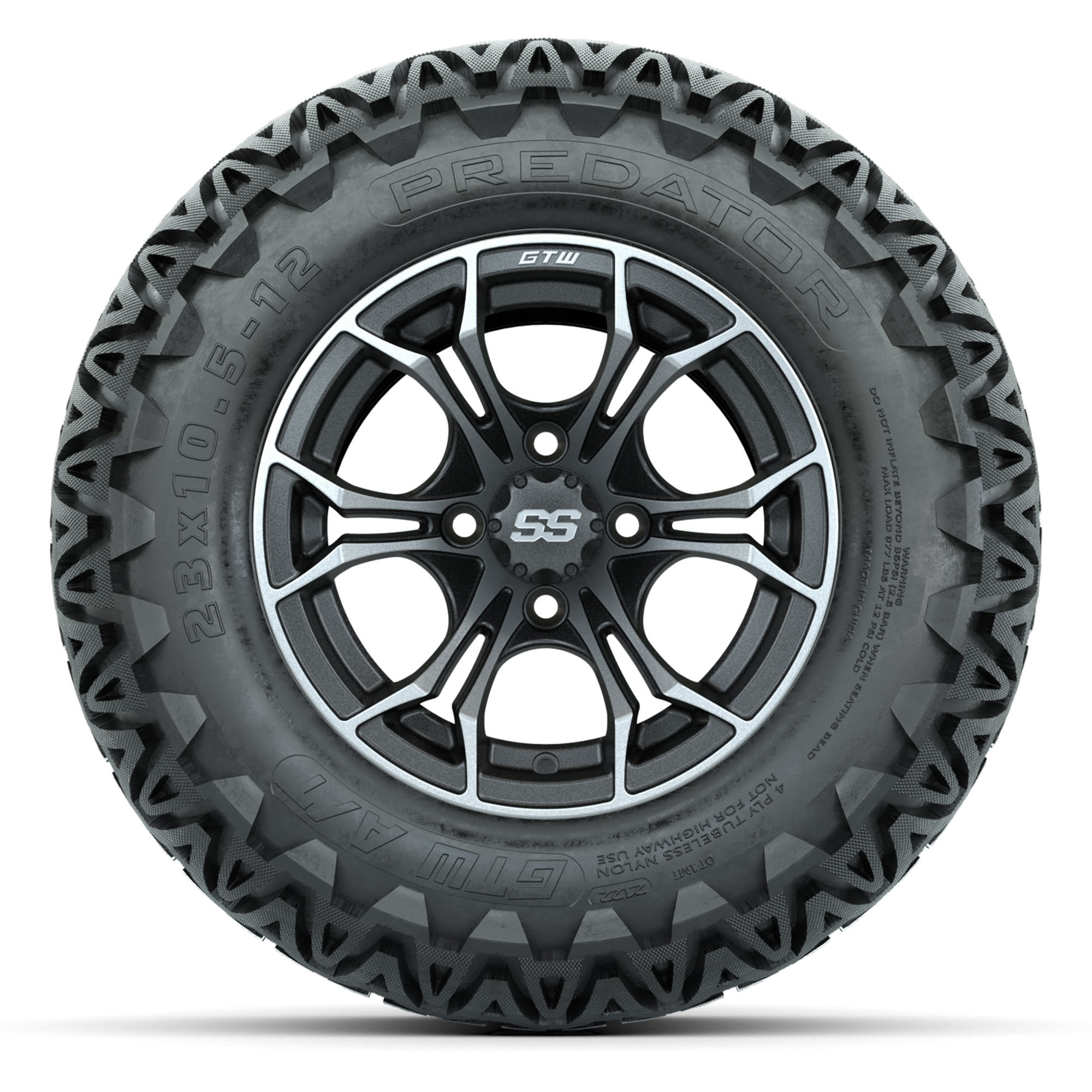 product GTW® Spyder Matte Gray/Machined 12 in Wheels with 23X10.5-12 Predator All-Terrain Tires – Full SetItem # A19-2075A set of (4) 12-inch GTW® Spyder Matte Gray/Machined golf cart wheels mounted on 23x10.5-12 GTW® Predator all-terrain tiresTread Classification:All-Terrain/Off-RoadFull kit includes:(4) 12” GTW® Spyder Wheels / Matte Gray & Machined Finish / Offset: 3:4 (ET -.25)(4) 23/10.5-12 GTW® Predator All-Terrain Tires / Tire is approx. 23” tall (4-Ply)(4) Color match capsLug nuts sold separatelyPlease Note: All Wheels are 4 on 4 Hole / Lug Pattern (4x101.6mm) unless otherwise specified.Tech Tips:We Recommend a Lift Kit for This Tire & Wheel KitTire & Wheel Combos are mounted and Inflated Before Shipping, Free of ChargePlease Check and Adjust PSI in Tires Before Operation (Recommended Inflation Can Be Found on Sidewall of Tire)All Wheels Have a lug pattern of "4x101.6mm"Lug Nuts Sold Separately:Standard: #LUG4S (Standard Chrome Lug Nuts) Metric: #LUG4M (Yamaha Models) Find A Dealer