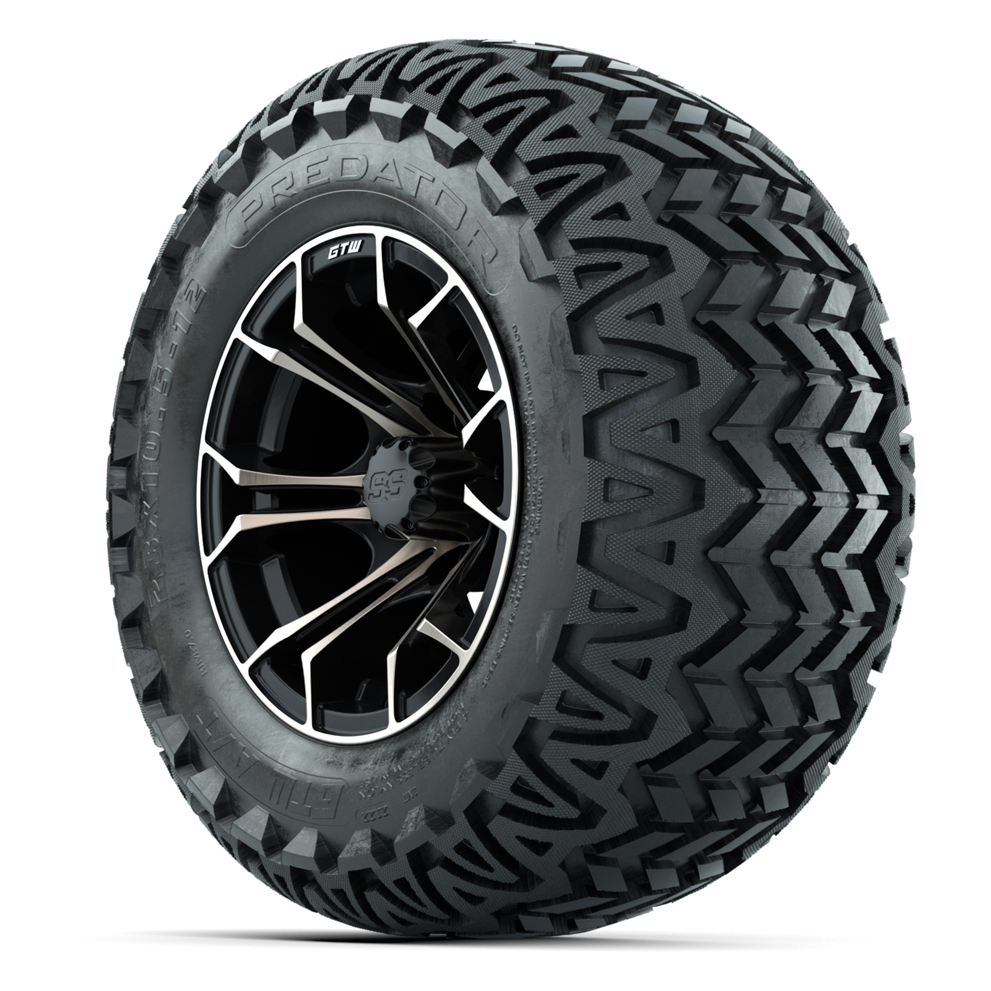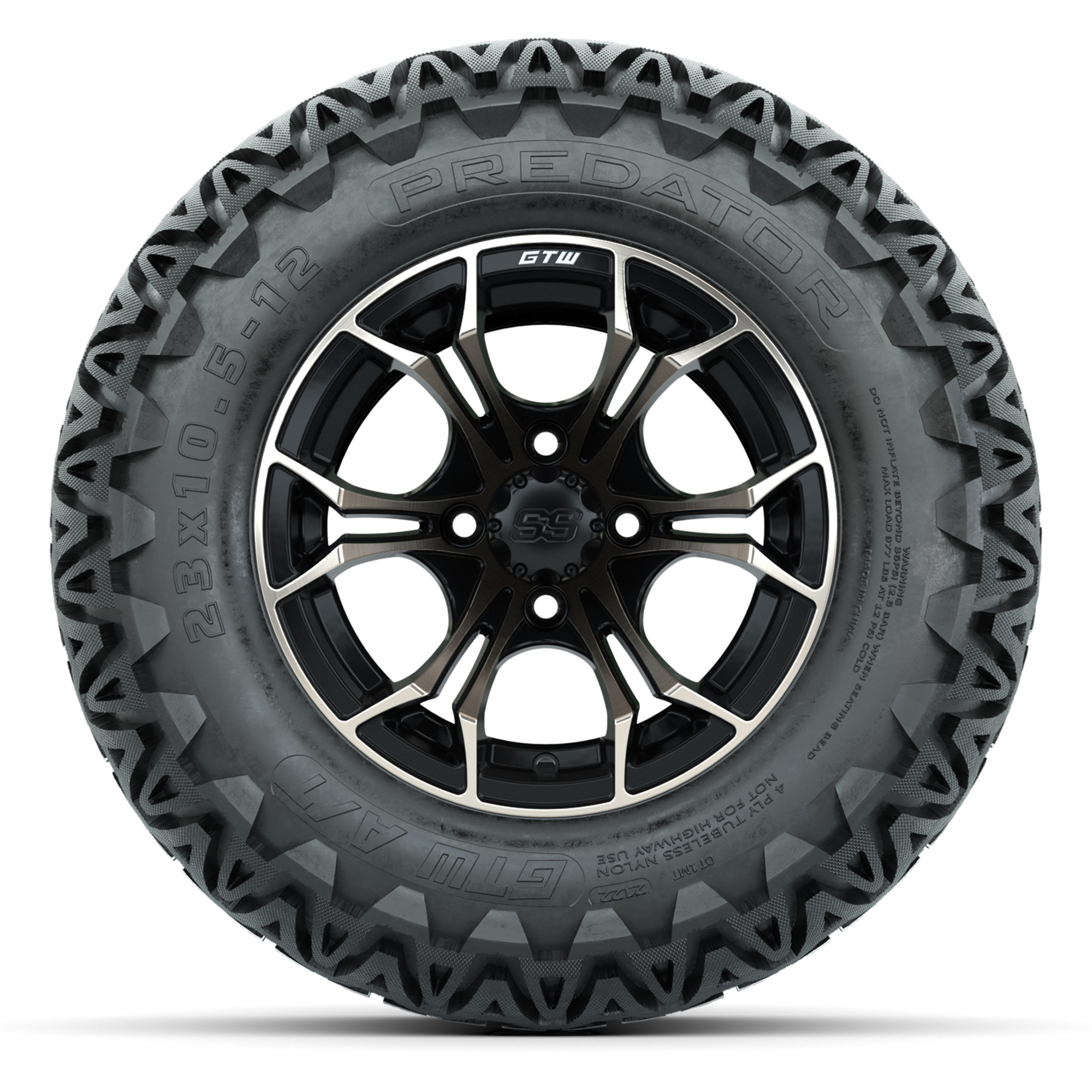 product GTW® Spyder Matte Black/Bronze 12 in Wheels with 23X10.5-12 Predator All-Terrain Tires – Full SetItem # A19-2086A set of (4) 12-inch GTW® Spyder Matte Black/Bronze golf cart wheels mounted on 23x10.5-12 GTW® Predator all-terrain tiresTread Classification:All-Terrain/Off-RoadFull kit includes:(4) 12” GTW® Spyder Wheels / Matte Black & Bronze Finish / Offset: 3:4 (ET -.25)(4) 23/10.5-12 GTW® Predator All-Terrain Tires / Tire is approx. 23” tall (4-Ply)(4) Color match capsLug nuts sold separatelyPlease Note: All Wheels are 4 on 4 Hole / Lug Pattern (4x101.6mm) unless otherwise specified.Tech Tips:We Recommend a Lift Kit for This Tire & Wheel KitTire & Wheel Combos are mounted and Inflated Before Shipping, Free of ChargePlease Check and Adjust PSI in Tires Before Operation (Recommended Inflation Can Be Found on Sidewall of Tire)All Wheels Have a lug pattern of "4x101.6mm"Lug Nuts Sold Separately:Standard: #LUG4S (Standard Chrome Lug Nuts) Metric: #LUG4M (Yamaha Models) Find A Dealer