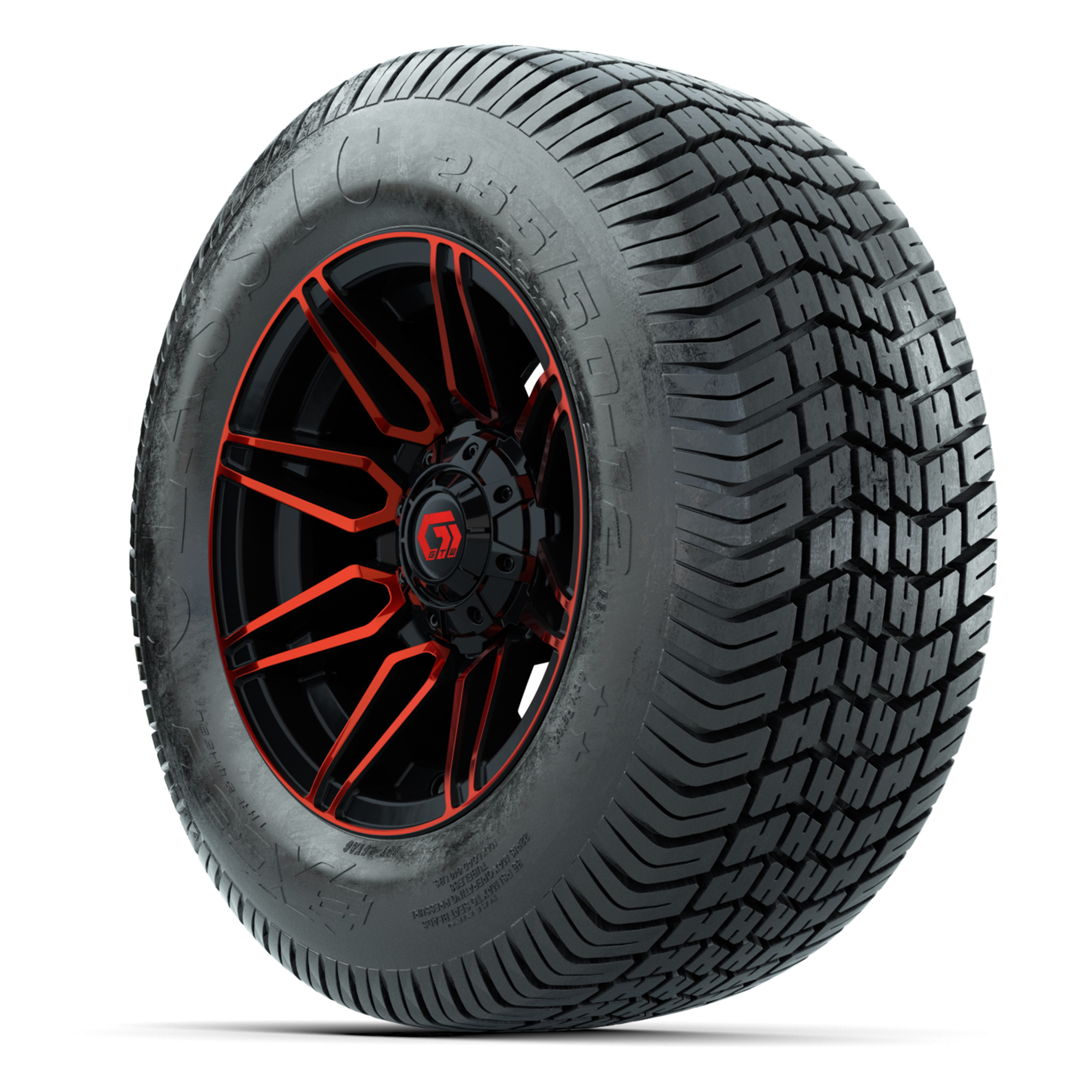 product GTW® Stealth Red/Machined 12 in Wheels with 255/50-12 Excel Classic Street Tires – Full SetItem # A19-2120A set of (4) 12-inch GTW® Stealth Red/Machined golf cart wheels mounted on 255/50-12 Excel Classic Street TiresTread Classification:Street/CourseFull kit includes:(4) 12” GTW® Stealth Wheels / Red/Machined Finish / Offset: 3:4 (ET -.25)(4) 255/50-12 Excel Classic Street Tires / Tire is approx. 23” tall (4-Ply)(4) Color match capsLug nuts sold separatelyPlease Note: All Wheels are 4 on 4 Hole / Lug Pattern (4x101.6mm) unless otherwise specified.Tech Tips:We Recommend a Lift Kit for This Tire & Wheel KitTire & Wheel Combos are mounted and Inflated Before Shipping, Free of ChargePlease Check and Adjust PSI in Tires Before Operation (Recommended Inflation Can Be Found on Sidewall of Tire)All Wheels Have a lug pattern of "4x101.6mm"Lug Nuts Sold Separately:Standard: #LUG4S (Standard Chrome Lug Nuts) Metric: #LUG4M (Yamaha Models) Find A Dealer