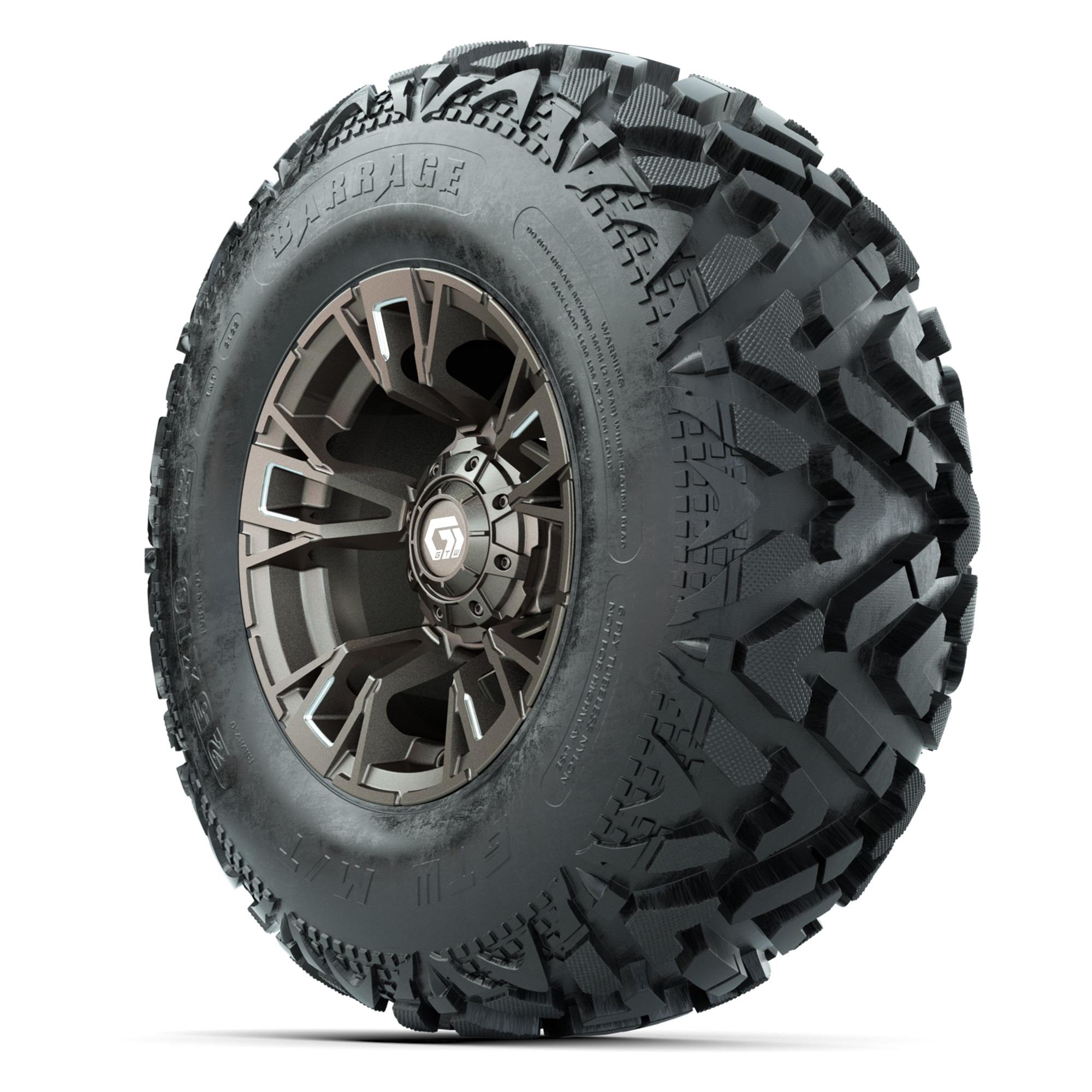 product GTW® Vandal Bronze/Machined 12 in Wheels with 25X10-12 Barrage Mud Tires – Full SetItem # A19-2151A set of (4) 12-inch GTW® Vandal Bronze/Machined golf cart wheels mounted on 25X10-12 GTW® Barrage Mud TiresTread Classification:All-Terrain / Off-RoadFull Tire & Wheel Package Includes:(4) 12x7 GTW® Vandal Wheels / Bronze & Machined finish / Offset: 3:4 (ET -.25)(4) 25X10-12 Barrage Mud Tires / Tire is approx. 25" tall (4-Ply)(4) Center capsPlease Note: All Wheels are 4 on 4 Hole / Lug Pattern unless otherwise specified.Tech Tips:This Tire & Wheel Combo Requires a Lift Kit (Tire is approx. 25" OD)Please Check and Adjust PSI in Tires Before Operation (Recommended Inflation Can Be Found on Sidewall of Tire)Tire & Wheel Packages are mounted and Inflated Before Shipping, Free of ChargeAll Wheels Have a lug pattern of "4x101.6mm"Lug Nuts Sold SeparatelyStandard Black Lug Nuts #LUG16SBMetric Black Lug Nuts #LUG16MB (Yamaha Models) Find A Dealer
