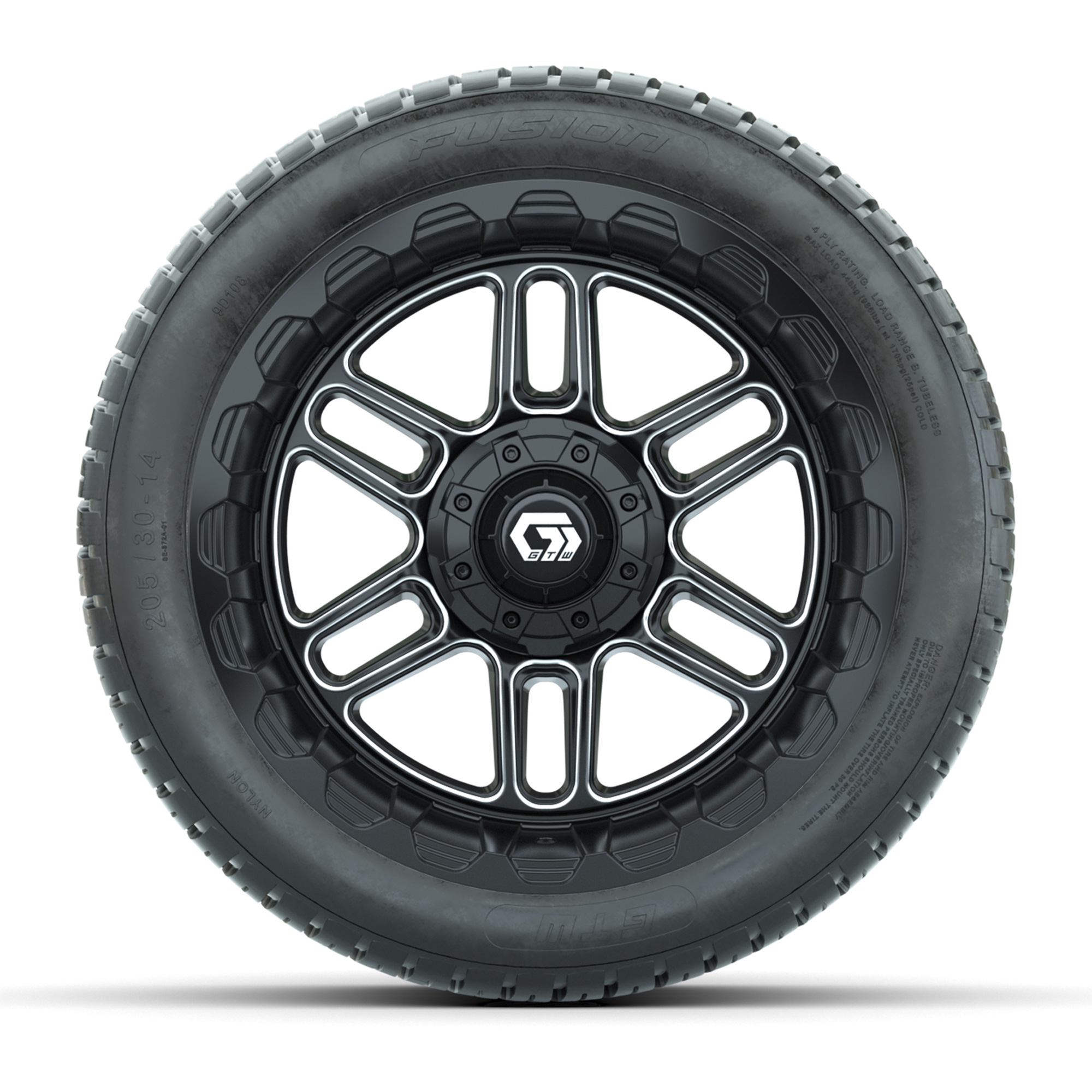 product GTW® Titan Black/Machined 14 in Wheels with 205/30-R14 Fusion Street Tires – Full SetItem # A19-2263A set of (4) 14-inch GTW® Titan Black/Machined golf cart wheels mounted on 205/30-14 Fusion Street TiresTread Classification:Street/CourseFull kit includes:(4) 14” GTW® Titan Wheels / Black/Machined Finish / Offset: 3:4 (ET -.25)(4) 205/30-14 GTW® Fusion Street Tires / Tire is approx. 19” tall (4-Ply)(4) Color match capsLug nuts sold separatelyPlease Note: All Wheels are 4 on 4 Hole / Lug Pattern (4x101.6mm) unless otherwise specified.Tech Tips:This Tire & Wheel Combo Does not require a lift kitTire & Wheel Combos are mounted and Inflated Before Shipping, Free of ChargePlease Check and Adjust PSI in Tires Before Operation (Recommended Inflation Can Be Found on Sidewall of Tire)All Wheels Have a lug pattern of "4x101.6mm"Lug Nuts Sold Separately:Standard: #LUG4S (Standard Chrome Lug Nuts) Metric: #LUG4M (Yamaha Models) Find A Dealer