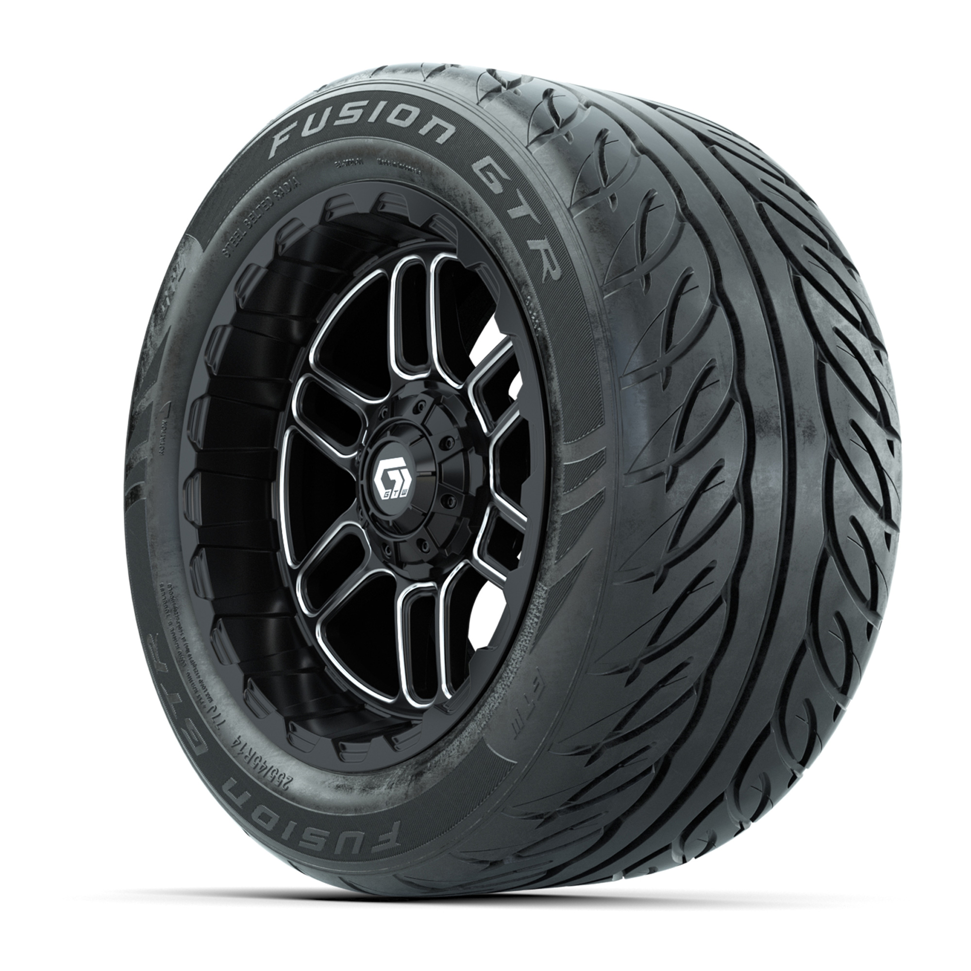 product GTW® Titan Black/Machined 14 in Wheels with 255/45-R14 Fusion GTR Steel Belt Radial Street Tires – Full SetItem # A19-2264A set of (4) 14-inch GTW® Titan Black/Machined golf cart wheels mounted on 255/45-R14 Fusion GTR Steel Belt Radial Street TiresTread Classification:Street/CourseFull kit includes:(4) 14” GTW® Titan Wheels / Black/Machined Finish / Offset: 3:4 (ET -.25)(4) 255/45-R14 GTW® Fusion GTR Steel Belt Radial Street Tires / Tire is approx. 23” tall (4-Ply)(4) Color match capsLug nuts sold separatelyPlease Note: All Wheels are 4 on 4 Hole / Lug Pattern (4x101.6mm) unless otherwise specified.Tech Tips:We Recommend a Lift Kit for This Tire & Wheel KitTire & Wheel Combos are mounted and Inflated Before Shipping, Free of ChargePlease Check and Adjust PSI in Tires Before Operation (Recommended Inflation Can Be Found on Sidewall of Tire)All Wheels Have a lug pattern of "4x101.6mm"Lug Nuts Sold Separately:Standard: #LUG4S (Standard Chrome Lug Nuts) Metric: #LUG4M (Yamaha Models) Find A Dealer