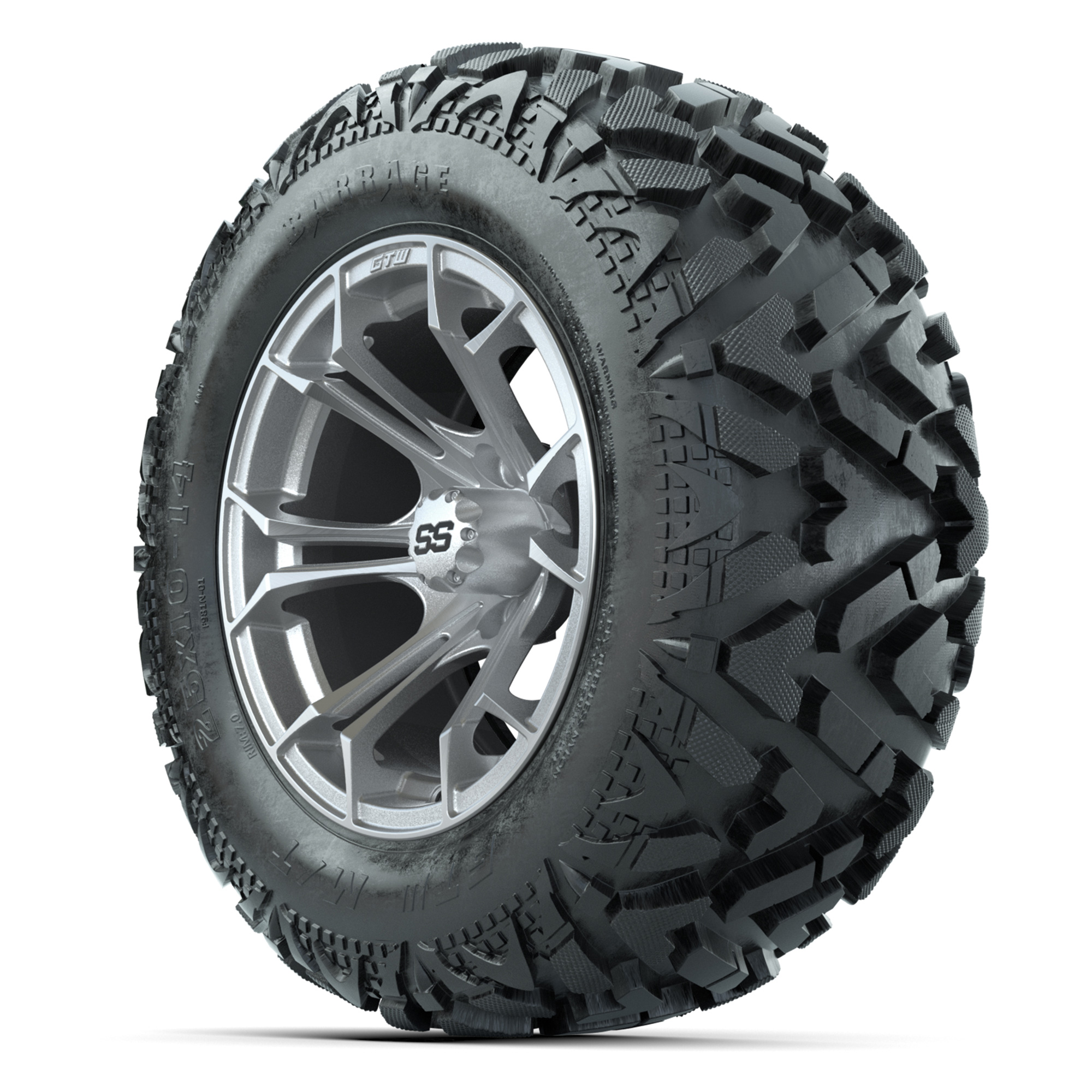 product GTW Spyder Silver Brush 14 in Wheels with 25x10-14 Barrage Mud Tires – Full SetItem # A19-2280Tread Classification:All-Terrain / MudFull kit includes:(4) 14” GTW® Spyder Wheels / Silver Brush Finish / Offset: 3:4 (ET -.25)(4) 25x10-14 GTW® Barrage Mud Tires / Tire is approx. 25” tall (4-Ply)(4) Color match capsLug nuts sold separatelyPlease Note: All Wheels are 4 on 4 Hole / Lug Pattern (4x101.6mm) unless otherwise specified.Tech Tips:We Recommend a Lift Kit for This Tire & Wheel KitTire & Wheel Combos are mounted and Inflated Before Shipping, Free of ChargePlease Check and Adjust PSI in Tires Before Operation (Recommended Inflation Can Be Found on Sidewall of Tire)All Wheels Have a lug pattern of "4x101.6mm"Lug Nuts Sold Separately:Standard: #LUG4S (Standard Chrome Lug Nuts) Metric: #LUG4M (Yamaha Models) Find A Dealer