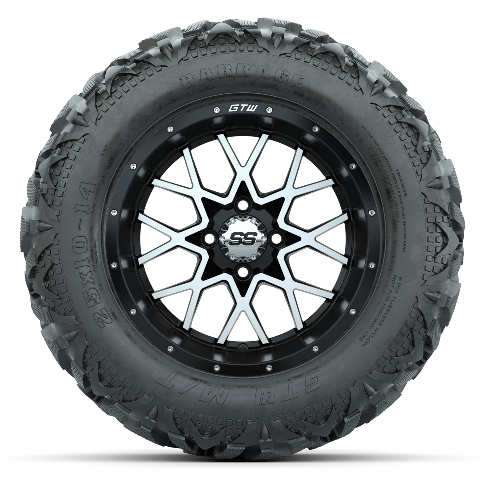 product GTW Vortex Matte Black/Machined 14 in Wheels with 25x10-14 Barrage Mud Tires – Full SetItem # A19-2444Tread Classification:All-Terrain / MudFull kit includes:(4) 14” GTW® Vortex Wheels / Matte Black/Machined Finish / Offset: 3:4 (ET -.25)(4) 25x10-14 GTW® Barrage Mud Tires / Tire is approx. 25” tall (4-Ply)(4) Color match capsLug nuts sold separatelyPlease Note: All Wheels are 4 on 4 Hole / Lug Pattern (4x101.6mm) unless otherwise specified.Tech Tips:We Recommend a Lift Kit for This Tire & Wheel KitTire & Wheel Combos are mounted and Inflated Before Shipping, Free of ChargePlease Check and Adjust PSI in Tires Before Operation (Recommended Inflation Can Be Found on Sidewall of Tire)All Wheels Have a lug pattern of "4x101.6mm"Lug Nuts Sold Separately:Standard: #LUG4S (Standard Chrome Lug Nuts) Metric: #LUG4M (Yamaha Models) Find A Dealer