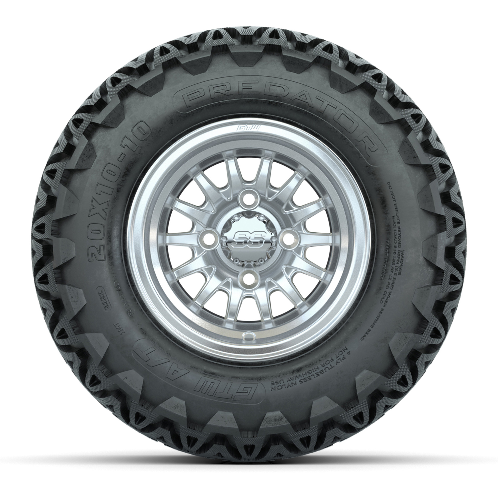 product GTW Medusa Silver and Machined Wheels with 20in Predator A-T Tires - 10 InchItem # A19-305A set of (4) 10-inch Medusa silver/machined lifted golf cart wheels on 20-inch A/T tiresTread Classification :All-Terrain / Off-RoadFull kit includes :(4) 10" Medusa Silver/Machined Wheels / Offset: 3:4 (ET -.25)(4) 20" Predator A/T Tires (4-Ply)(4) center caps Please Note: All Wheels are 4 on 4 Hole / Lug Pattern unless otherwise specified.Tech Tips:This Tire & Wheel Combo Requires a Lift Kit Tire & Wheel Combos are mounted and Inflated Before Shipping, Free of ChargePlease Check and Adjust PSI in Tires Before Operation (Recommended Inflation Can Be Found on Sidewall of Tire)All Wheels Have a lug pattern of "4x101.6mm"Lug Nuts Sold Separately:Standard Chrome Lug Nuts #LUG4SMetric Chrome Lug Nuts #LUG4M (Yamaha Models)Club Car Precedent / Onward / Tempo require a low pro lift kit for any 12” or larger TWA combos (#95560 Jake’s Lo Pro Lift) Find A Dealer