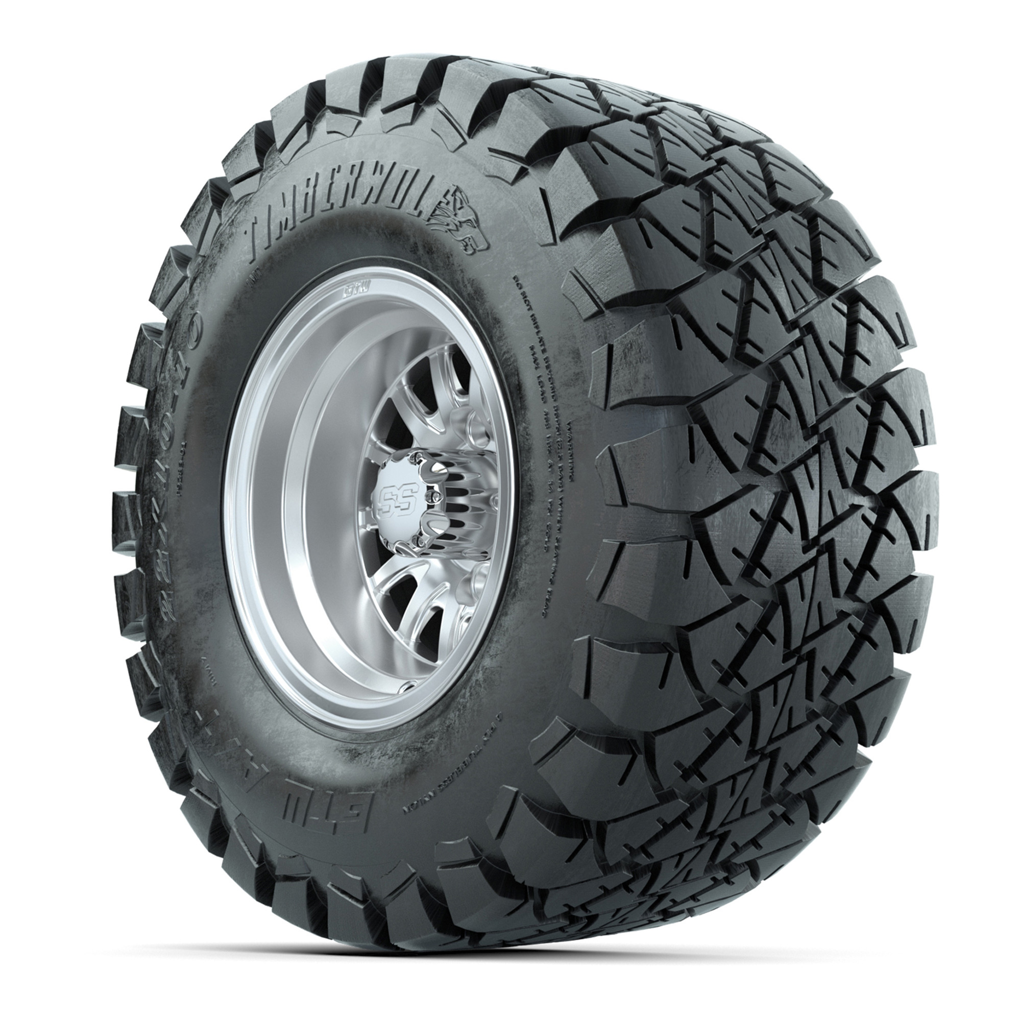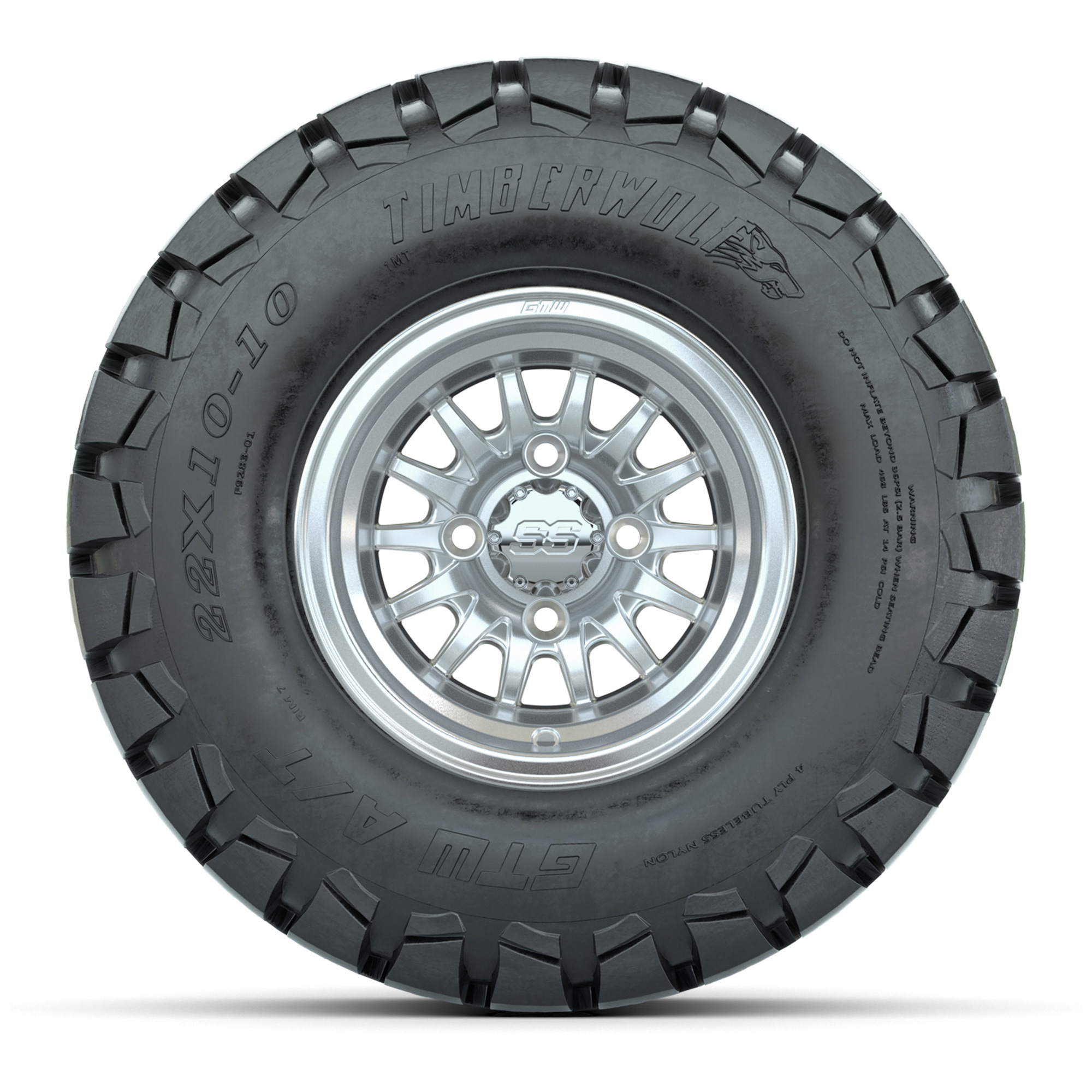 product GTW Medusa Silver and Machined Wheels with 22in Timberwolf Mud Tires - 10 InchItem # A19-307A set of (4) 10-inch Medusa silver/machined lifted golf cart wheels on 22-inch trail tiresTread Classification :Off-Road / MudFull kit includes :(4) 10" Medusa Silver/Machined Wheels / Offset: 3:4 (ET -.25)(4) 22" Timberwolf Mud Tires (4-Ply)(4) center caps Please Note: All Wheels are 4 on 4 Hole / Lug Pattern unless otherwise specified.Tech Tips:This Tire & Wheel Combo Requires a Lift Kit Tire & Wheel Combos are mounted and Inflated Before Shipping, Free of ChargePlease Check and Adjust PSI in Tires Before Operation (Recommended Inflation Can Be Found on Sidewall of Tire)All Wheels Have a lug pattern of "4x101.6mm"Lug Nuts Sold Separately:Standard Chrome Lug Nuts #LUG4SMetric Chrome Lug Nuts #LUG4M (Yamaha Models)Club Car Precedent / Onward / Tempo require a low pro lift kit for any 12” or larger TWA combos (#95560 Jake’s Lo Pro Lift) Find A Dealer