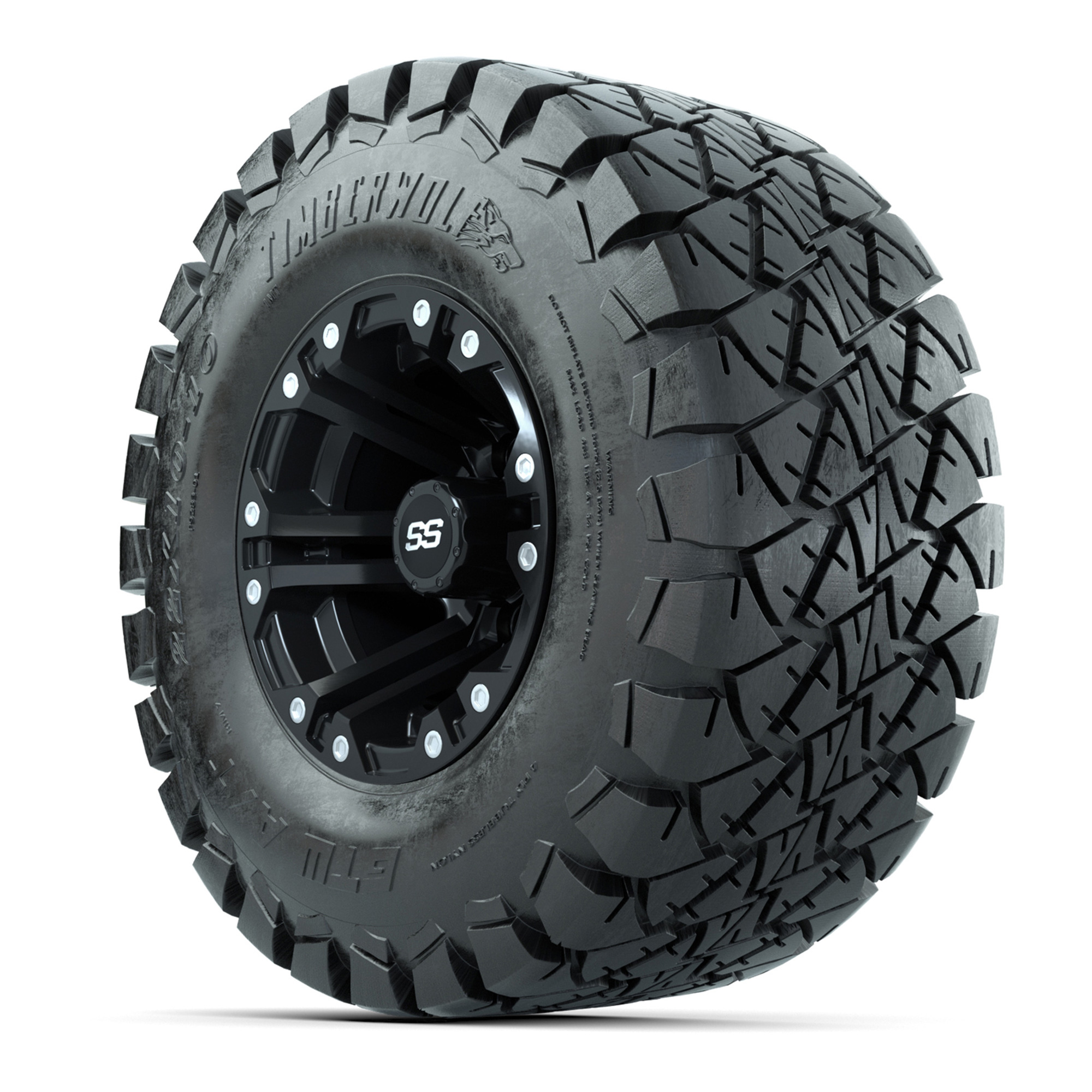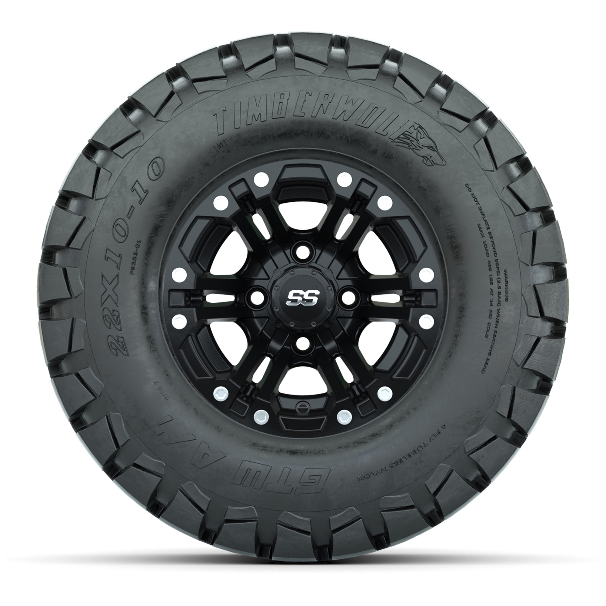 product GTW Specter Matte Black Wheels with 22in Timberwolf Mud Tires - 10 InchItem # A19-317A set of (4) 10-inch Specter matte black lifted golf cart wheels on 22-inch trail tiresTread Classification :Off-Road / MudFull kit includes :(4) 10" Specter Matte Black Wheels / Offset: 3:4 (ET -.25)(4) 22" Timberwolf Mud Tires (4-Ply)(4) center caps Please Note: All Wheels are 4 on 4 Hole / Lug Pattern unless otherwise specified.Tech Tips:This Tire & Wheel Combo Requires a Lift Kit Tire & Wheel Combos are mounted and Inflated Before Shipping, Free of ChargePlease Check and Adjust PSI in Tires Before Operation (Recommended Inflation Can Be Found on Sidewall of Tire)All Wheels Have a lug pattern of "4x101.6mm"Lug Nuts Sold Separately:Standard Chrome Lug Nuts #LUG4SMetric Chrome Lug Nuts #LUG4M (Yamaha Models)Club Car Precedent / Onward / Tempo require a low pro lift kit for any 12” or larger TWA combos (#95560 Jake’s Lo Pro Lift) Find A Dealer