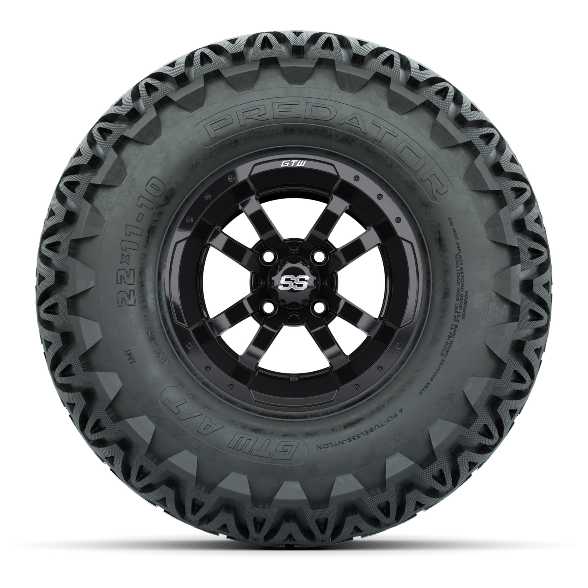product GTW Storm Trooper Black Wheels with 22in Predator A-T Tires - 10 InchItem # A19-331A set of (4) 10-inch Storm Trooper lifted golf cart wheels on 22-inch A/T tiresTread Classification :All-Terrain / Off-RoadFull kit includes :(4) 10" Storm Trooper Black Wheels / Offset: 3:4 (ET -.25)(4) 22" Predator A/T Tires (4-Ply)(4) center caps Please Note: All Wheels are 4 on 4 Hole / Lug Pattern unless otherwise specified.Tech Tips:This Tire & Wheel Combo Requires a Lift Kit Tire & Wheel Combos are mounted and Inflated Before Shipping, Free of ChargePlease Check and Adjust PSI in Tires Before Operation (Recommended Inflation Can Be Found on Sidewall of Tire)All Wheels Have a lug pattern of "4x101.6mm"Lug Nuts Sold Separately:Standard Chrome Lug Nuts #LUG4SMetric Chrome Lug Nuts #LUG4M (Yamaha Models)Club Car Precedent / Onward / Tempo require a low pro lift kit for any 12” or larger TWA combos (#95560 Jake’s Lo Pro Lift) Find A Dealer