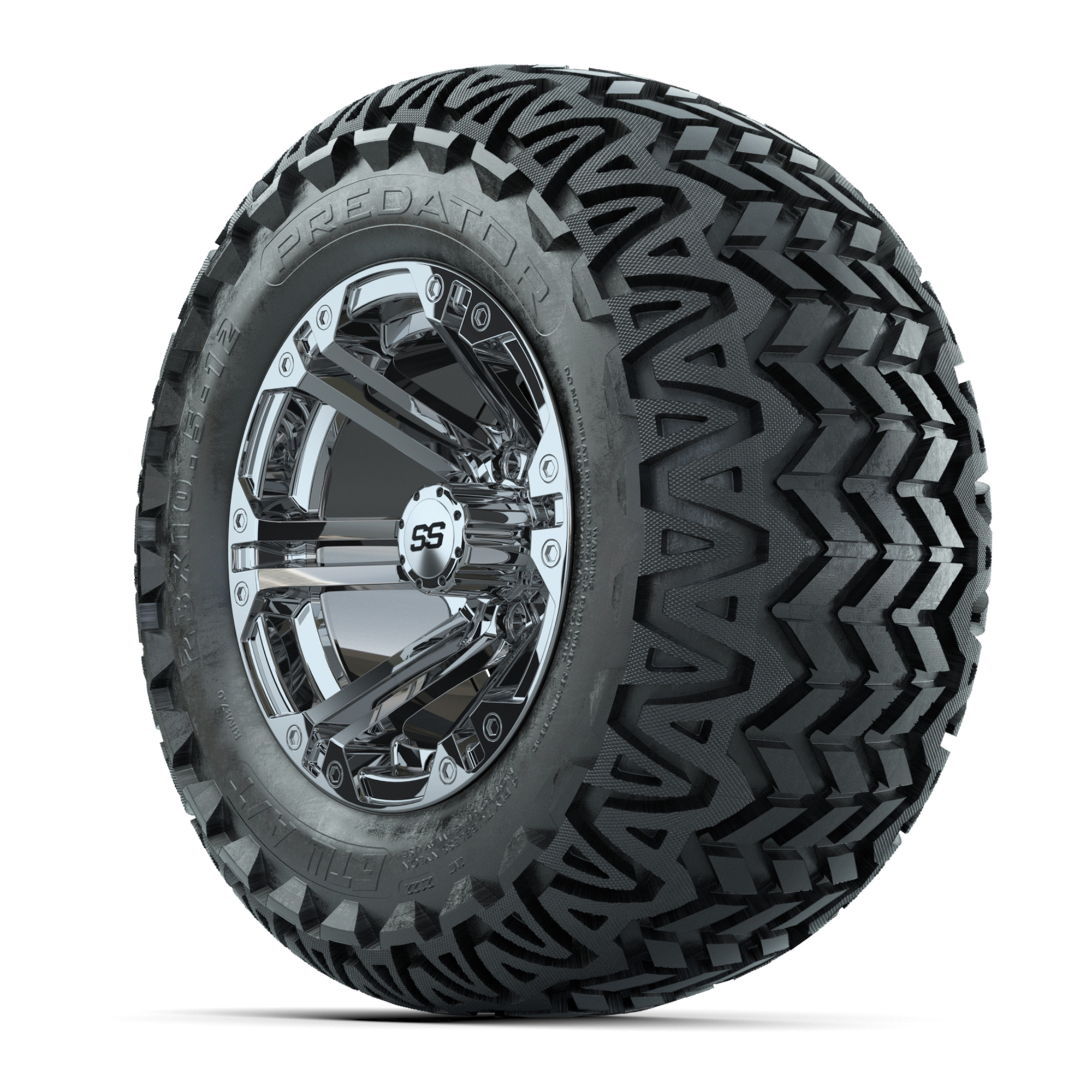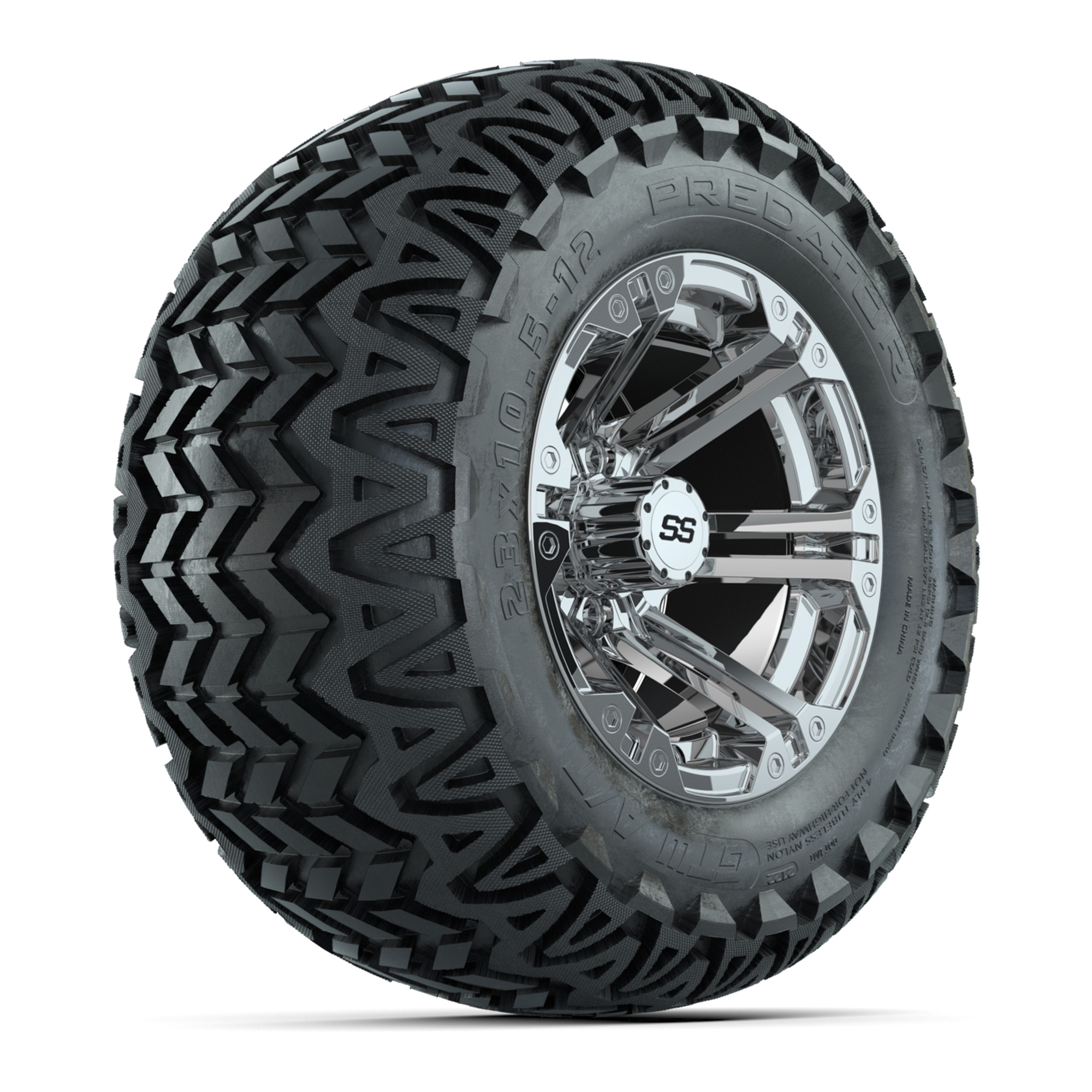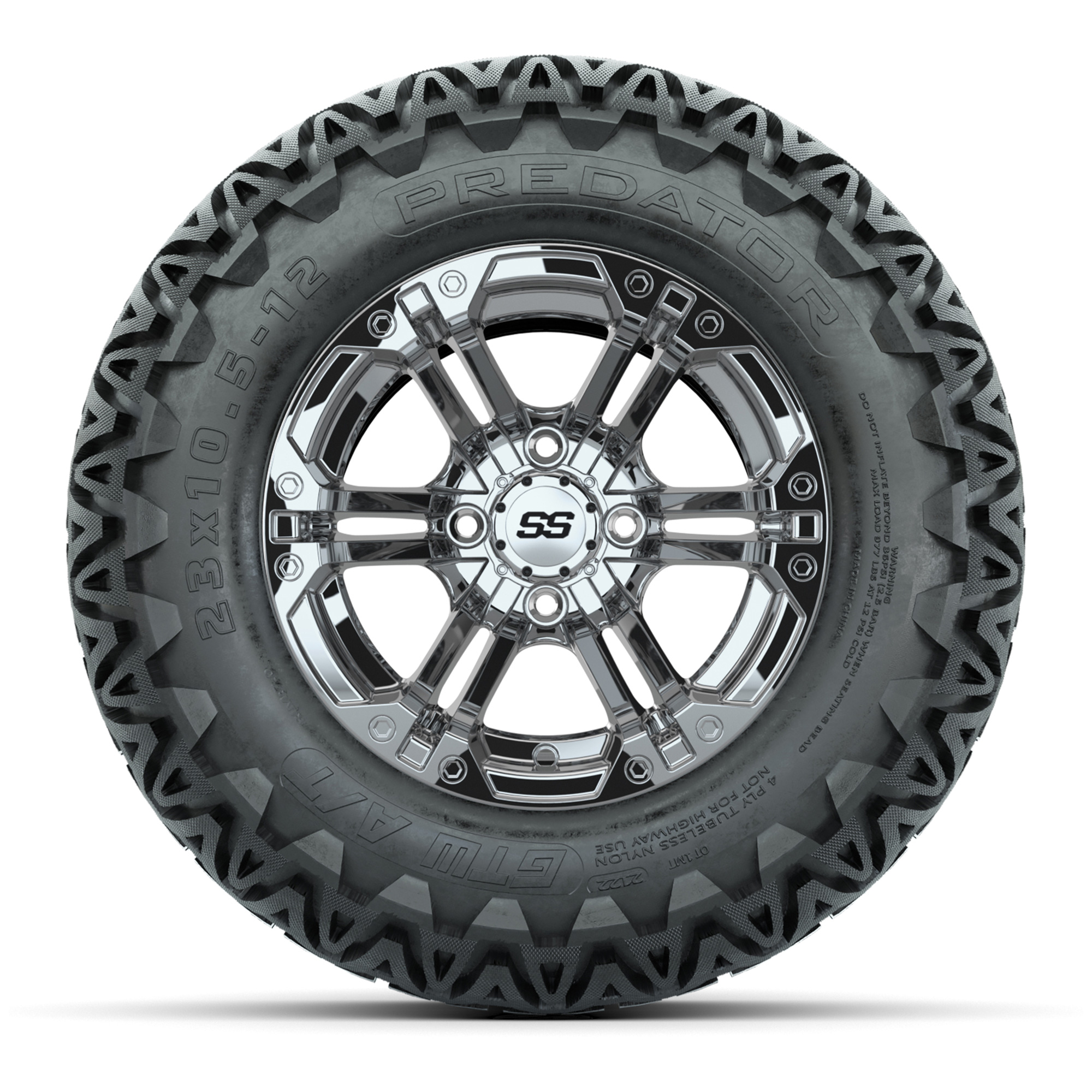 product GTW Specter Chrome Wheels with 23in Predator A-T Tires - 12 InchItem # A19-345A set of (4) 12-inch Specter chrome finish lifted golf cart wheels on 23-inch A/T tiresTread Classification :All-Terrain / Off-RoadFull kit includes :(4) 12" Specter Chrome Wheels / Offset: 3:4 (ET -.25)(4) 23" Predator A/T Tires (4-Ply)(4) center caps Please Note: All Wheels are 4 on 4 Hole / Lug Pattern unless otherwise specified.Tech Tips:This Tire & Wheel Combo Requires a Lift Kit Tire & Wheel Combos are mounted and Inflated Before Shipping, Free of ChargePlease Check and Adjust PSI in Tires Before Operation (Recommended Inflation Can Be Found on Sidewall of Tire)All Wheels Have a lug pattern of "4x101.6mm"Lug Nuts Sold Separately:Standard Chrome Lug Nuts #LUG4SMetric Chrome Lug Nuts #LUG4M (Yamaha Models)Club Car Precedent / Onward / Tempo require a low pro lift kit for any 12” or larger TWA combos (#95560 Jake’s Lo Pro Lift) Find A Dealer