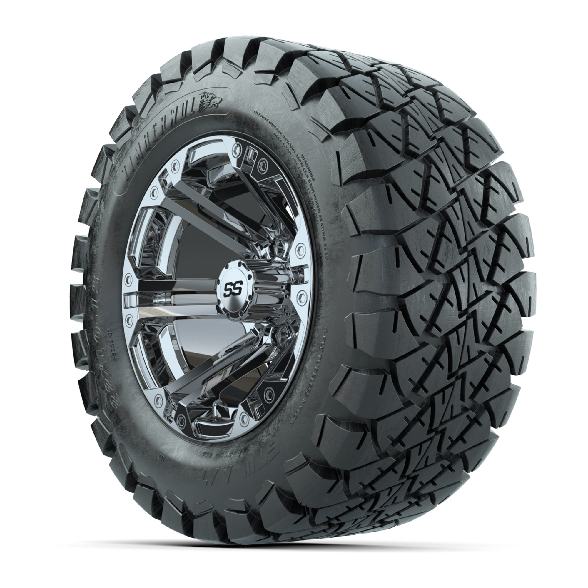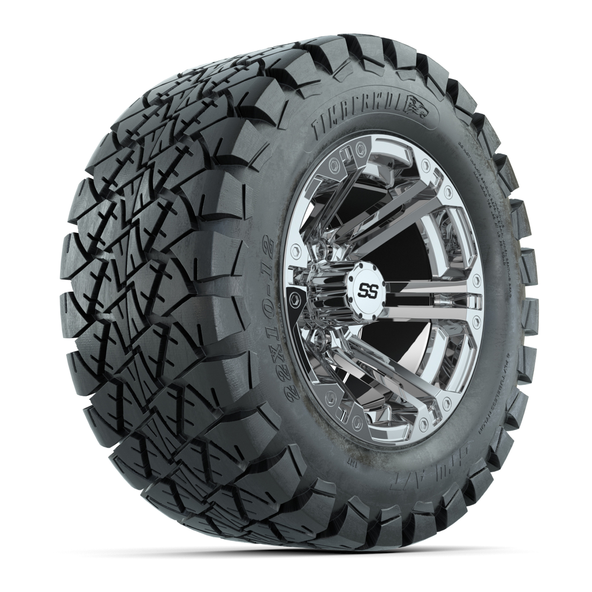 A set of (4) 12-inch Specter chrome finish lifted golf cart wheels on 22-inch trail tires