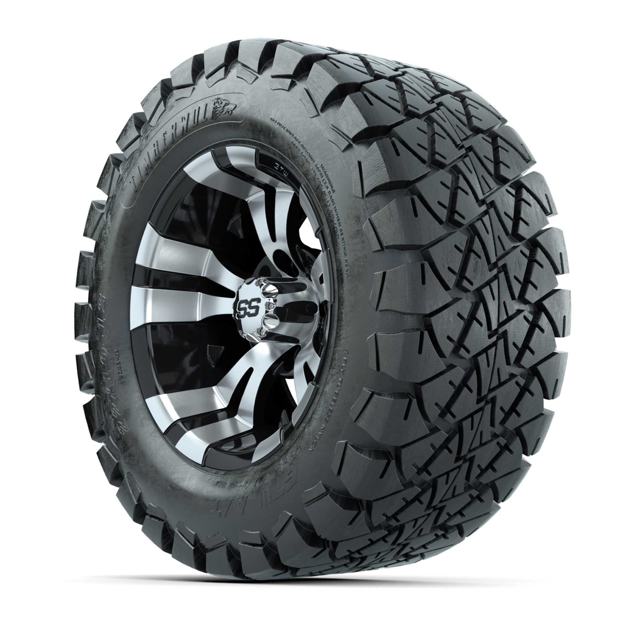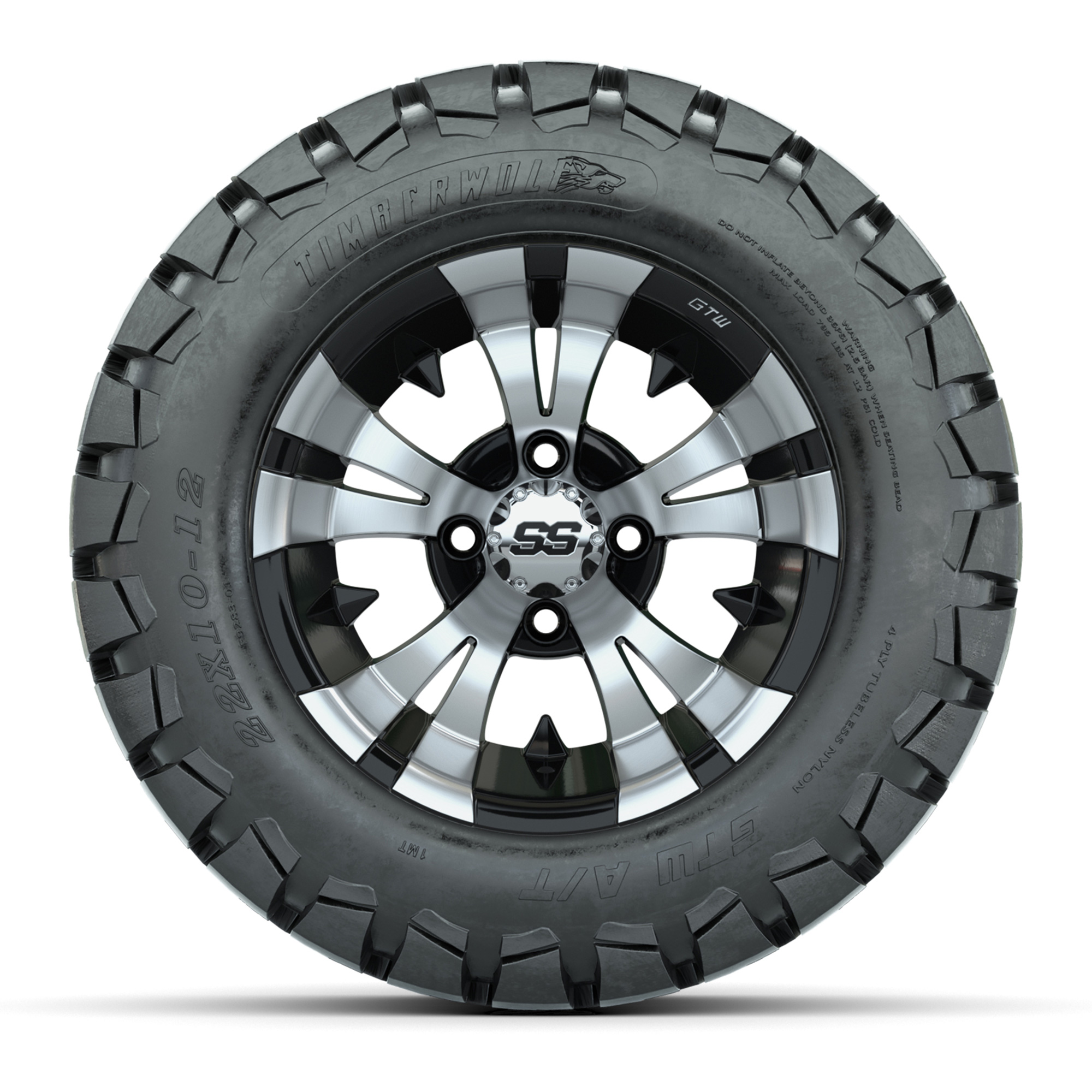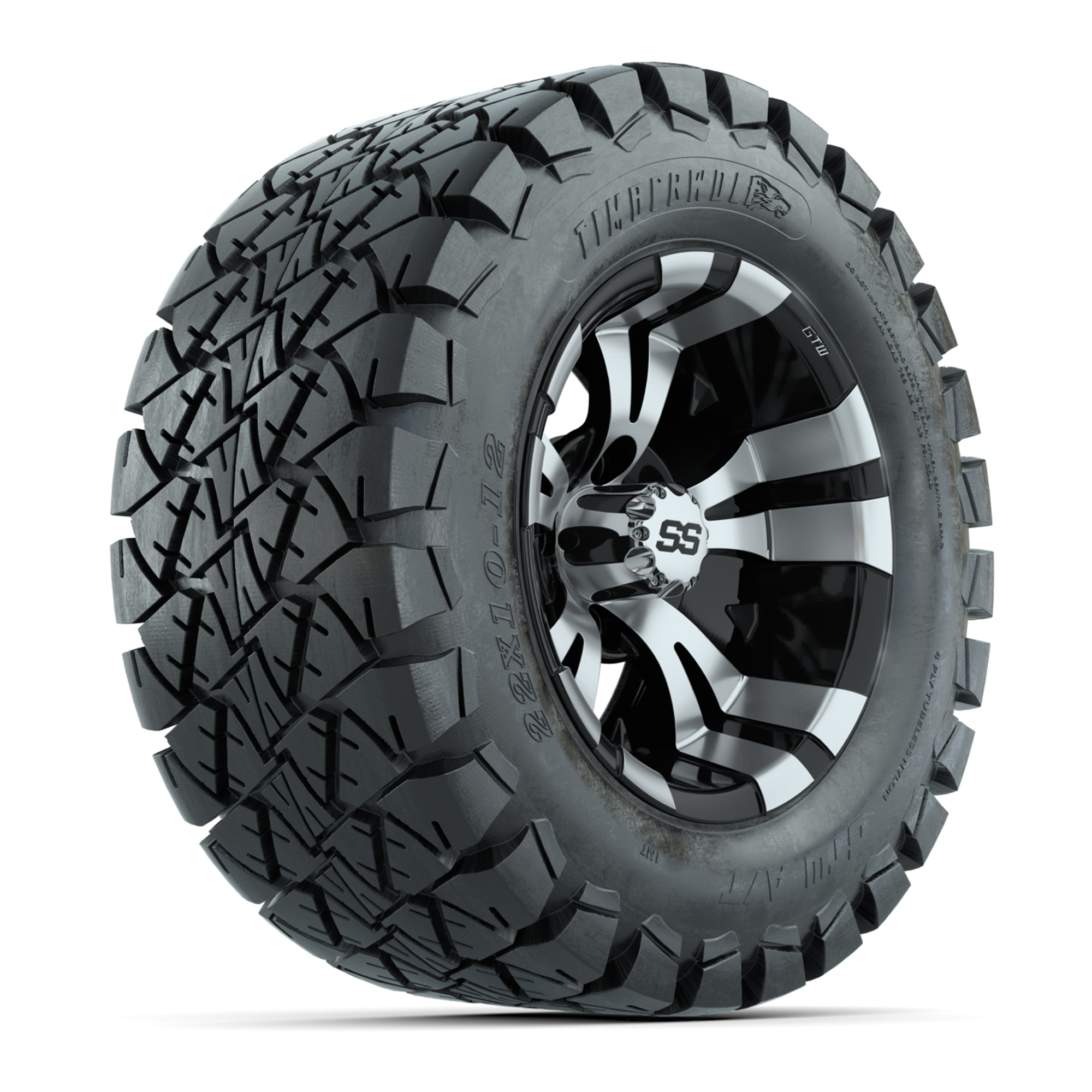 product GTW Vampire Black and Machined Wheels with 22in Timberwolf Mud Tires - 12 InchItem # A19-371A set of (4) 12-inch Vampire black/machined lifted golf cart wheels on 22-inch trail tiresTread Classification :Off-Road / MudFull kit includes :(4) 12" Vampire Black/Machined Wheels / Offset: 3:4 (ET -.25)(4) 22" Timberwolf Mud Tires (4-Ply)(4) center caps Please Note: All Wheels are 4 on 4 Hole / Lug Pattern unless otherwise specified.Tech Tips:This Tire & Wheel Combo Requires a Lift Kit Tire & Wheel Combos are mounted and Inflated Before Shipping, Free of ChargePlease Check and Adjust PSI in Tires Before Operation (Recommended Inflation Can Be Found on Sidewall of Tire)All Wheels Have a lug pattern of "4x101.6mm"Lug Nuts Sold Separately:Standard Chrome Lug Nuts #LUG4SMetric Chrome Lug Nuts #LUG4M (Yamaha Models)Club Car Precedent / Onward / Tempo require a low pro lift kit for any 12” or larger TWA combos (#95560 Jake’s Lo Pro Lift) Find A Dealer
