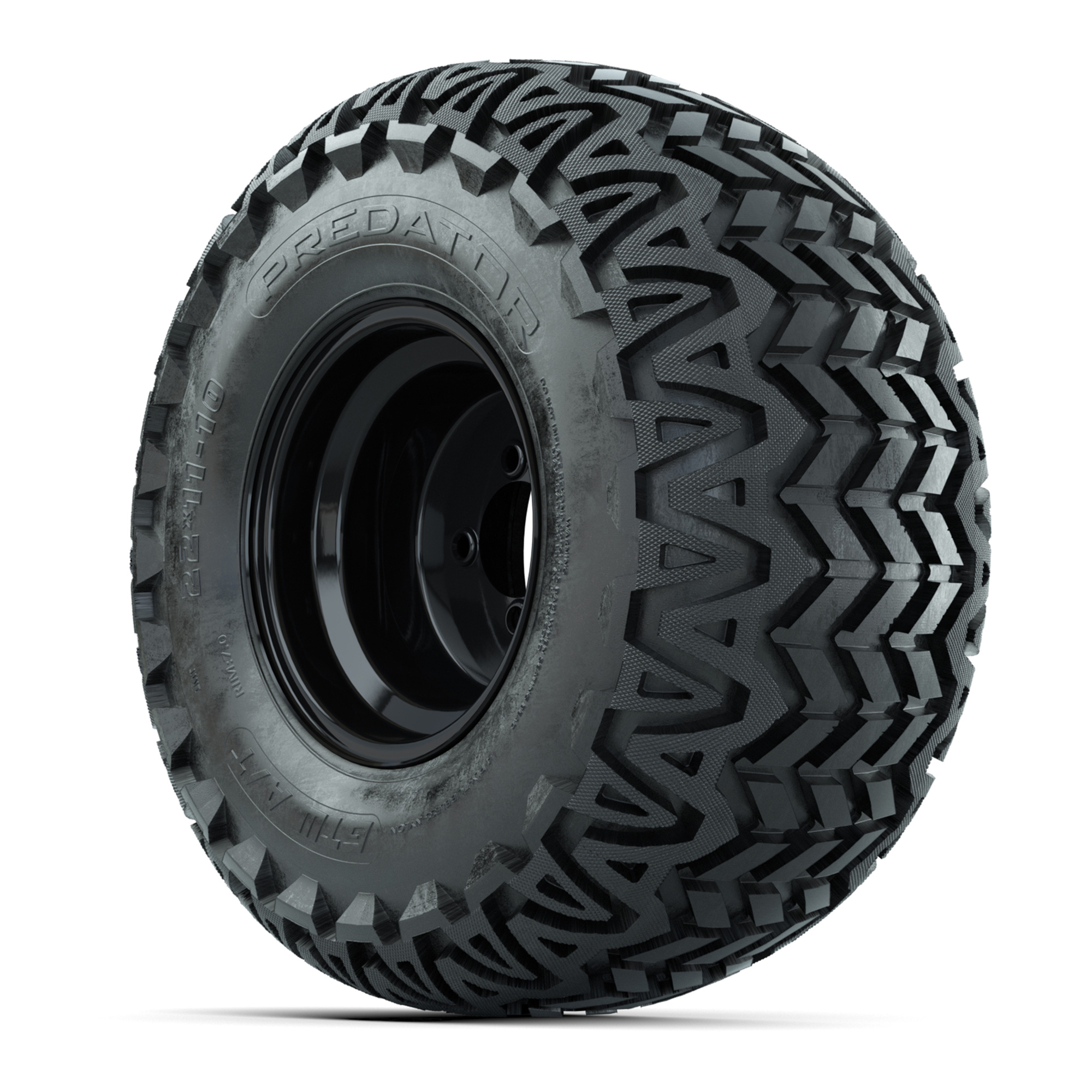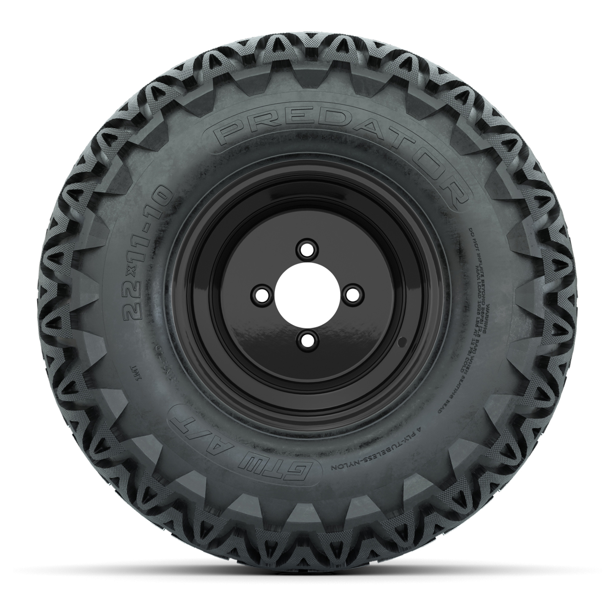 product Set of (4) 10 in Black Steel Offset Wheels with 22x11-10 Predator All Terrain TiresItem # A19-461Tread Classification:All Terrain/Off RoadFull kit includes:(4) 10x7 Black Steel Wheels / Offset: 3:4 (ET -.25)(4) 22x11-10 GTW Predator All Terrain Tires (4-Ply)Reuse Stock Lug NutsPlease Note: All Wheels are 4 on 4 Hole / Lug Pattern unless otherwise specified.Tech Tips:This Tire & Wheel Combo Does Require a Lift Kit (3” minimum)Tire & Wheel Combos are mounted and Inflated Before Shipping, Free of ChargePlease Check and Adjust PSI in Tires Before Operation (Recommended Inflation Can Be Found on Sidewall of Tire)All Wheels Have a lug pattern of "4x101.6mm"Lug Nuts Sold Separately:Standard: #LUG4S (Standard Chrome Lug Nuts) Metric: #LUG4M (Yamaha Models) Find A Dealer