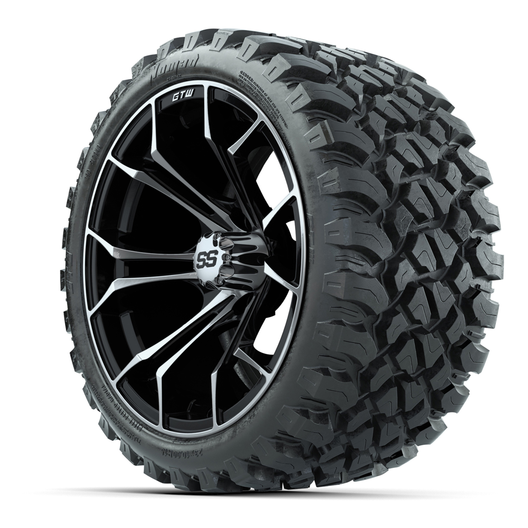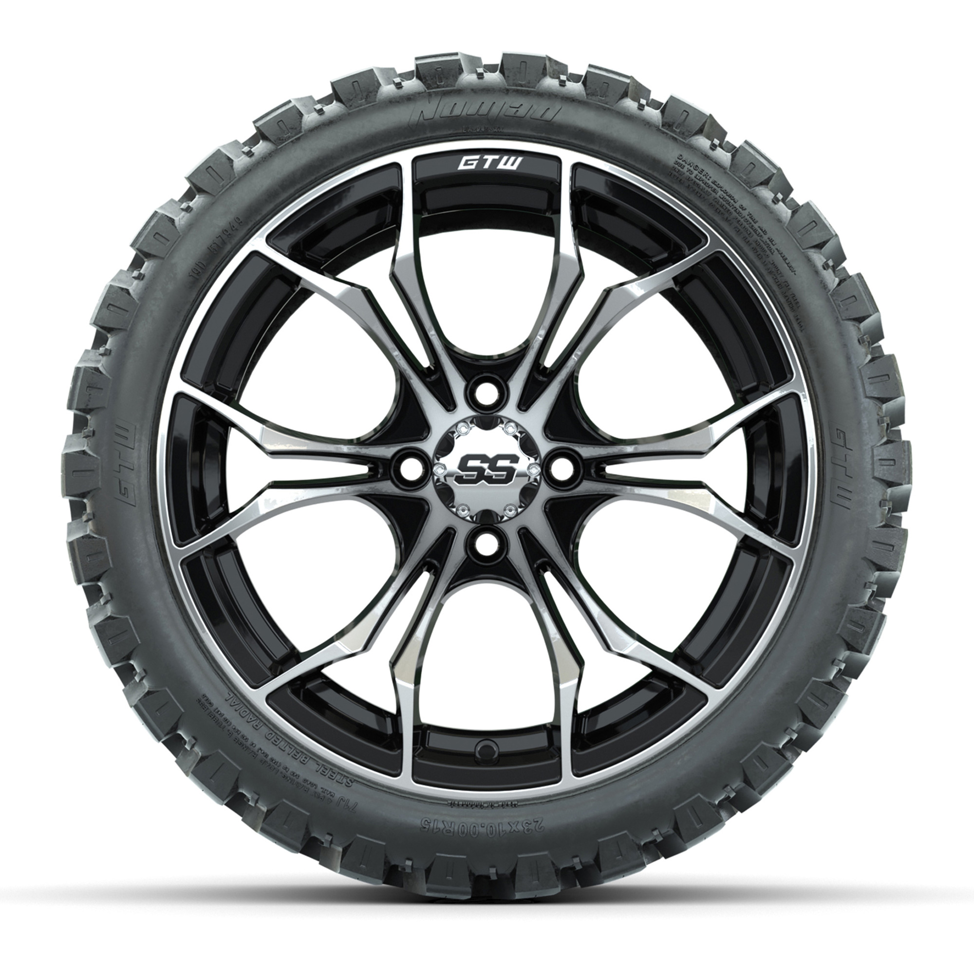 product GTW Spyder Machined/Black 15 in Wheels with 23x10-R15 Nomad All-Terrain Tires – Full SetItem # A19-752Tread Classification:All-Terrain / Off-RoadFull kit includes:(4) 15x7 GTW Spyder Wheels / Machined & Black Finish / Offset: 3:4 (ET -.25)(4) 23x10-R15 GTW Nomad All-Terrain Steel Belted Tires / Tire is approx. 23” tall (4-Ply)(4) Center CapsPlease Note: All Wheels are 4 on 4 Hole / Lug Pattern unless otherwise specified.Tech Tips:This Tire & Wheel Combo Does Require a Lift KitTire & Wheel Combos are mounted and Inflated Before Shipping, Free of ChargePlease Check and Adjust PSI in Tires Before Operation (Recommended Inflation Can Be Found on Sidewall of Tire)All Wheels Have a lug pattern of "4x101.6mm"Lug Nuts Sold Separately:Standard: #LUG4S (Standard Chrome Lug Nuts) Metric: #LUG4M (Yamaha Models) Find A Dealer