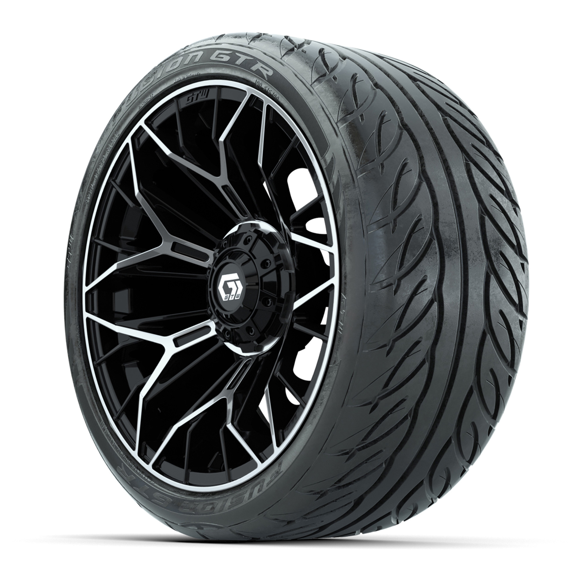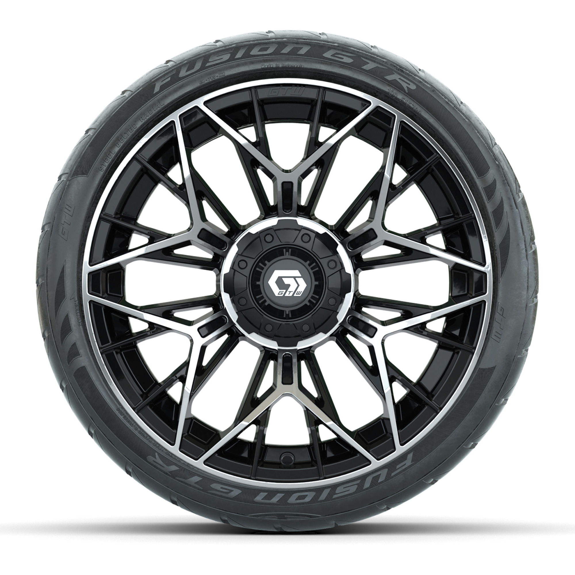 A set of (4) 15-inch GTW® Stellar machined face with black golf cart wheels on 215/40-R15 GTW® Fusion GTR Steel Belted Street Tires