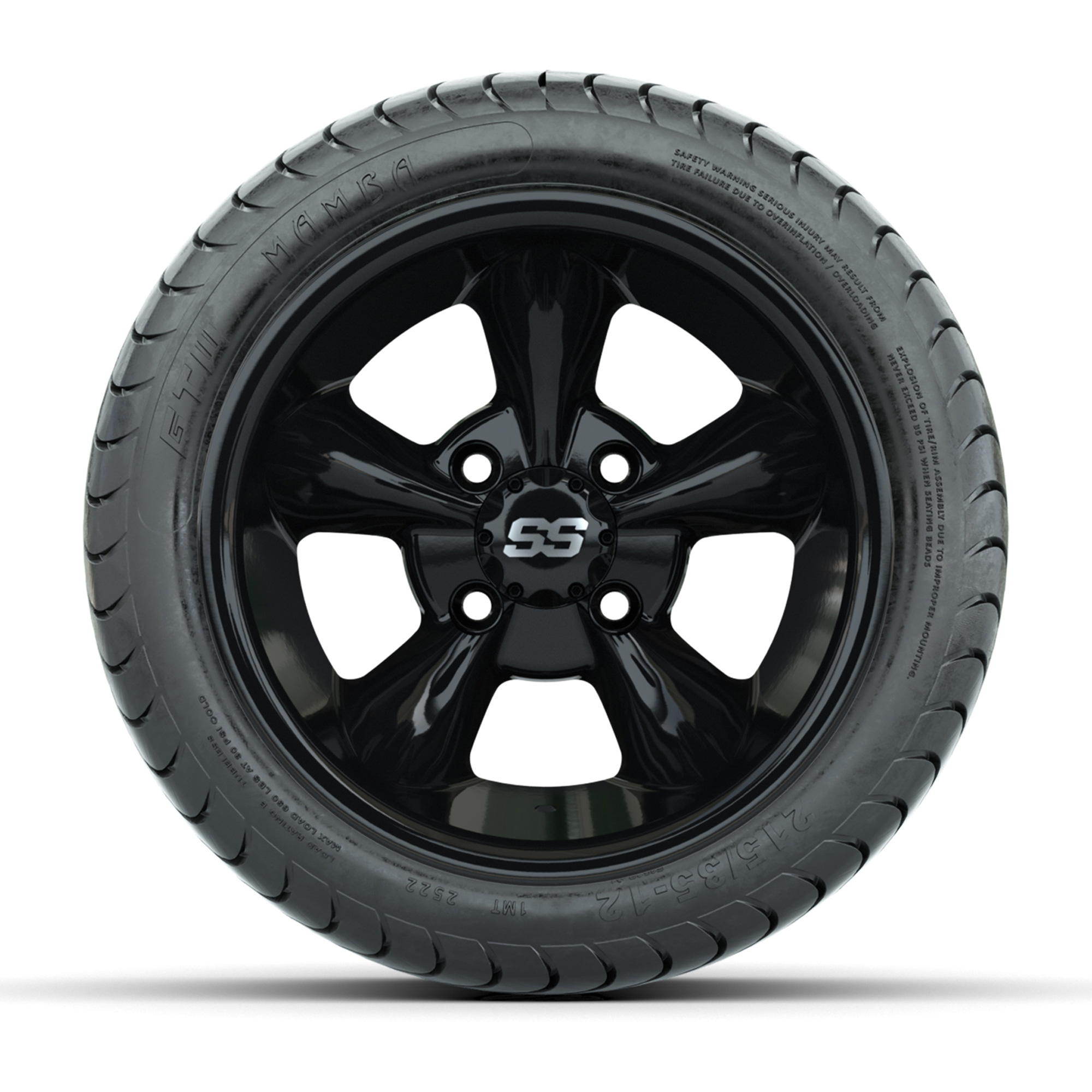 product GTW Godfather Black 12 in Wheels with 215/35-12 Mamba Street Tires – Full SetItem # A19-837A set of (4) 12-inch GTW® Godfather Black golf cart wheels Mounted on 215/35-12 GTW® Mamba Street TiresTread Classification:Course / StreetFull Tire & Wheel Combo Includes:(4) 12x7 GTW® Godfather Wheels / Black finish / Offset: 3:4 (ET -.25)(4) 215/35-12 GTW® Mamba Street Tires / Tire is approx. 18” tall (4-Ply)(4) Center capsPlease Note: All Wheels are 4 on 4 Hole / Lug Pattern unless otherwise specified.Tech Tips:This Tire & Wheel Combo Does Not Require a Lift KitPlease Check and Adjust PSI in Tires Before Operation (Recommended Inflation Can Be Found on Sidewall of Tire)Tire & Wheel Combos are mounted and Inflated Before Shipping, Free of ChargeAll Wheels Have a lug pattern of "4x101.6mm"Lug Nuts Sold Separately:Standard Chrome Lug Nuts #LUG4SMetric Chrome Lug Nuts #LUG4M (Yamaha Models) Find A Dealer