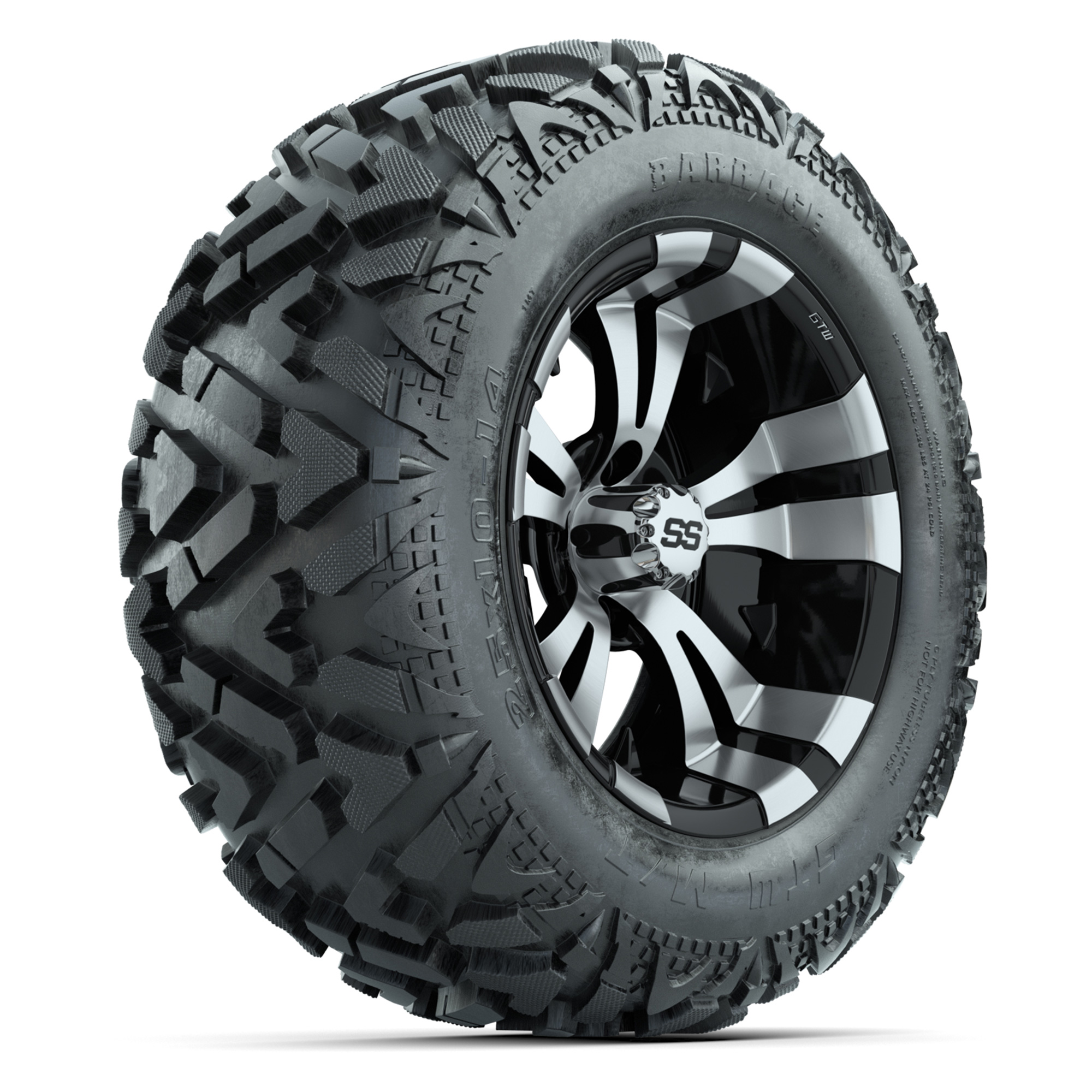 GTW Titan Black/Machined 14 in Wheels with 25x10-14 Barrage Mud Tires – Full Set