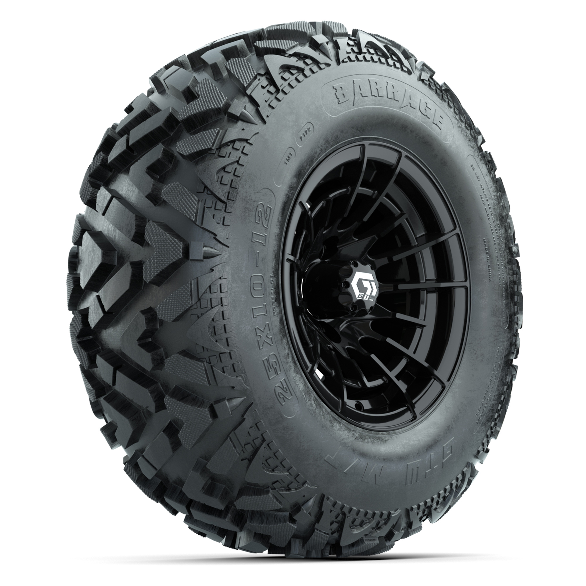 GTW® Boost Gloss Black 12 in Wheels with 25X10-12 Barrage Mud Tires – Full Set