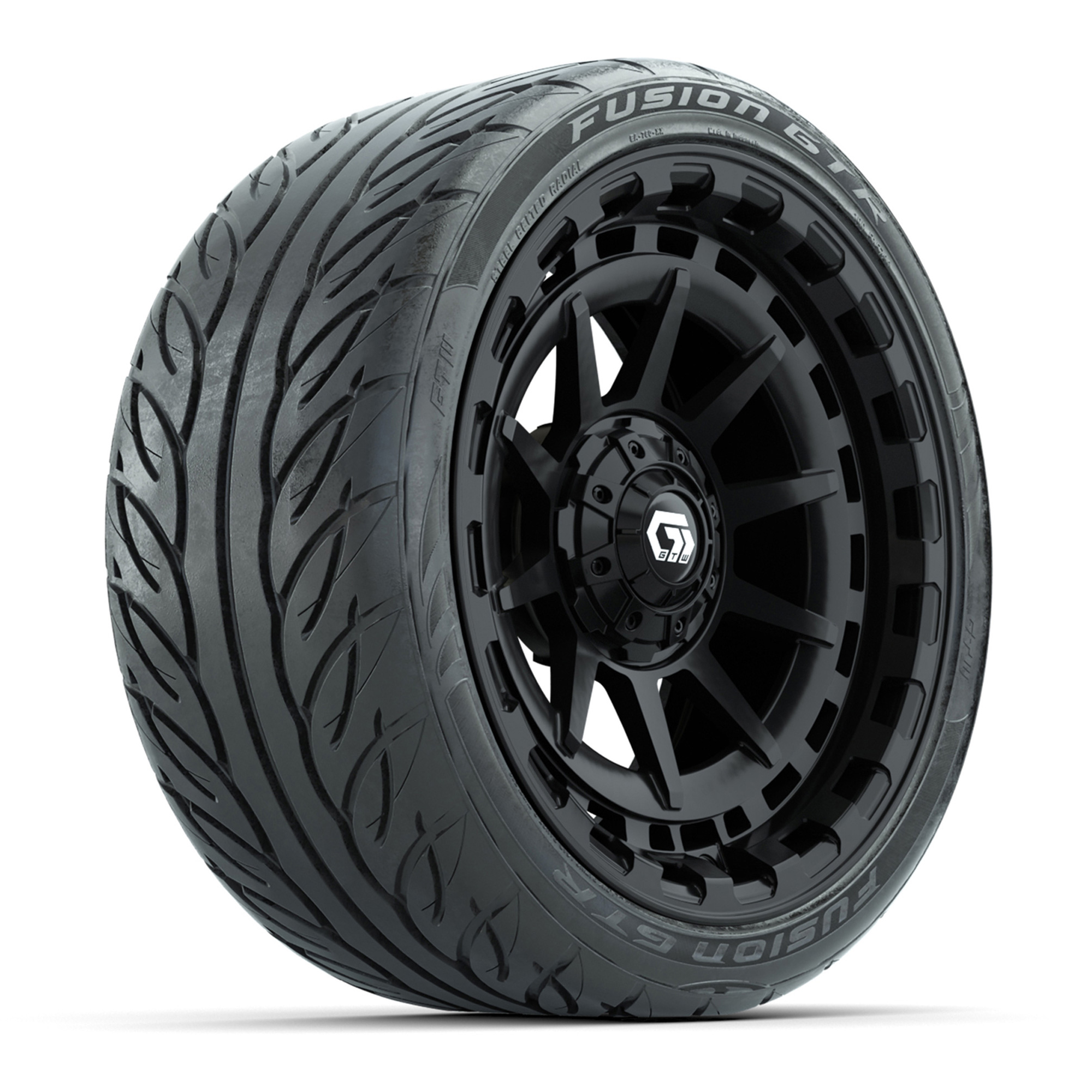 GTW® Barricade Gloss Black 15 in Wheels with 215/40-R15 Fusion GTR Steel Belted Street Tires – Full Set